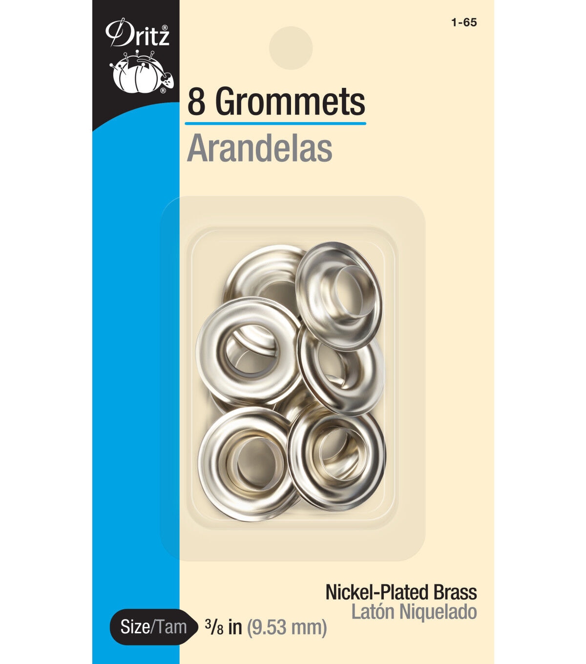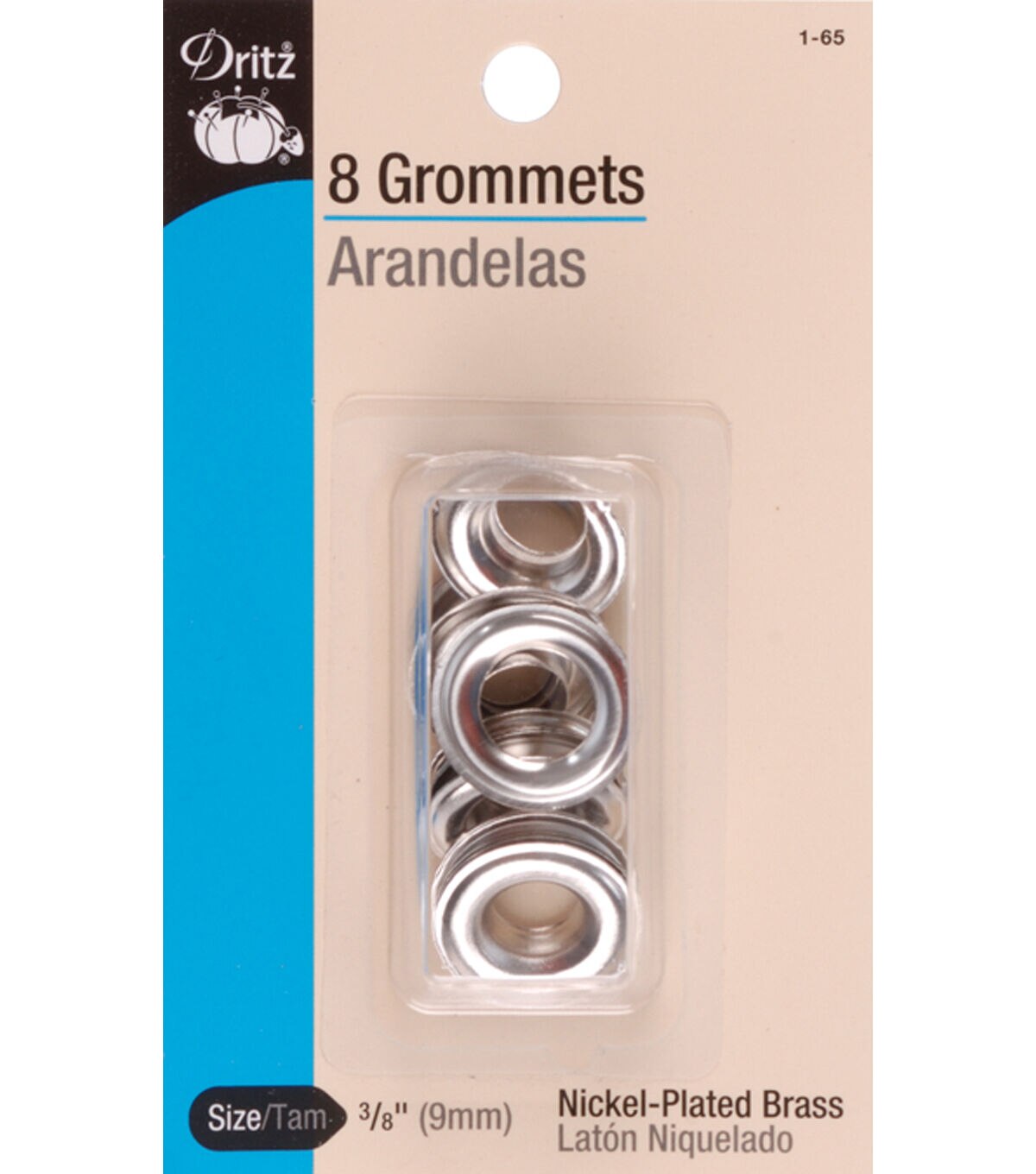 Use the Dritz Grommets 3/8'' Pack of 8 for a number of home decor and craft projects. This pack contains eight 3/8-inch rust-proof and machine-washable metal grommets. They are perfect for attaching to tents, shower curtains, backpacks and duffel bags for smooth movement and to prevent fabrics from framing. You can also use this grommet pack to make bead strings or to embellish leather or fabric. These multipurpose metal grommets work best with the Dritz Grommet Plier Kit. Available in many attractive finishes, each sold separately.