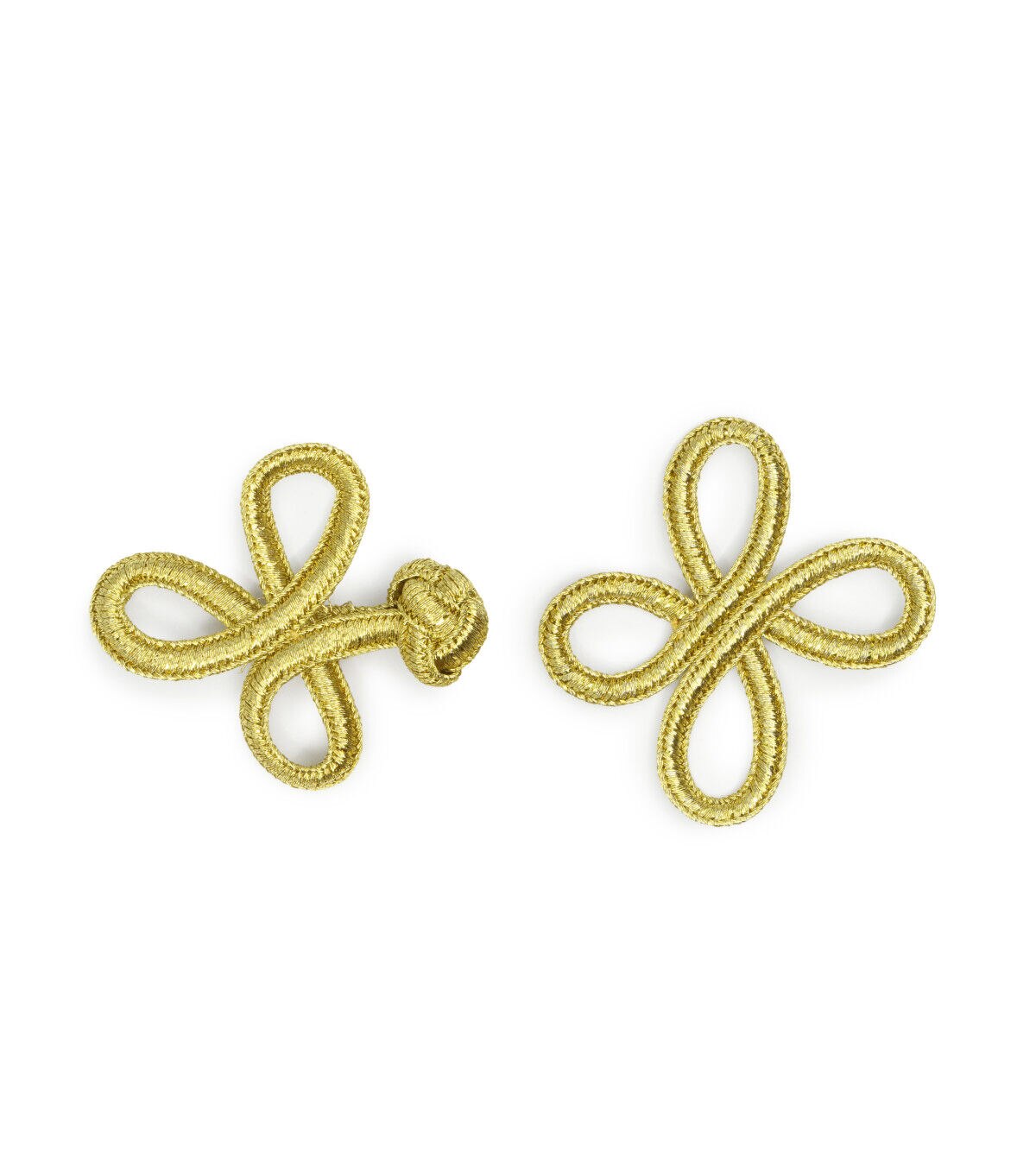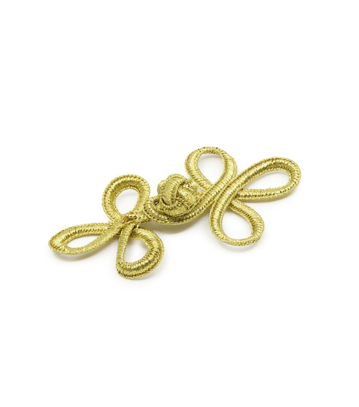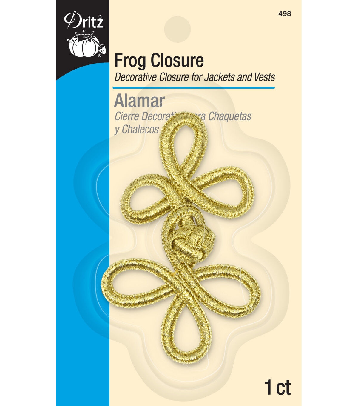 Take your jacket and vest designs up a notch with the Dritz 3 Loop Frog Closure - Gold. This pack includes a 3-inch frog closure that flaunts a gold tone. It is made of nylon and is machine washable. You can hand-stitch it onto any garment of your choice to give it a decorative upgrade.