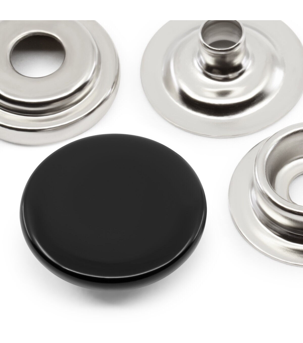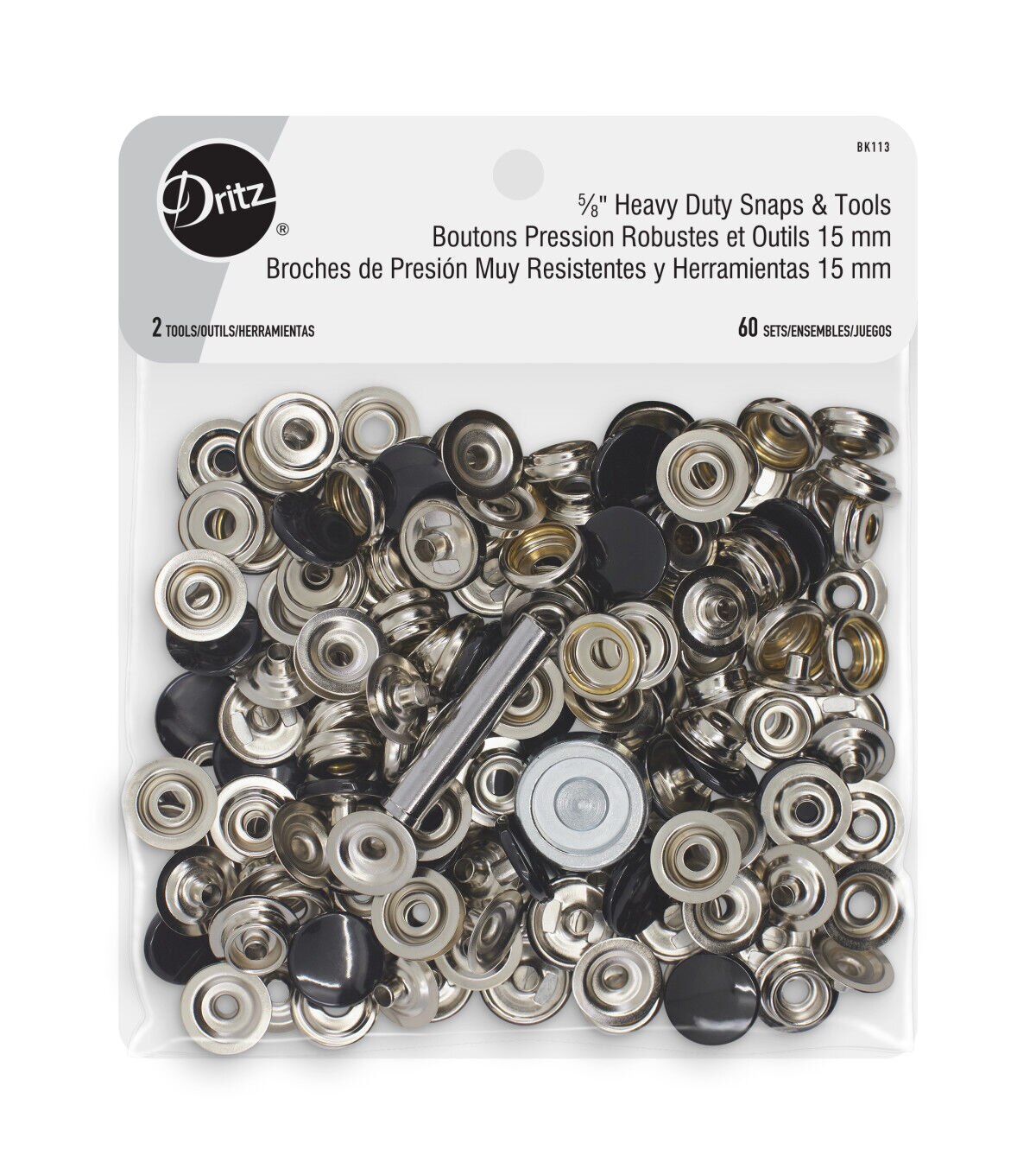 The Dritz Heavy-duty Snap & Tool Set - Black & Silver will make the ideal fasteners for sportswear, coats, jackets, vests and tops. To create a reversible garment application, simply substitute the cap and the post on the reverse side. These snaps can also be used for making accessories such as bags, totes, belts, wallets and device cases or in DIY sewing and repair projects. They are great for repairing and replacing fasteners on utility items such as boating covers, tents and camping gear. Team them with other Dritz hardware such as swivel hooks, D-rings and slide adjusters. Use the included hand tools to easily apply them. This pack contains 60 sets of heavy-duty snap sets, each set includes a cap, socket, post and stud, and hand tools for application.
