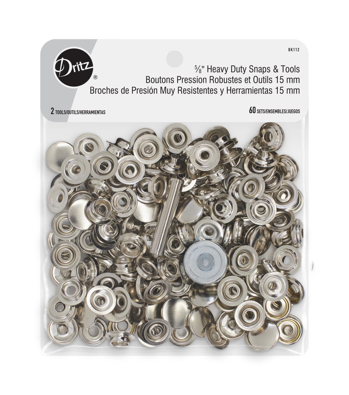 The Dritz Heavy-duty Snap & Tool Set - Nickel will make the ideal fasteners for sportswear, coats, jackets, vests and tops. To create a reversible garment application, simply substitute the cap and the post on the reverse side. These snaps can also be used for making accessories such as bags, totes, belts, wallets and device cases or in DIY sewing and repair projects. They are great for repairing and replacing fasteners on utility items such as boating covers, tents and camping gear. Team them with other Dritz hardware such as swivel hooks, D-rings and slide adjusters. Use the included hand tools to easily apply them. This pack contains 60 sets of heavy-duty snap sets, each set includes a cap, socket, post and stud, and hand tools for application.