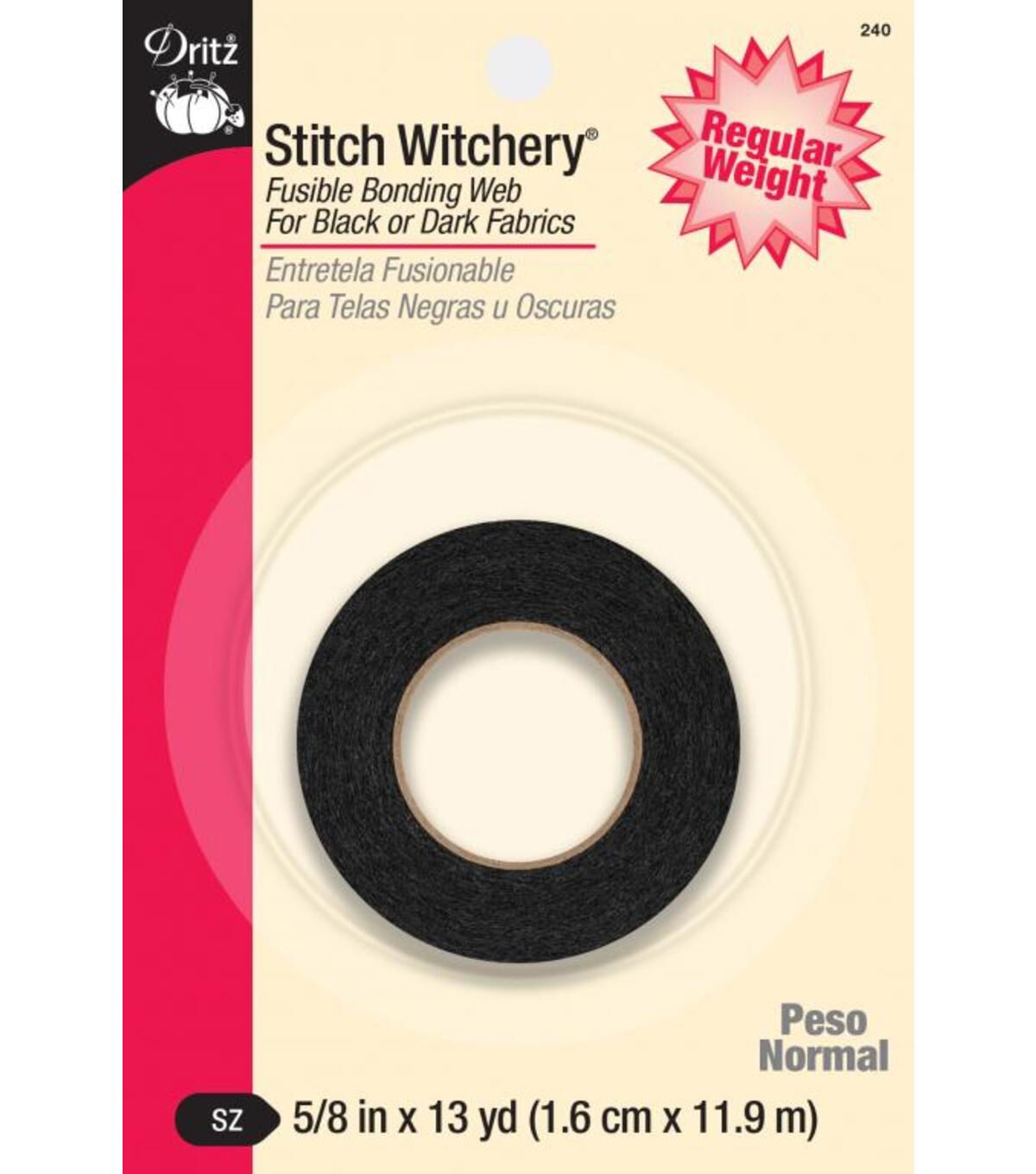 Create seamless hems, trims or even belts using the Dritz Stitch Witchery Regular Weight Fusible Bonding Web - Black. This pack comes with 13 yards of 0.63-inch regular-weight fusible bonding web. You can use it to easily bond two layers of black-hued fabrics by simply steam ironing them together. It is washable, dry cleanable and easy to maintain.