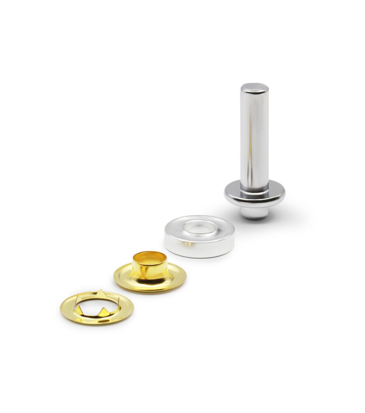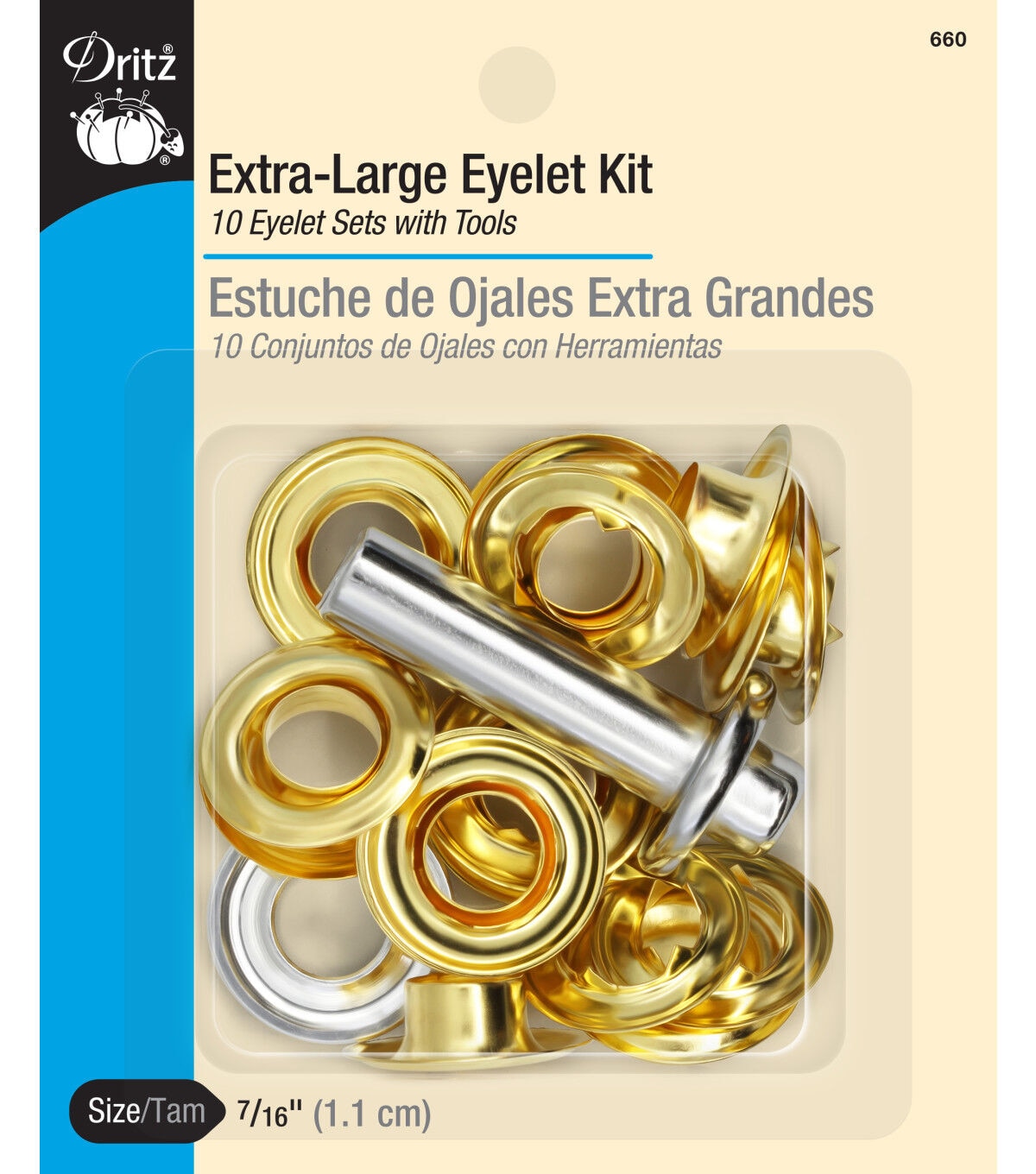 Use the Dritz Extra Large Brass Eyelet Kit to create secure eyelets in fabrics. This complete brass eyelet kit comes with 0.43-inch eyelets that let you work with up to three layers of medium-weight fabrics and two layers of heavy-weight fabrics. It contains everything you need for your project including a setter, anvil and 10 nickel-plated washers and eyelets. Available in brass and zinc finishes.