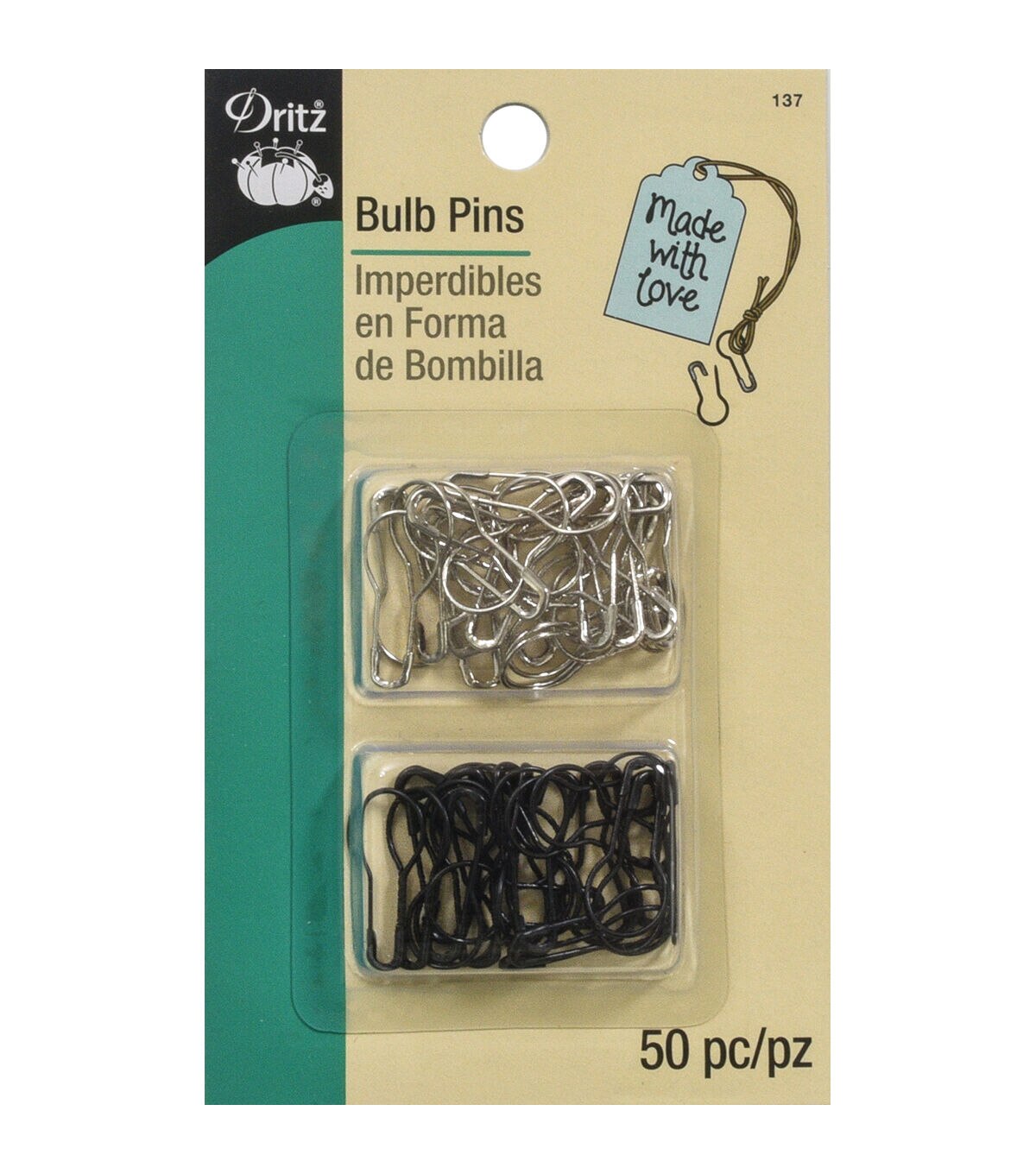 Use the Dritz Bulb Pins to hang tags on apparel or as stitch markers for your knitting and crochet projects. These pins are made from premium-quality nickel-plated brass and are designed with bulb-shaped ends. This pack contains 25 pins sporting a silver tone and 25 pins in a black hue.