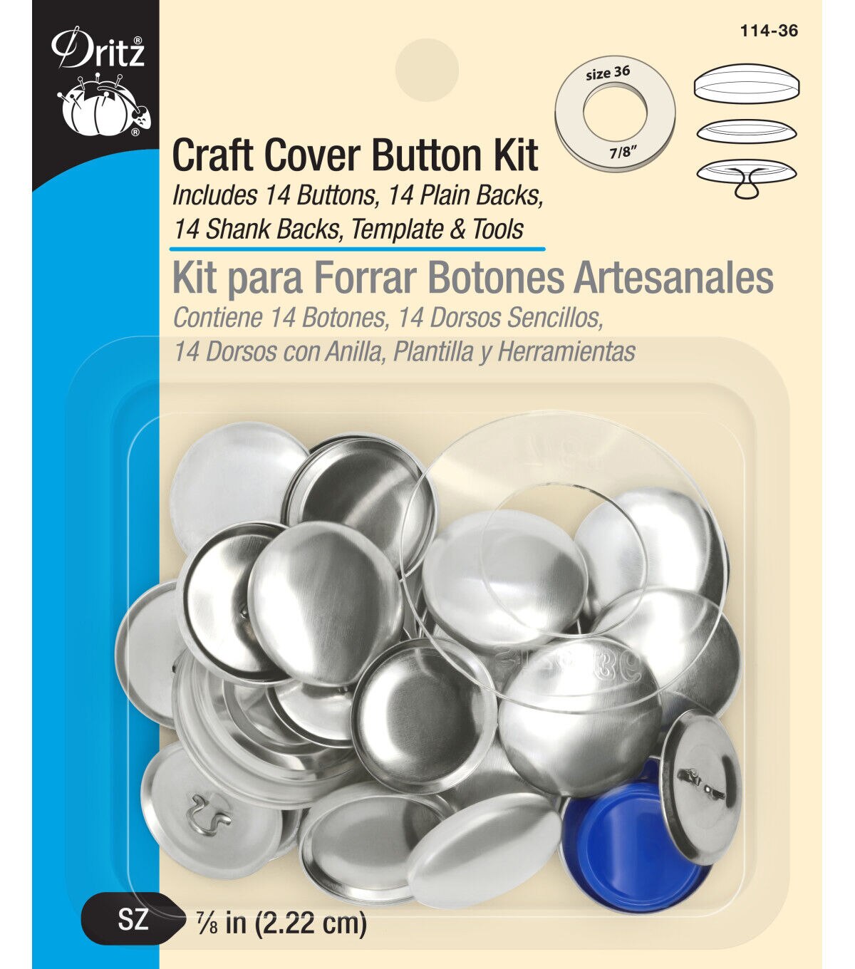 - Includes 14 buttons, 14 plain backs, 14 shank backs, template and tools