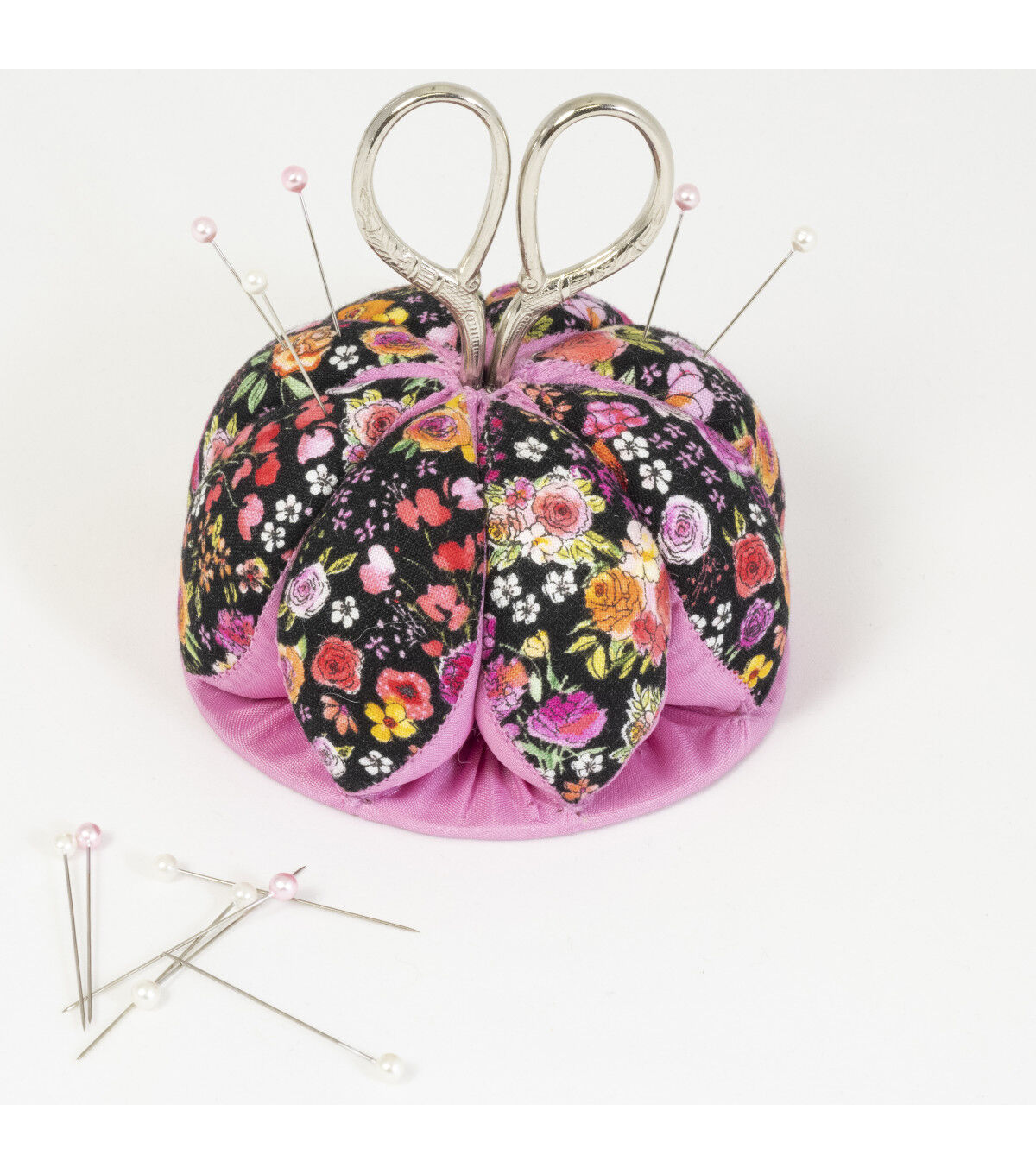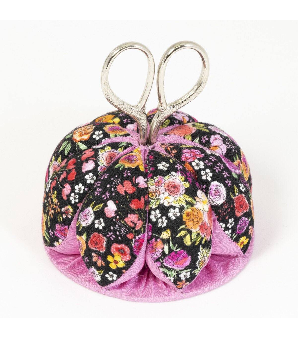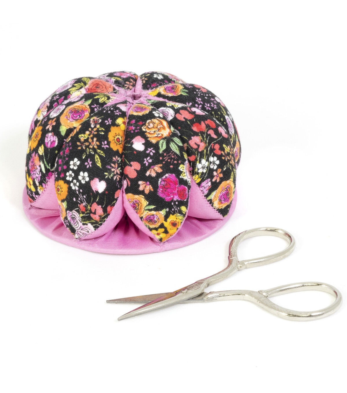 A pretty pin cushion is a welcome sewing companion! This Dritz floral print pin cushion has petal shaped sections that circle around scissors keeping them close by to snip threads as you go!