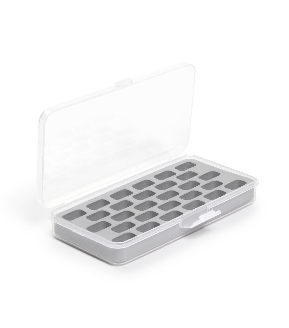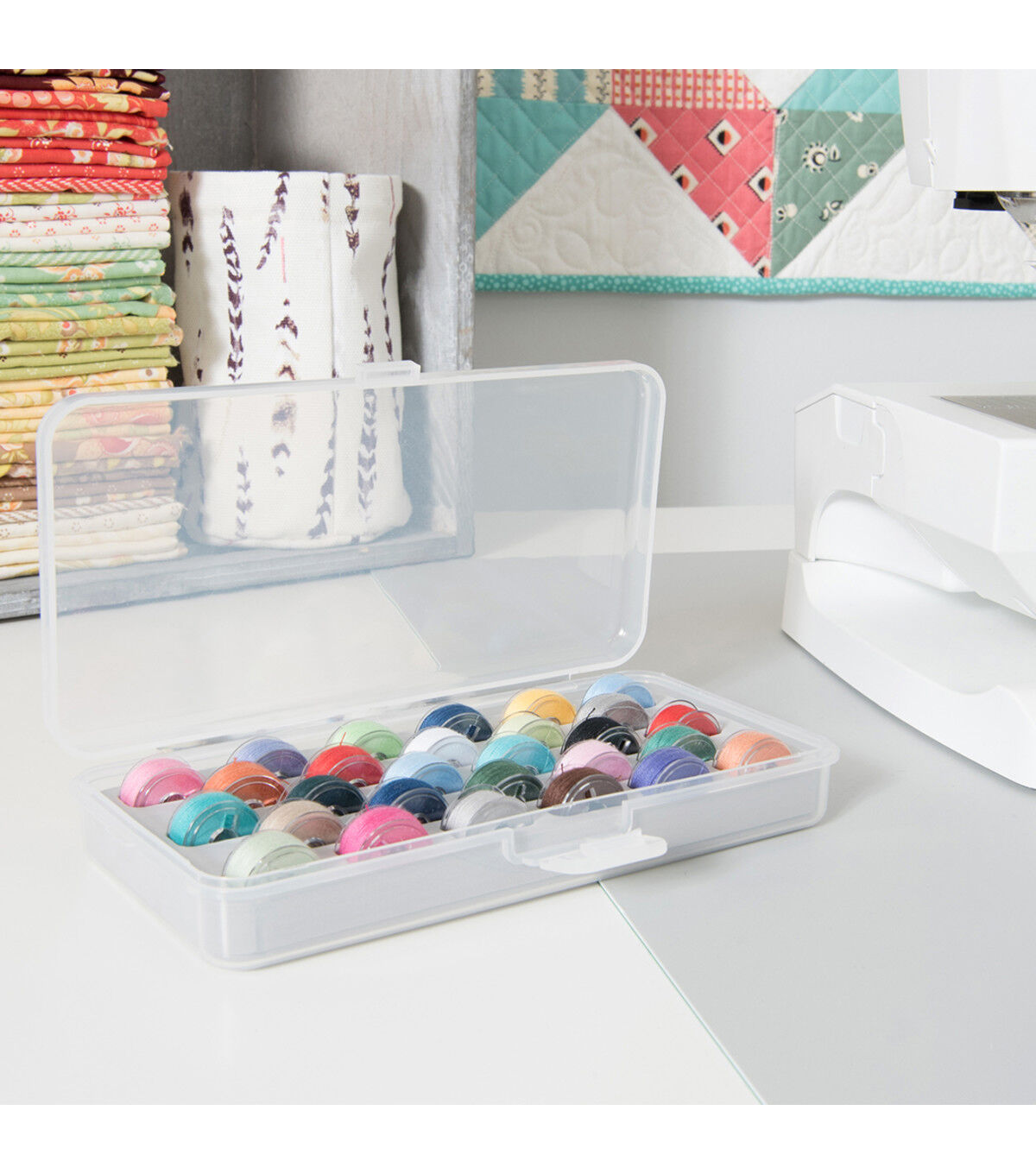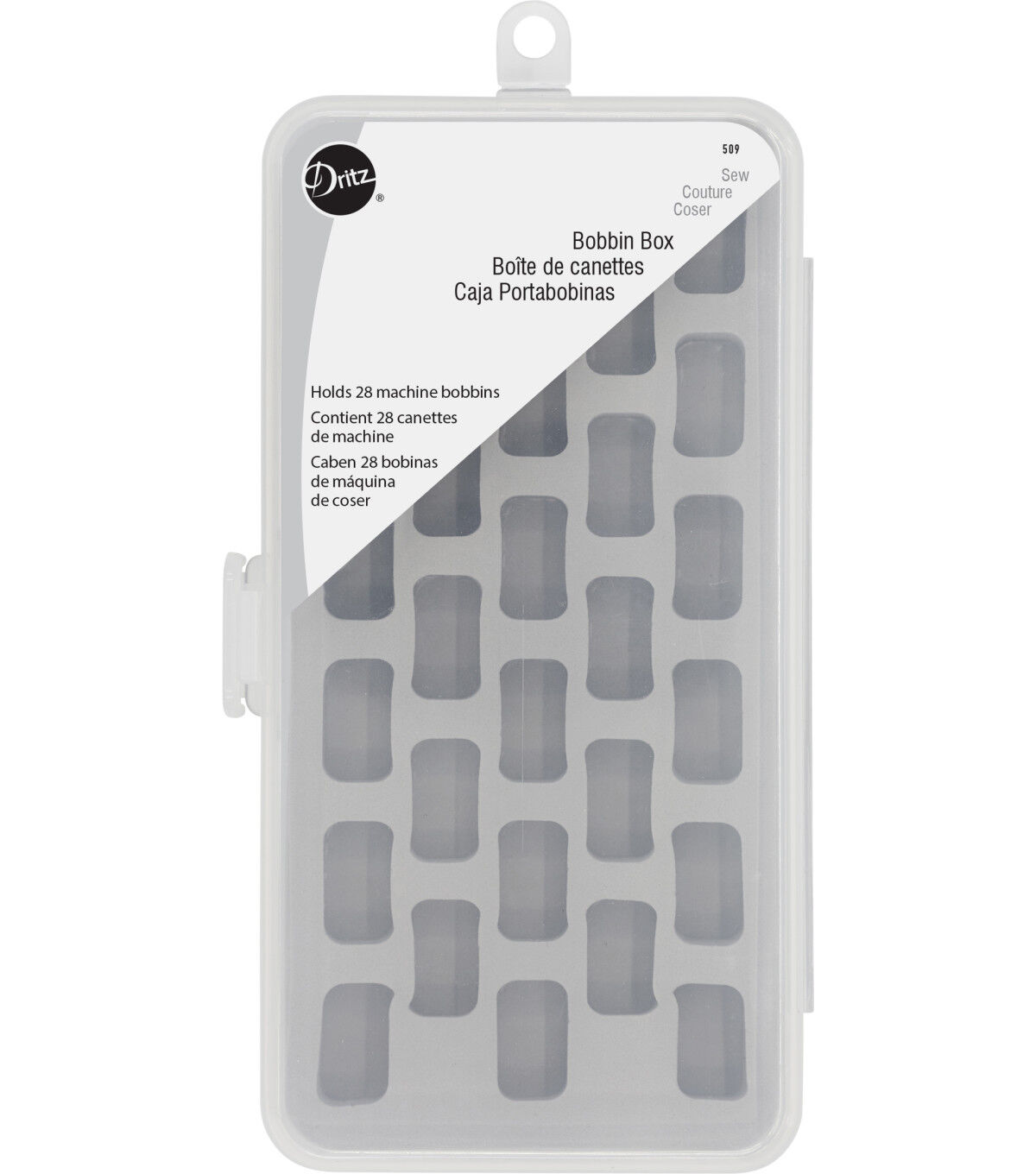 Keep bobbins neatly organized in the Dritz Plastic Bobbin Box with Latched Lid. This transparent container is constructed from lightweight plastic and can accommodate up to 28 bobbins. The compartmental design of the box prevents bobbins from tangling and helps you view your entire collection at a glance. The bobbin box is designed with a convenient latch and hinged lid for swift opening and closing.
