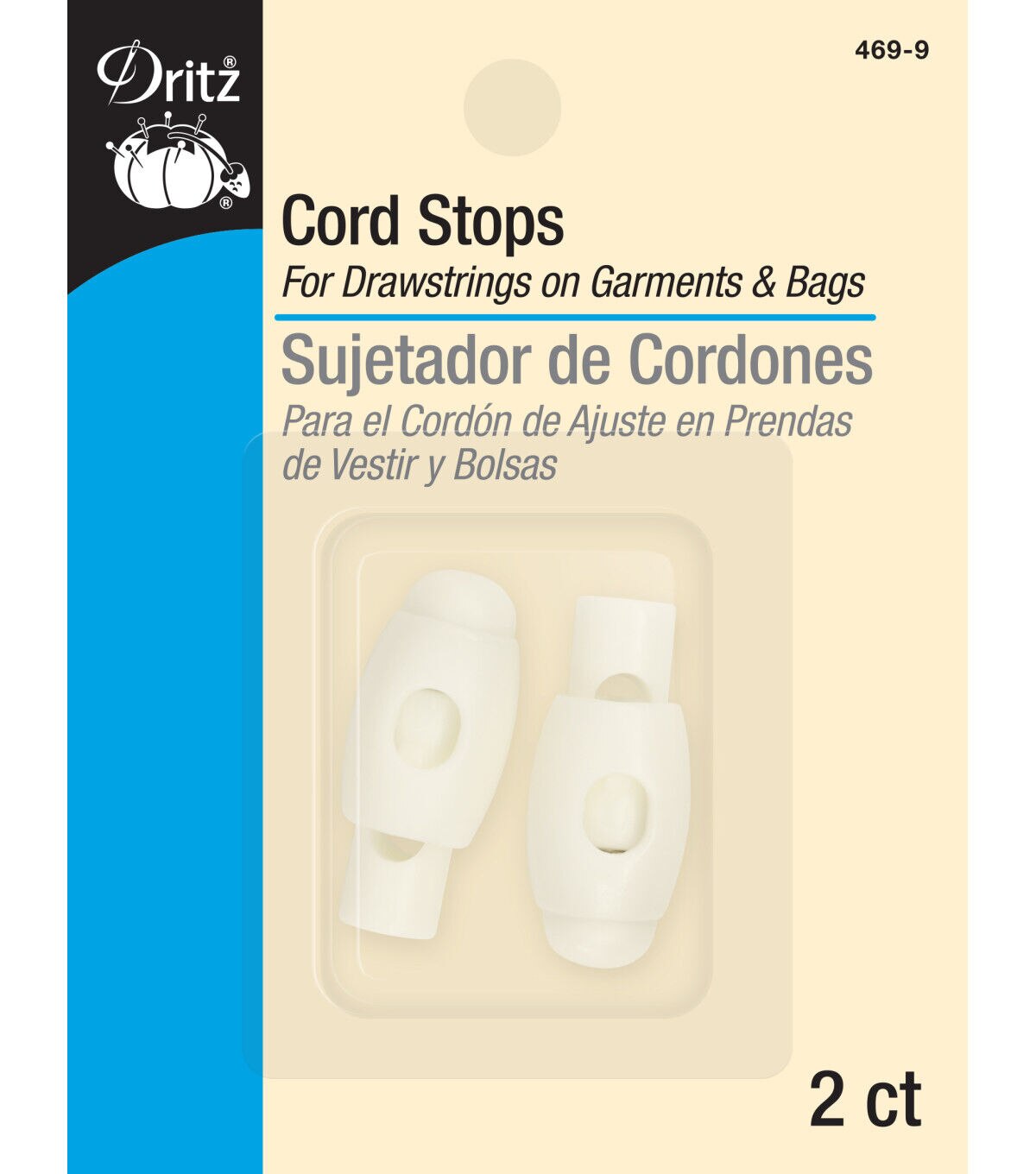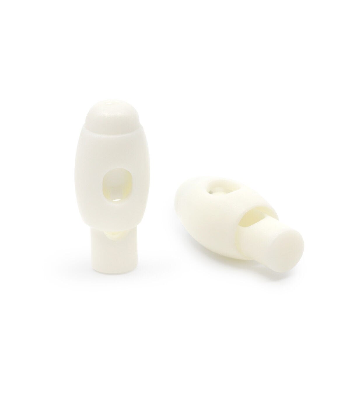 The Dritz Cord Stops - White are perfect for use on clothes and bags. This pack contains two 1.25-inch cord stops sporting a white shade. These cords block the ends of draw cords and prevent them from slipping into the casing. You can use these cords on sweaters, jackets, coats, jogging suits, tote bags and more. They are designed to meet your tailoring needs and are convenient to use and care for.