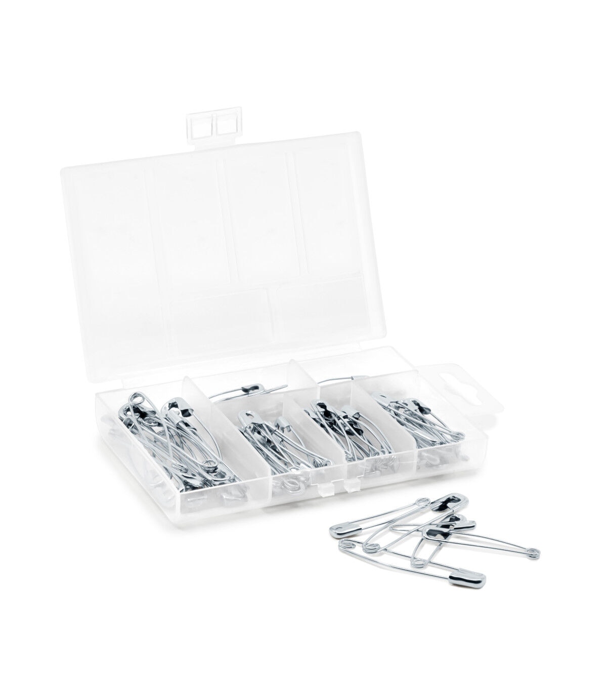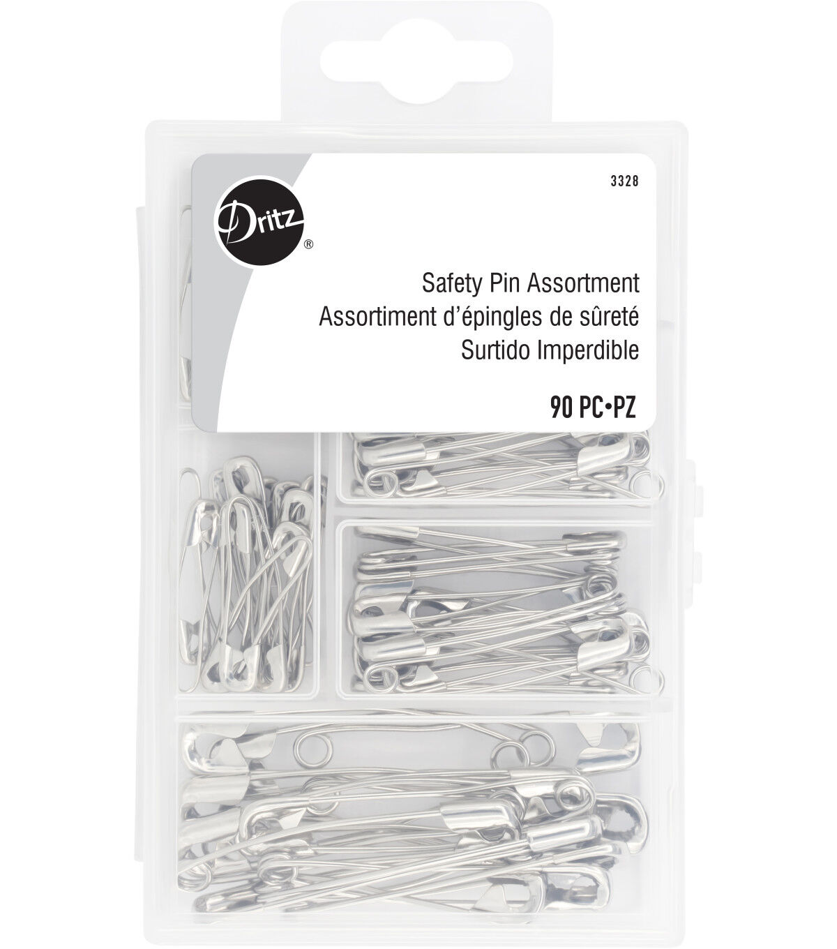 Add the Dritz Assorted Curved Safety Pins to your quilting supplies. Curved safety pins in assorted sizes and size 1 coil-less pins come in a reusable plastic container in this pack. The curved pins are easier to insert into multiple layers of quilting fabric.