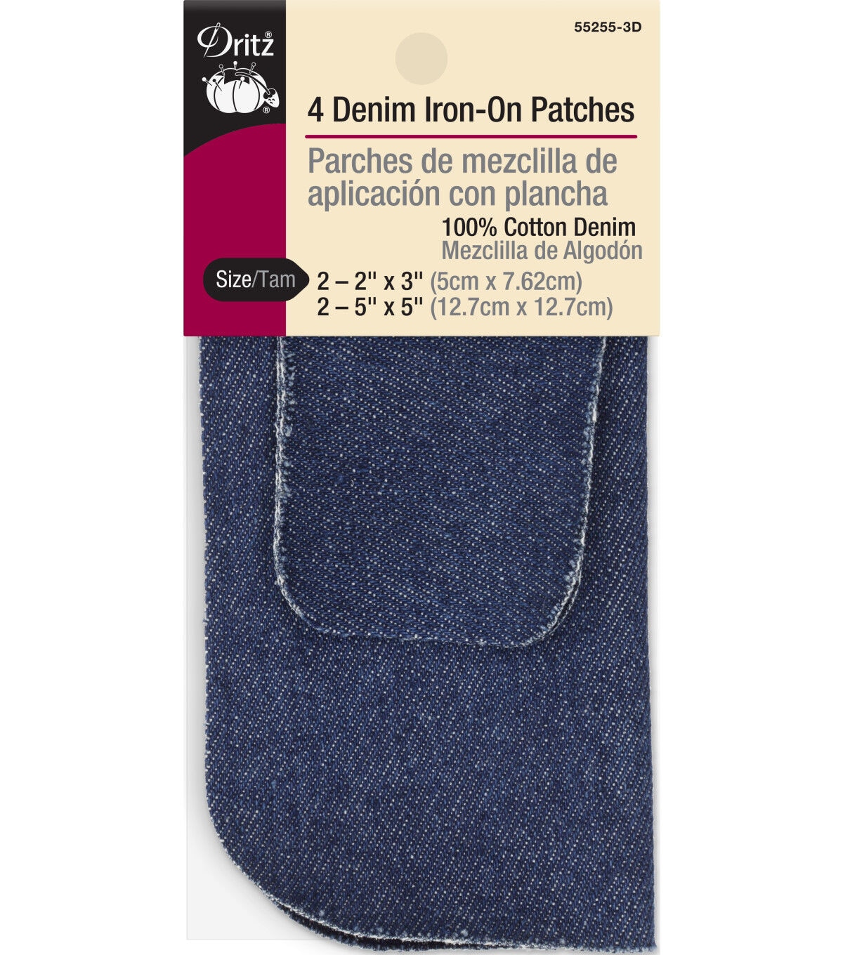 Use the Dritz Assorted Denim Iron-on Patches - Dark Blue to repair holes or mend torn clothes. This pack contains four denim patches, with two of them measuring 2 x 3 inches and the other two 5 x 5 inches, that can be ironed on your fabrics. You can cut these dark blue-hued patches to your desired sizes and shapes and use them for reinforcement and decorative applications.