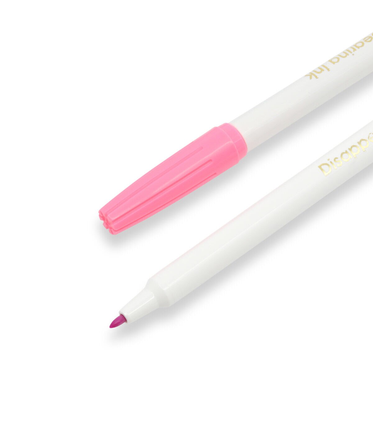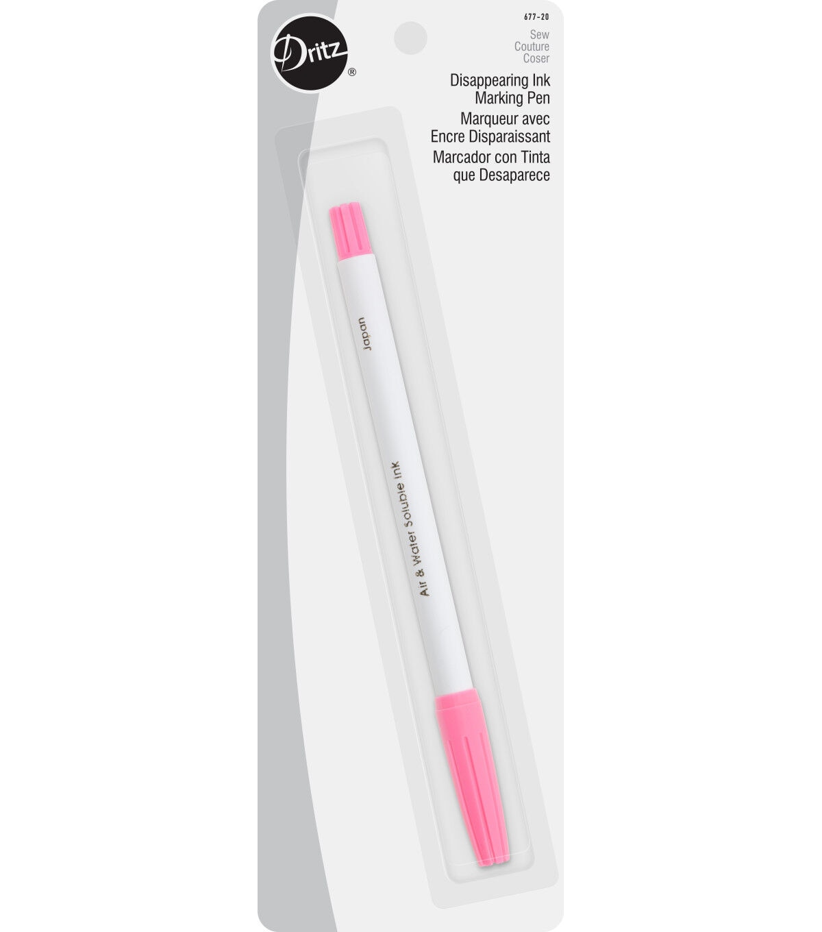 Transfer patterns or designs onto washable fabrics in your quilting and sewing projects using the Dritz Disappearing Ink Marking Pen - Pink. The ink in this marking pen disappears between 24 to 72 hours. Remove marks with a clean damp cloth. This pack includes one marking pen in a pink shade.
