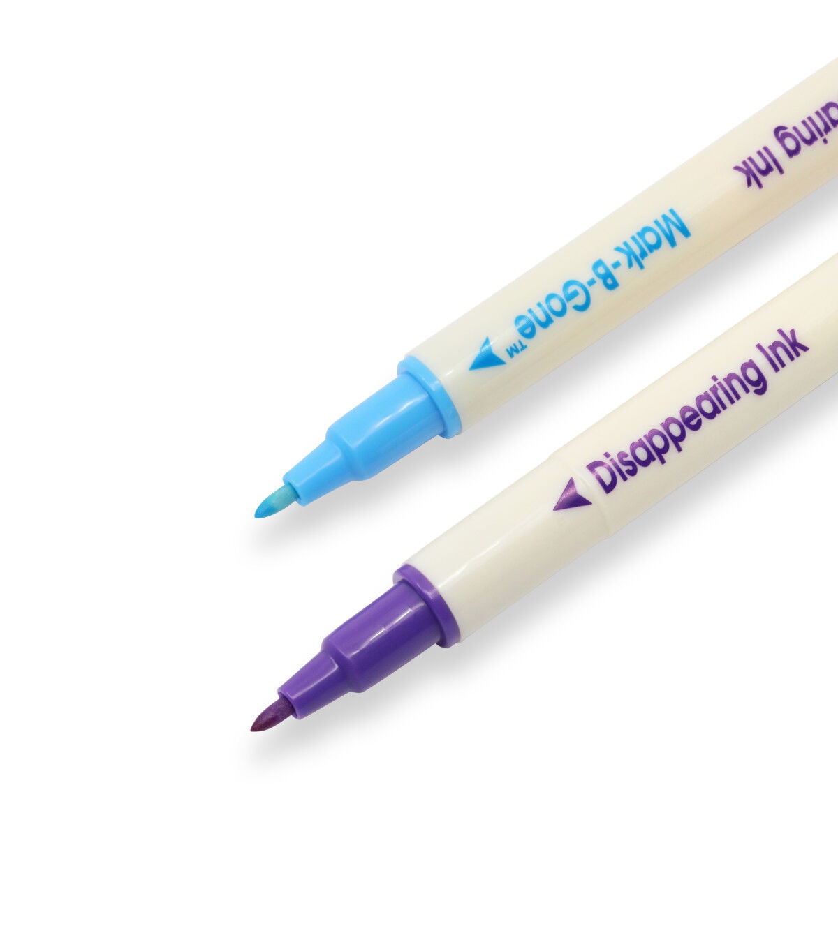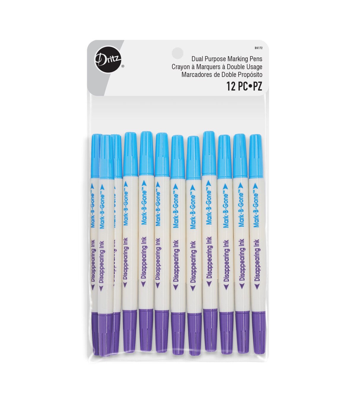 Use Dritz Mark-B-Gone Dual Purpose Disappearing Ink Twin Marking Pens to complete your sewing and crafting projects with ease. This pack contains 12 marking pens that are designed with a blue Mark-B-Gone pen on one end and a purple disappearing ink pen on the other. Use this pen to transfer pattern markings, needlecraft, quilting designs and more. The blue ink wipes off with a damp cloth while the purple ink is air and water-soluble.