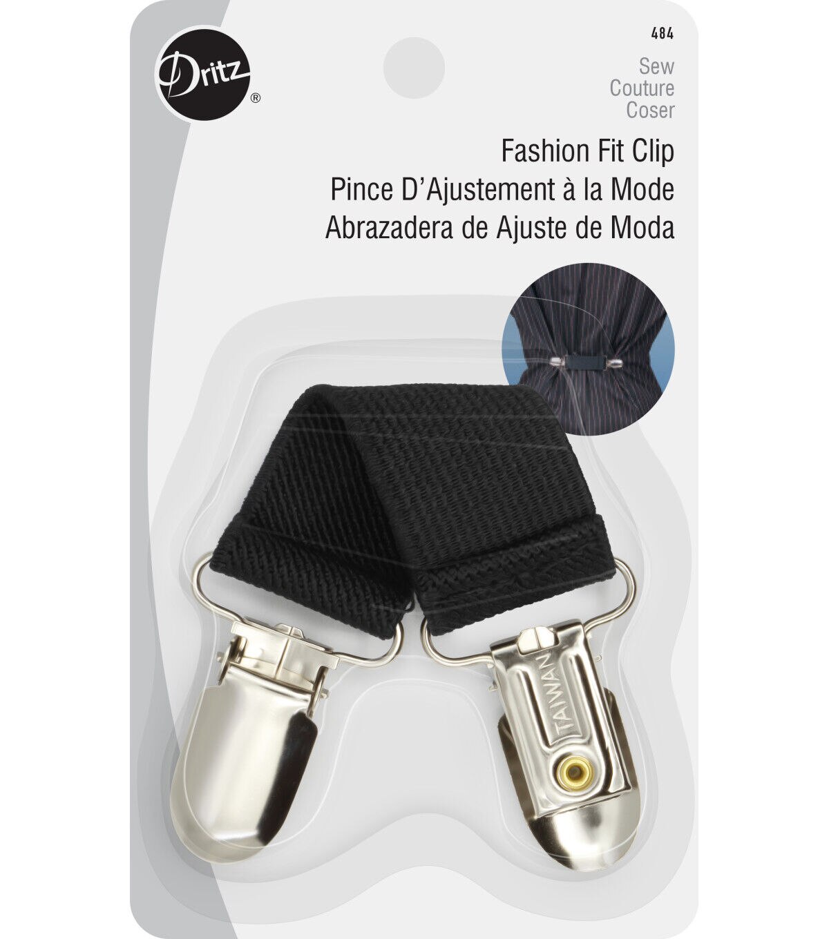 Adjust the fit of your garments with the Dritz Fashion Fit Clip - Black & Silver. This pack includes a fit clip made with metal ends designed with plastic teeth and stretch elastic. It is easy to use and requires no sewing. You can simply clip it onto your dresses, shirts or jackets or use it to personalize apparel along with embellishments.