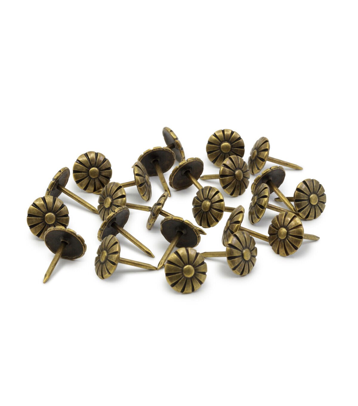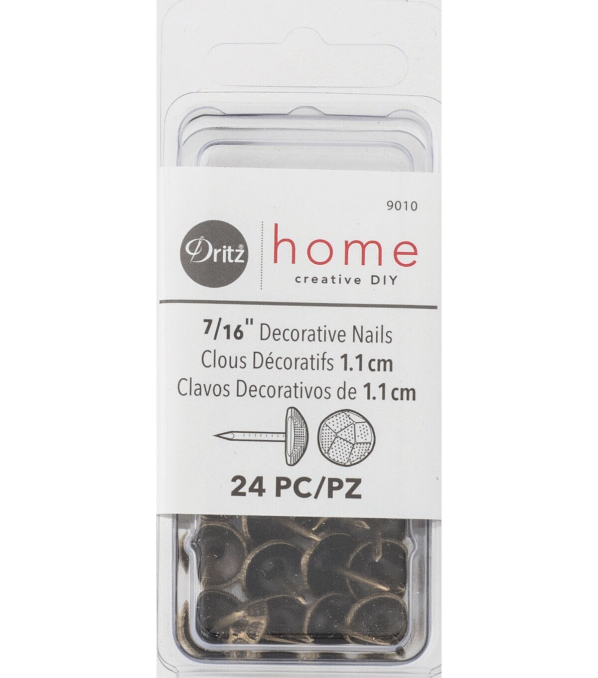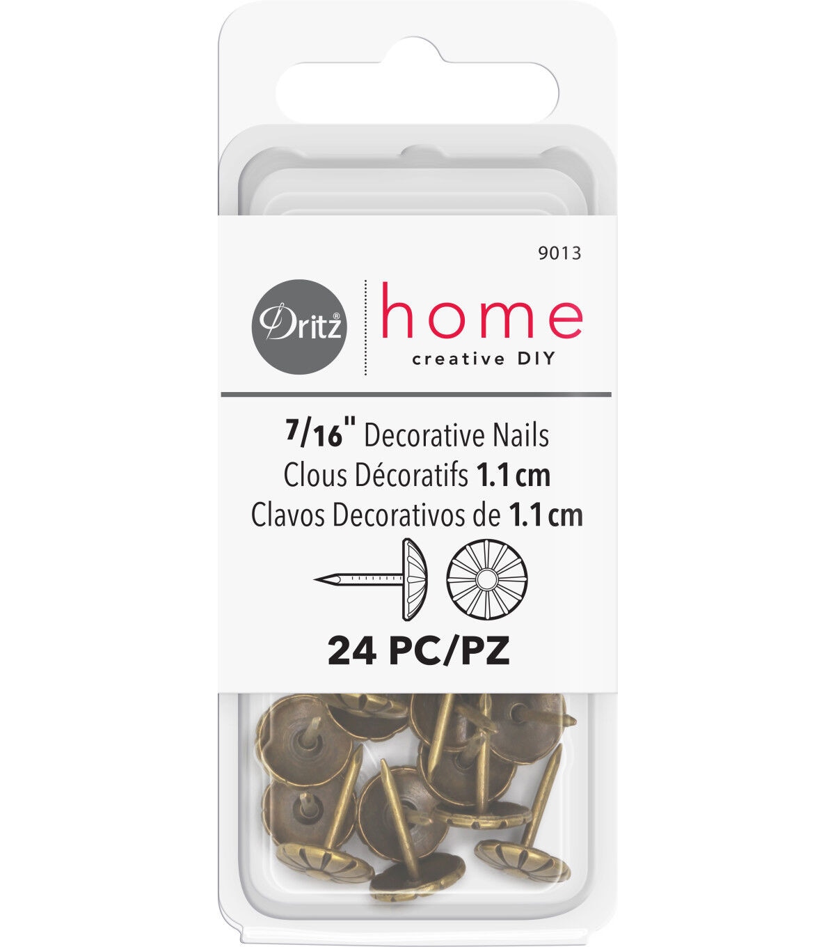 Design stunning couches, chairs, ottomans or sofas with the Dritz Home Decorative Nails. This pack contains 24 decorative upholstery nails that measure 0.44 inches. They are designed with smooth heads for trimming, covering tacks and securing fabrics. Use these sturdy decorative nails to reupholster furniture and for other home decor requirements. These nails are available in a variety of colors and finishes, each sold separately.