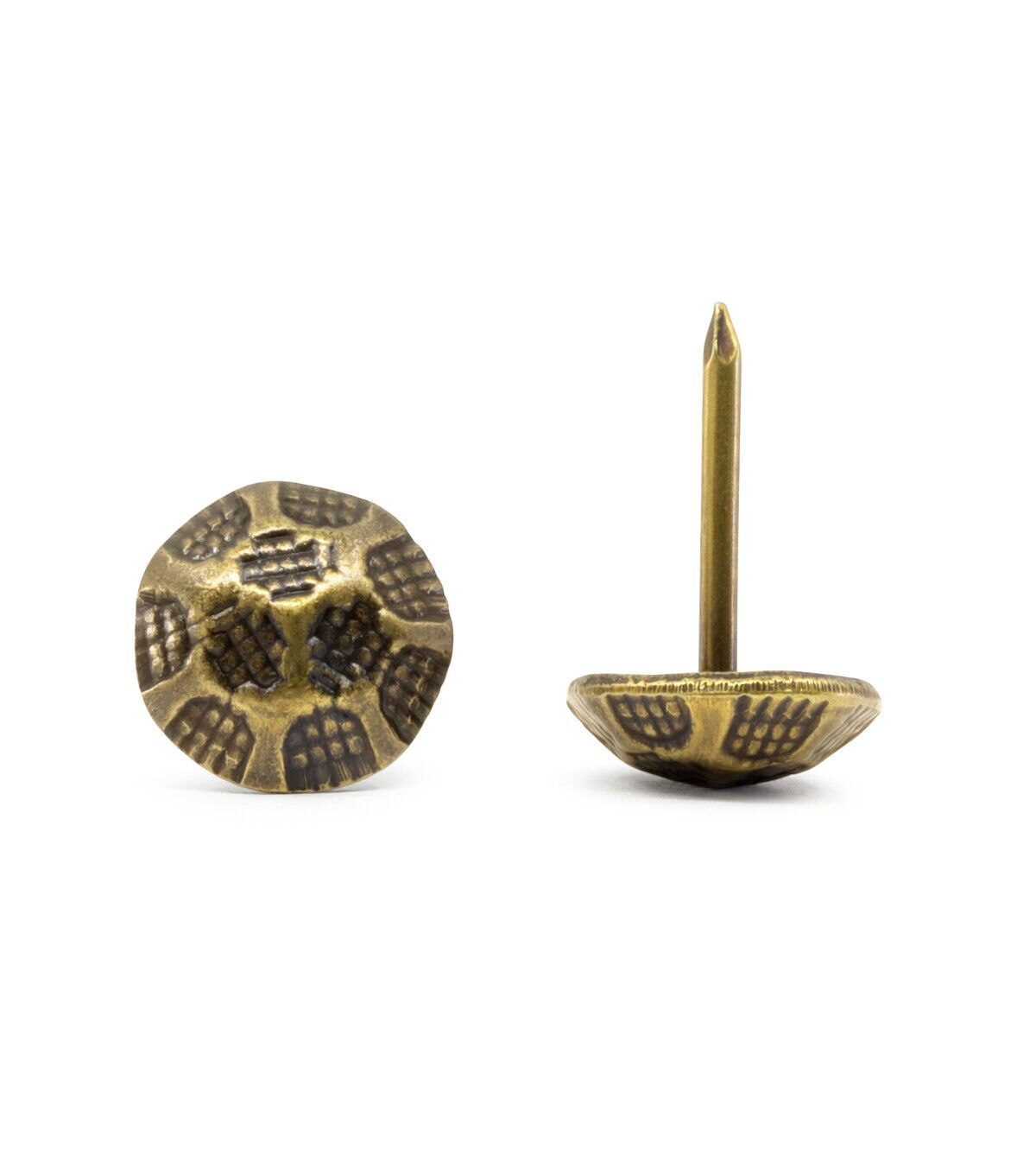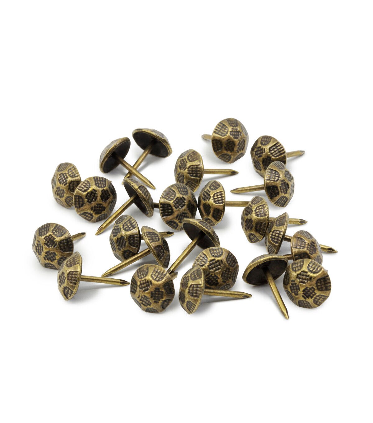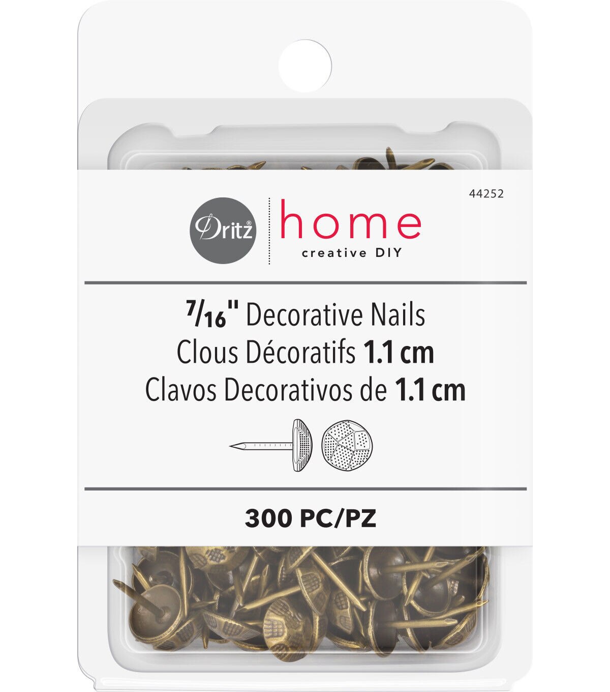 The Dritz Home Textured Decorative Nails - Antique Brass are ideal for large projects and DIY upholstery and craft enthusiasts. This pack includes 300 decorative nails sporting an antique brass-toned finish. These nails are designed with 0.44-inch wide nail heads sporting a hammered finish. They come in a re-closable storage container resembling a clamshell.