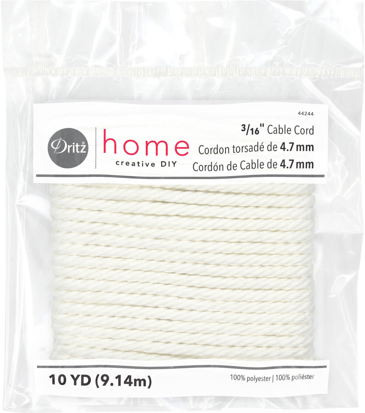 The Dritz Home Polyester Cable Cord - White is an essential item to have in your home tool kit. Made of 100% polyester, it can be used as cording in outdoor gear, sportswear and upholstery. This cable cord is sturdy and can also be used to repair wear and tear in home decor items. It is machine washable and dry cleanable. Ten yards of 0.19-inch cable cord is included in this pack.