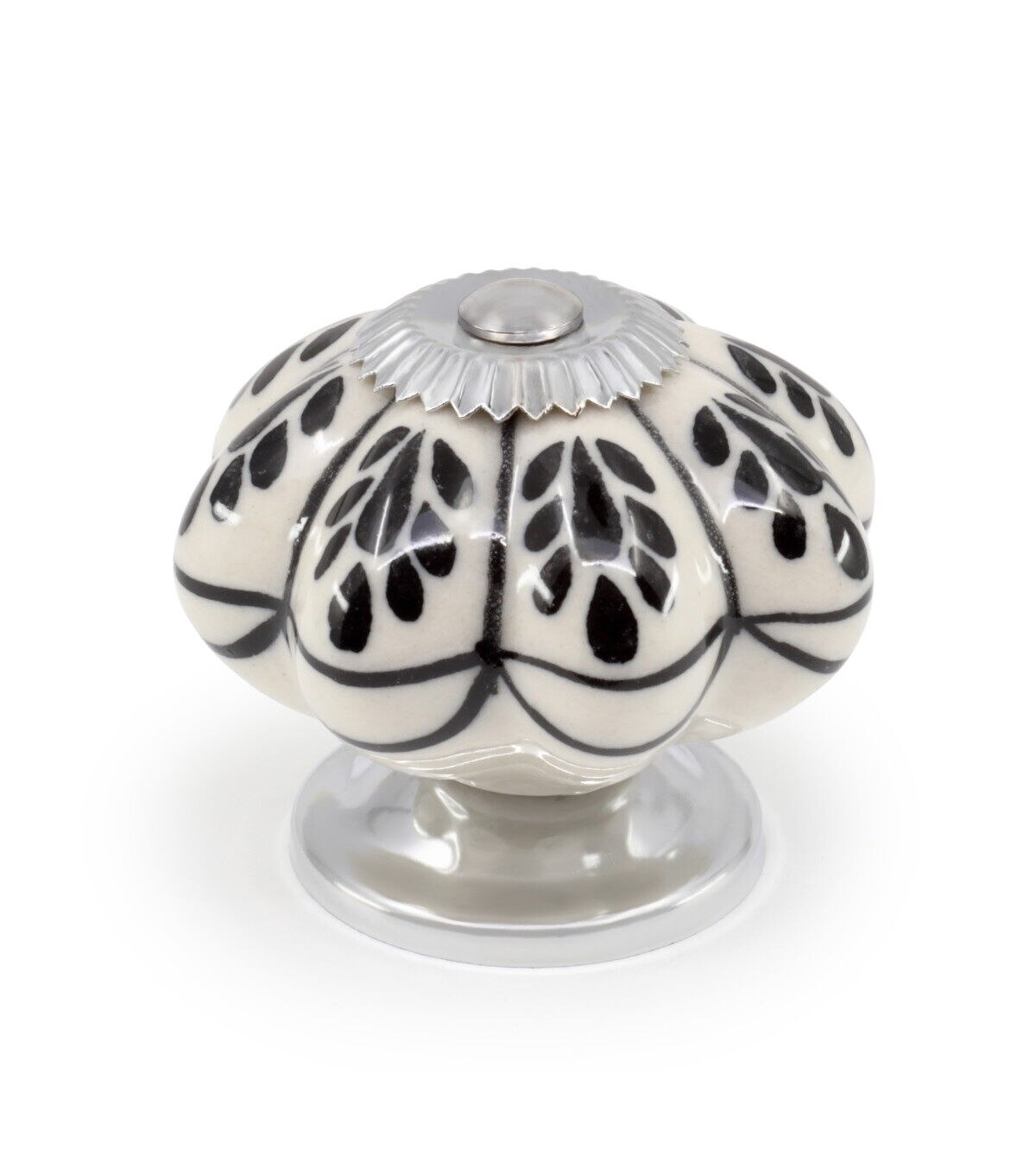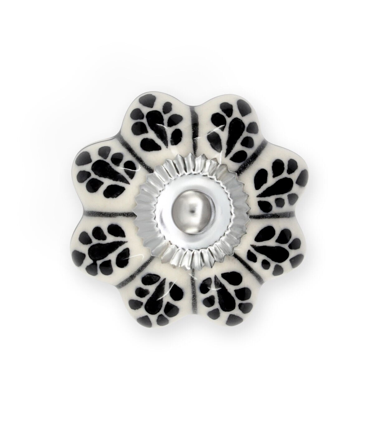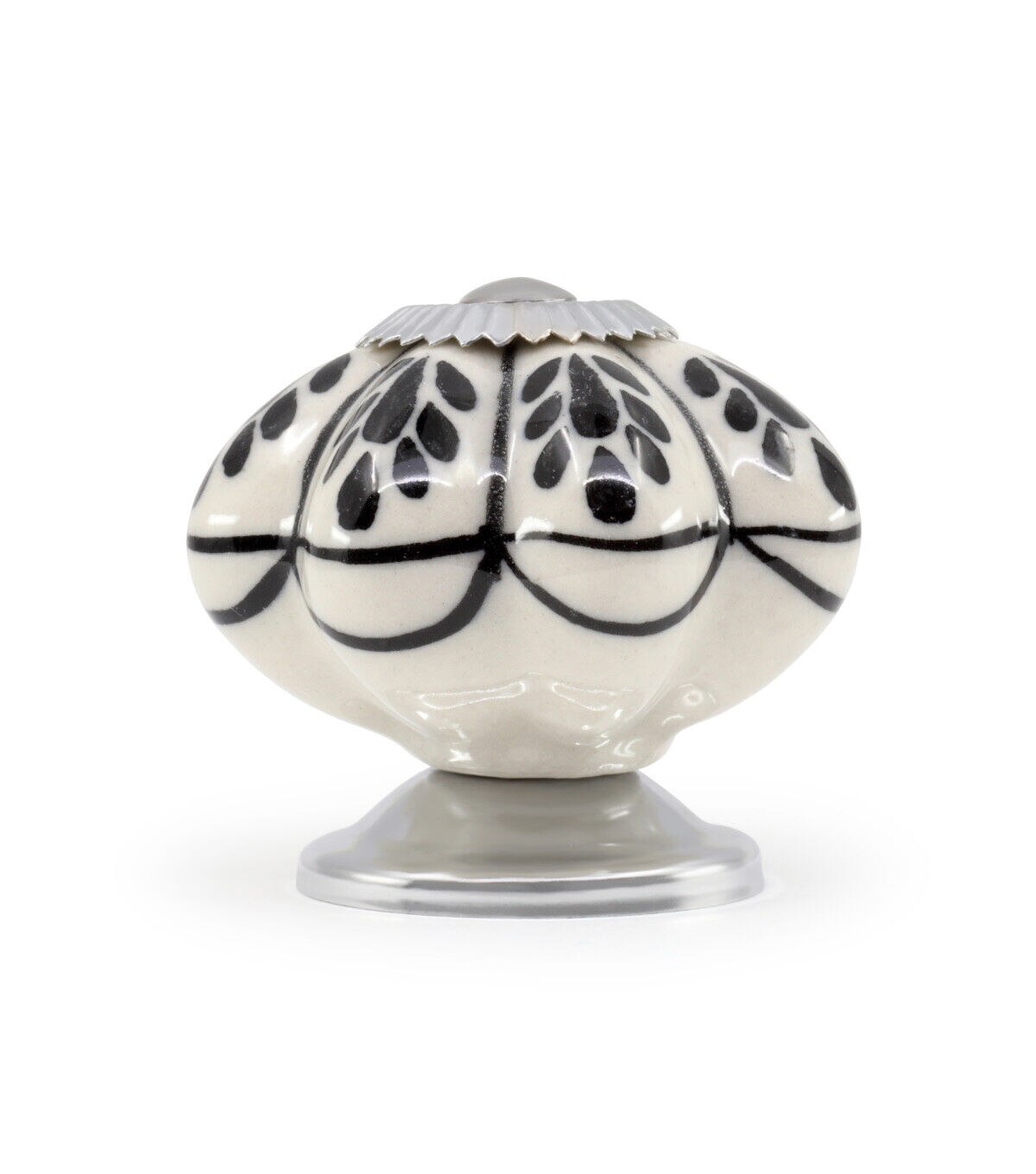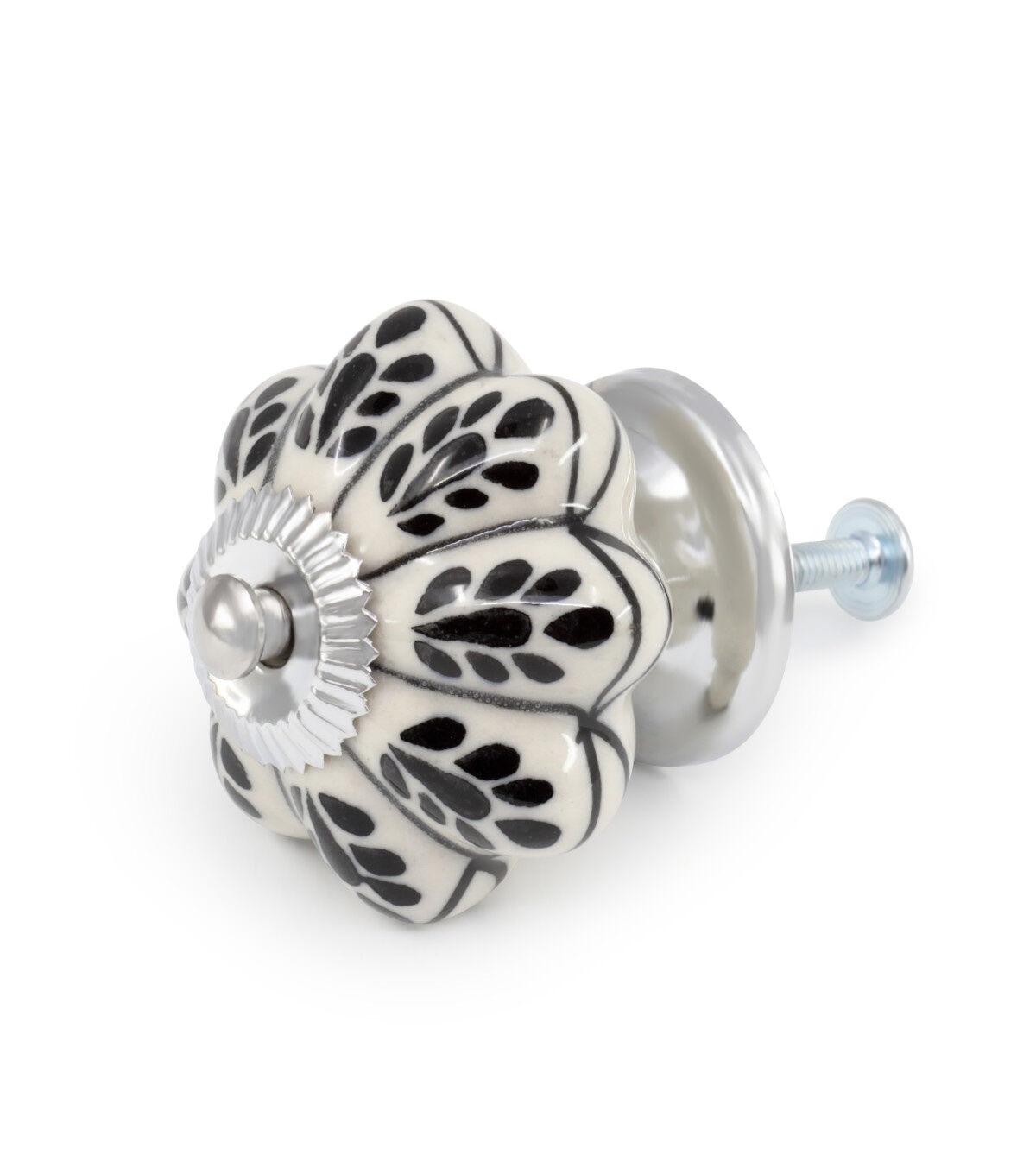 Update a piece of furniture or built-in cabinet by swapping out the old hardware with the Dritz Home Hand-painted Ceramic Scallop Knob - Black & White. This pack includes a knob that is approximately 1.87 inches in diameter and 1.75 inches in projection with an optional metal base. Each knob is crafted by hand and may exhibit subtle variations in size, color and shape. Metals will darken over time. Screws are also included in this pack.