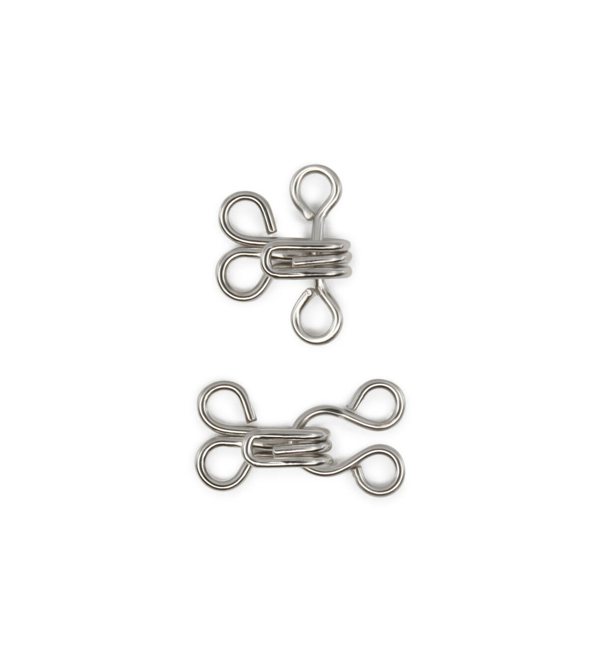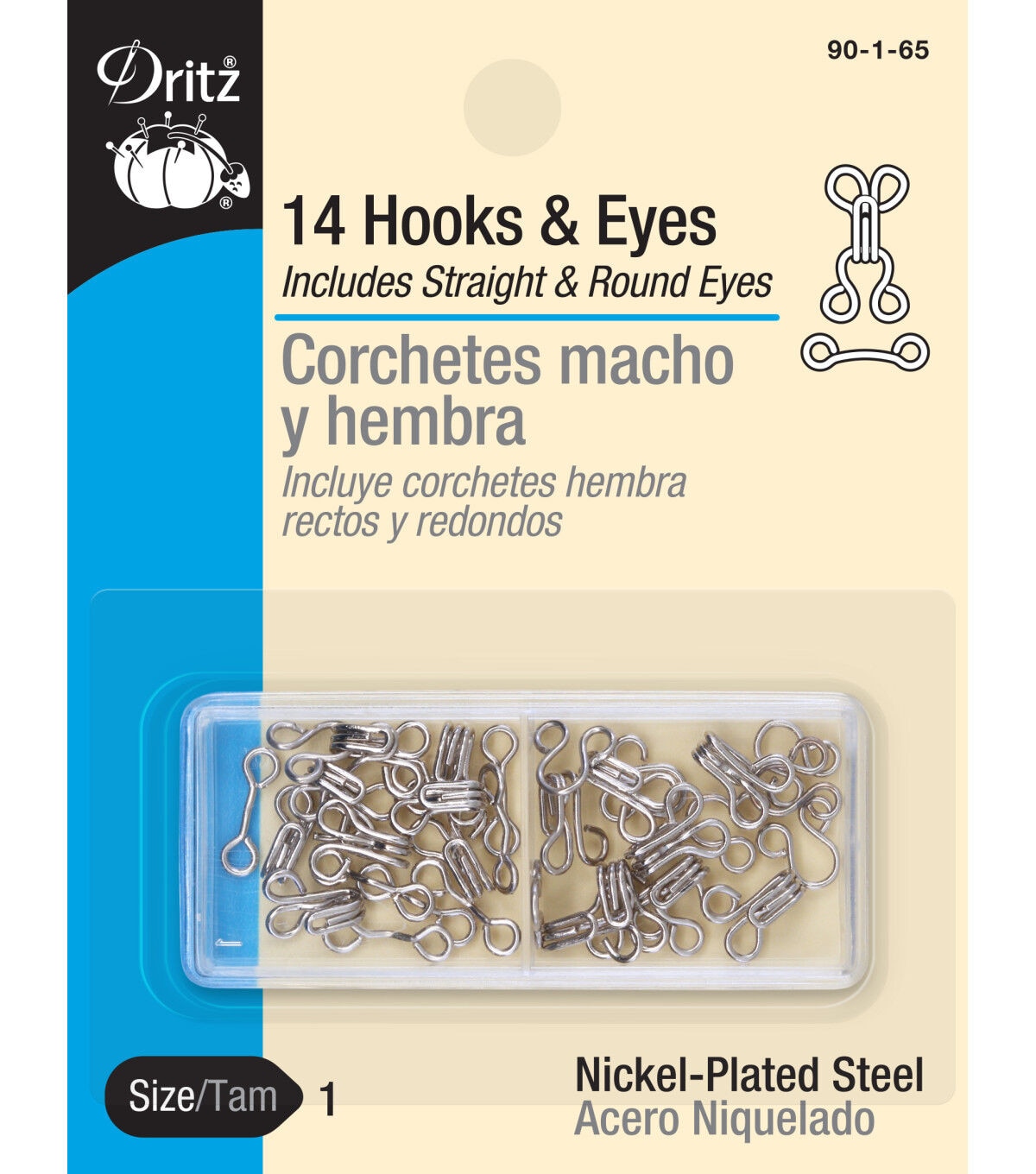 DRITZ-Hook & Eyes. Hook and eye closures are perfect for a little added security when accompanied by a zipper in slacks, skirts, dresses and much more. This package contains fourteen size 1 silver hooks, seven round eyes and seven straight eyes. Imported.