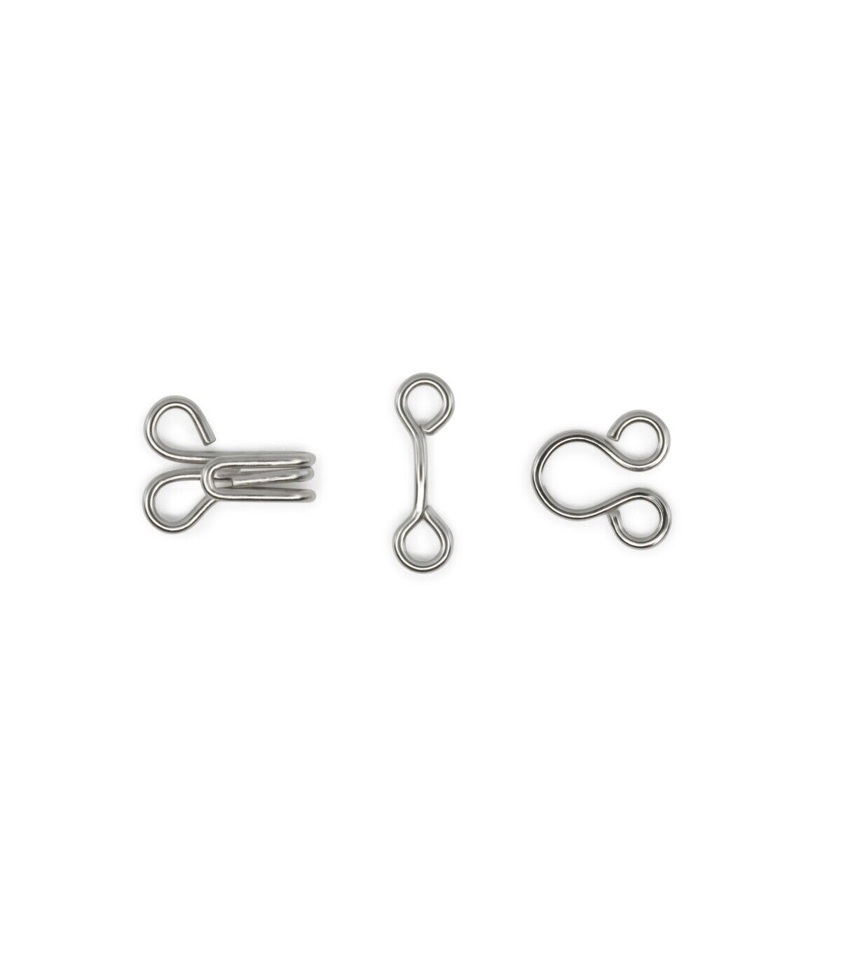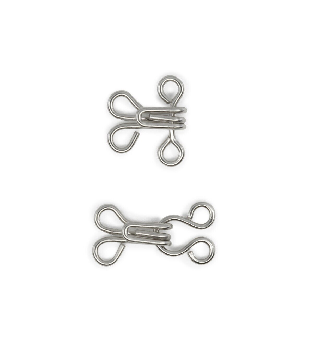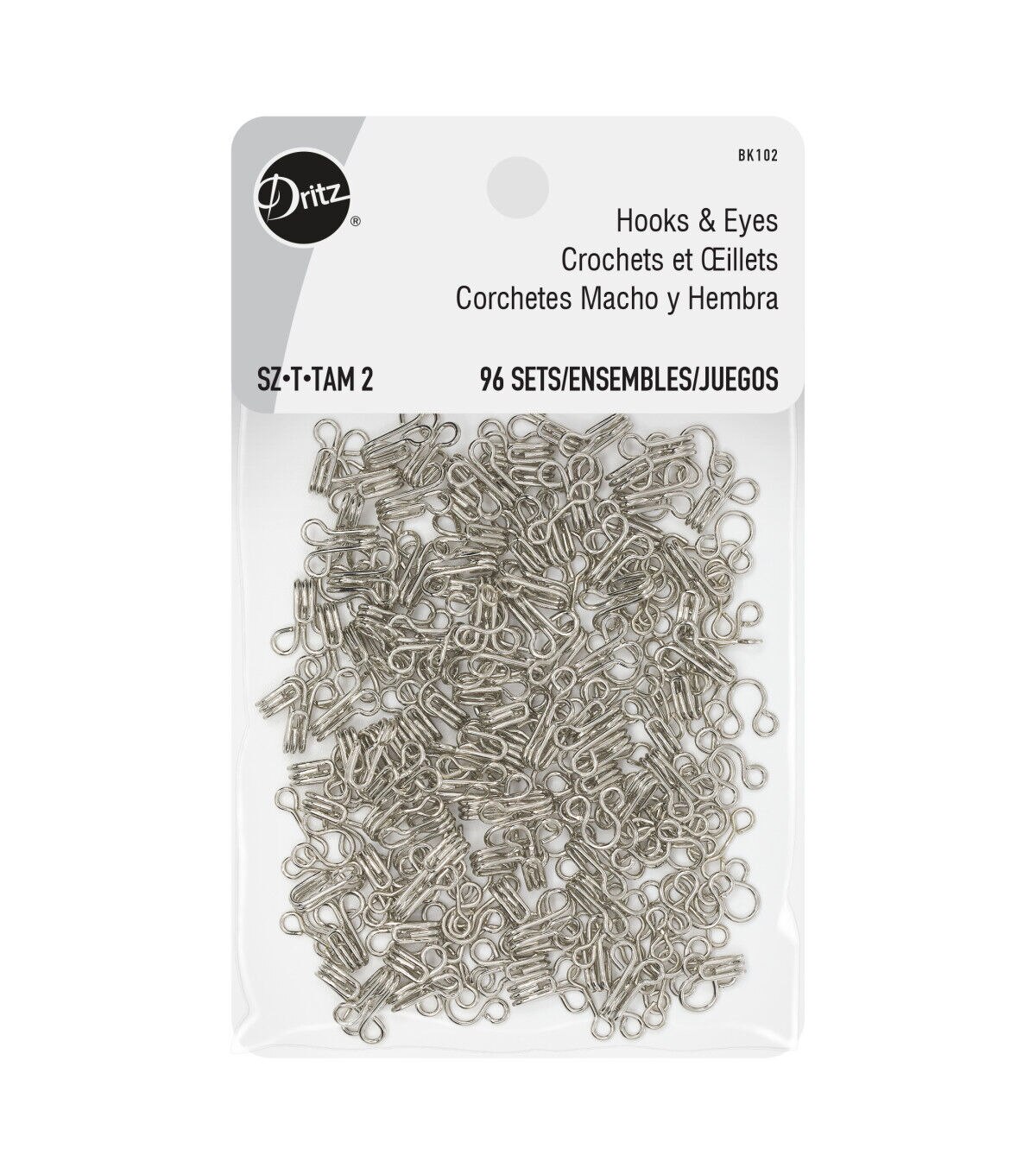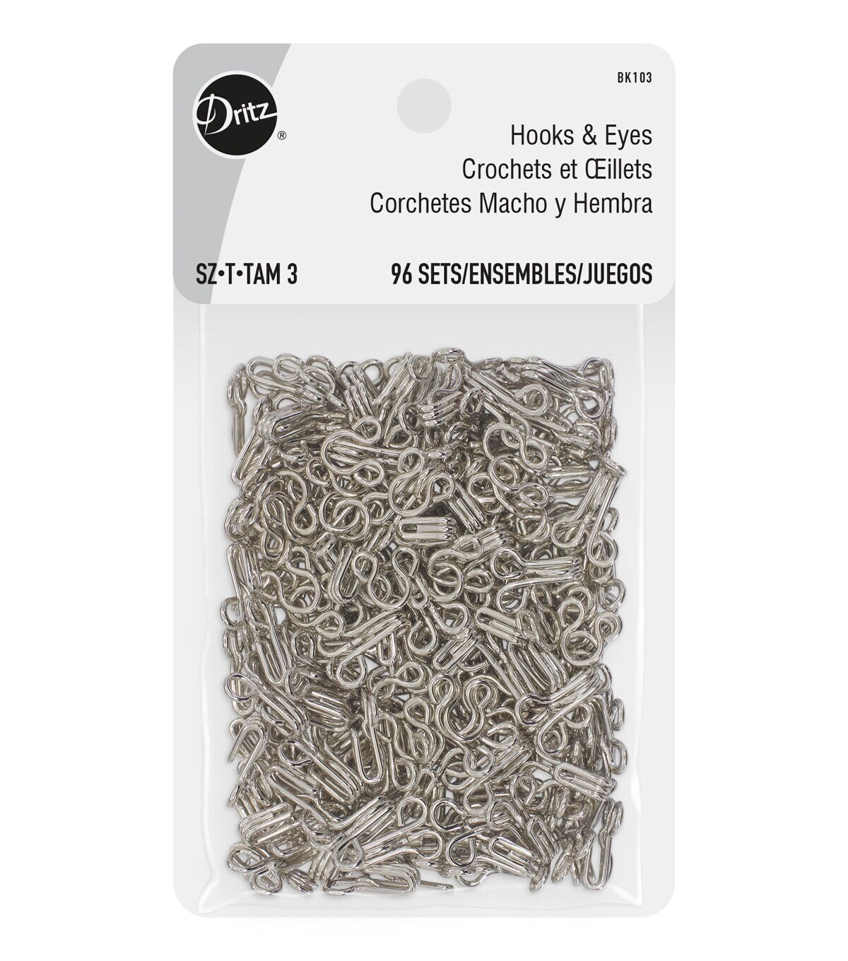 Use the Dritz Assorted Hooks & Eyes to hold the edges of your fabric and apparel projects together. This pack includes 96 sets of hooks with two styles of eyes, round and straight. The round eyes are used on edges that meet and straight eyes are used for overlapping edges. They are ideal for pants, skirts, dresses, lingerie and costumes. These closures are machine washable and dry cleanable.