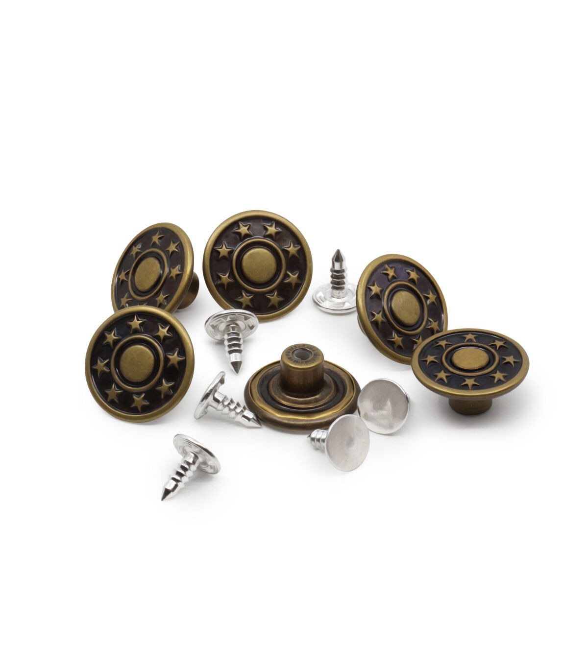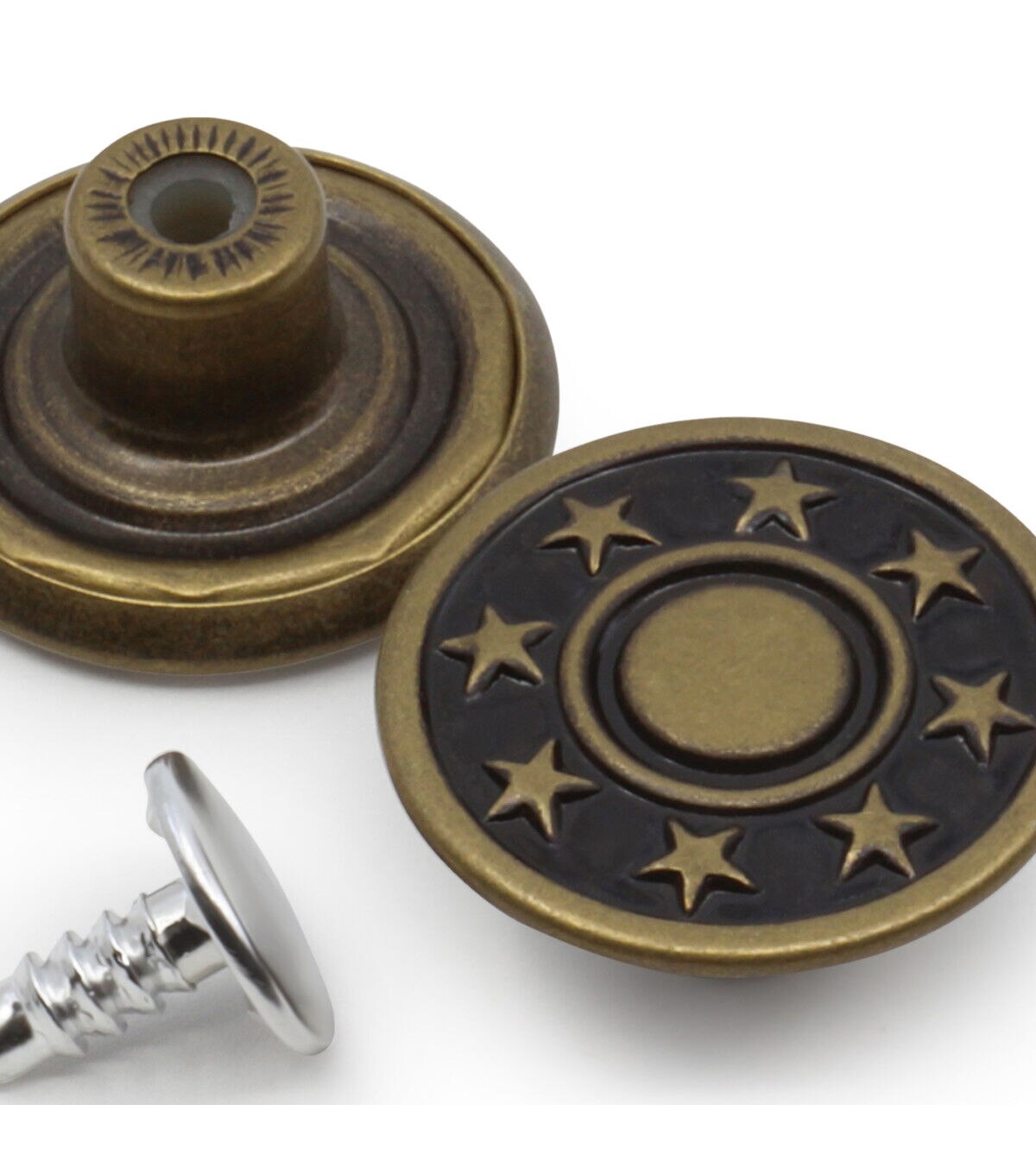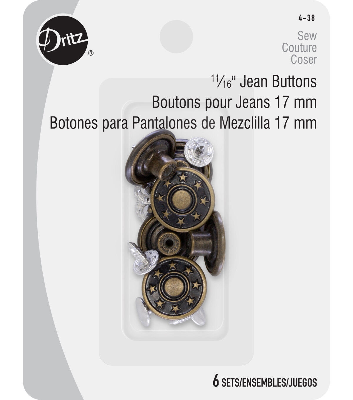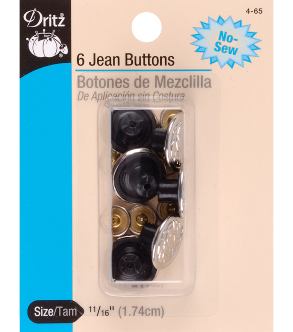 Use the Dritz Bachelor Jean Buttons 11/16'' Pack of 6 to add detail to your handmade denim projects. This pack includes six 11/16-inch bachelor buttons, which are sturdy and durable. Like snaps, these no-sew jean buttons can be easily attached to your fabrics without the use of a needle. They are used mainly for keeping jeans, overalls and suspenders in place. Available in a variety of finishes, each sold separately.