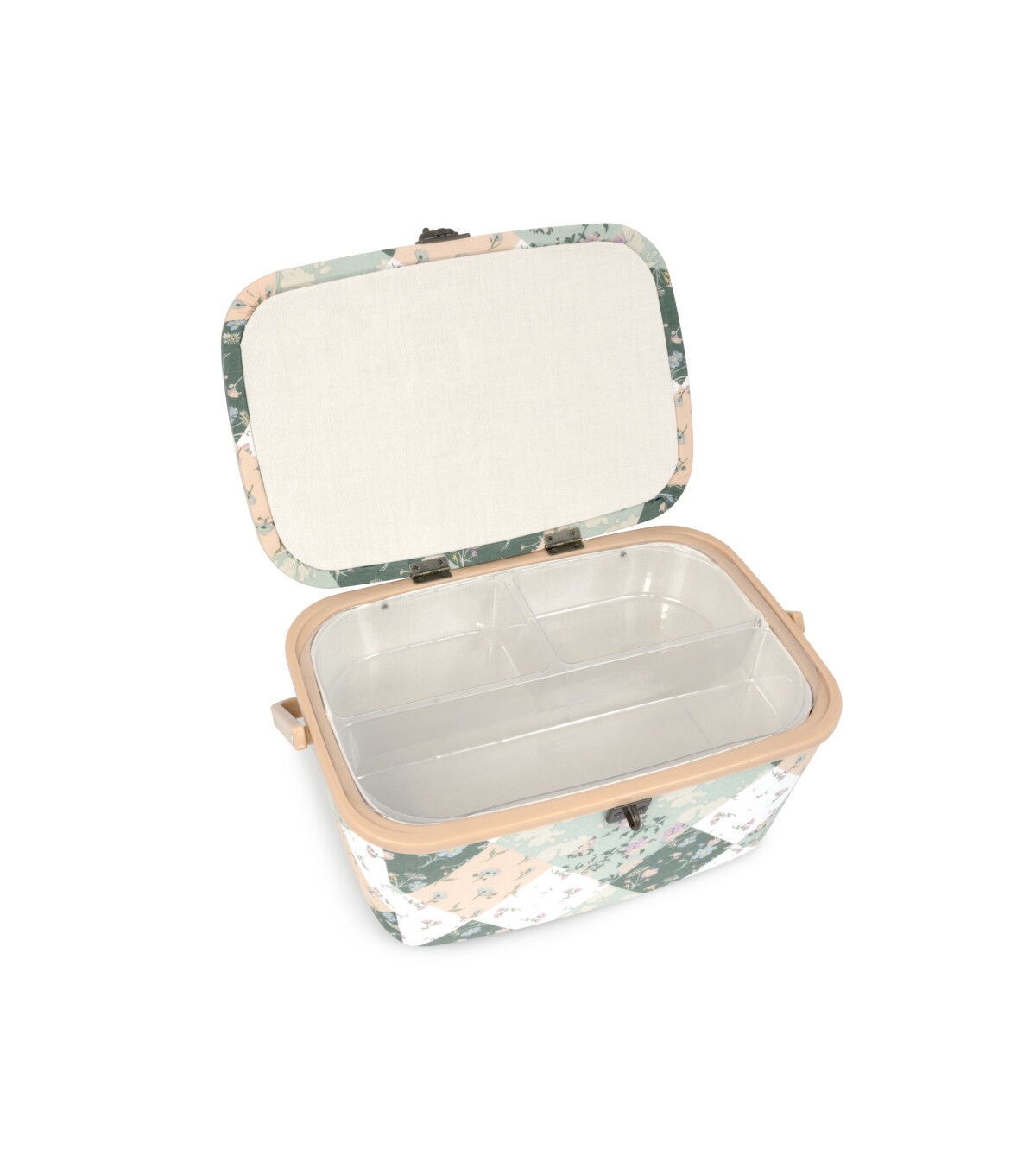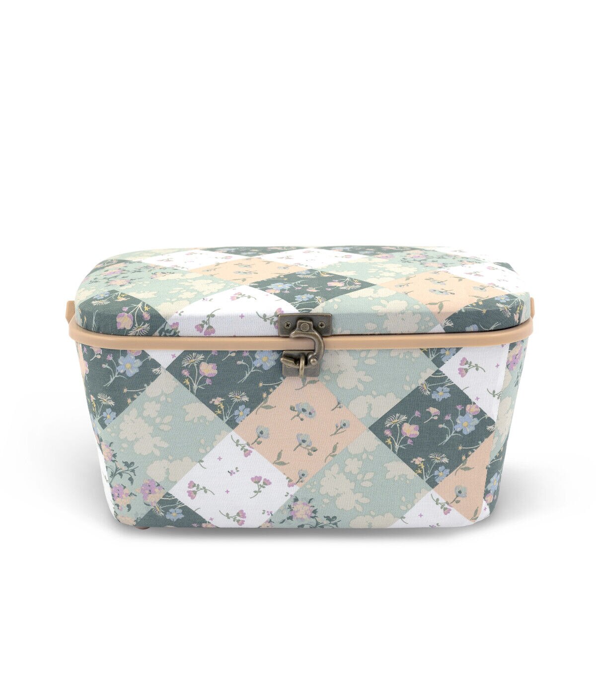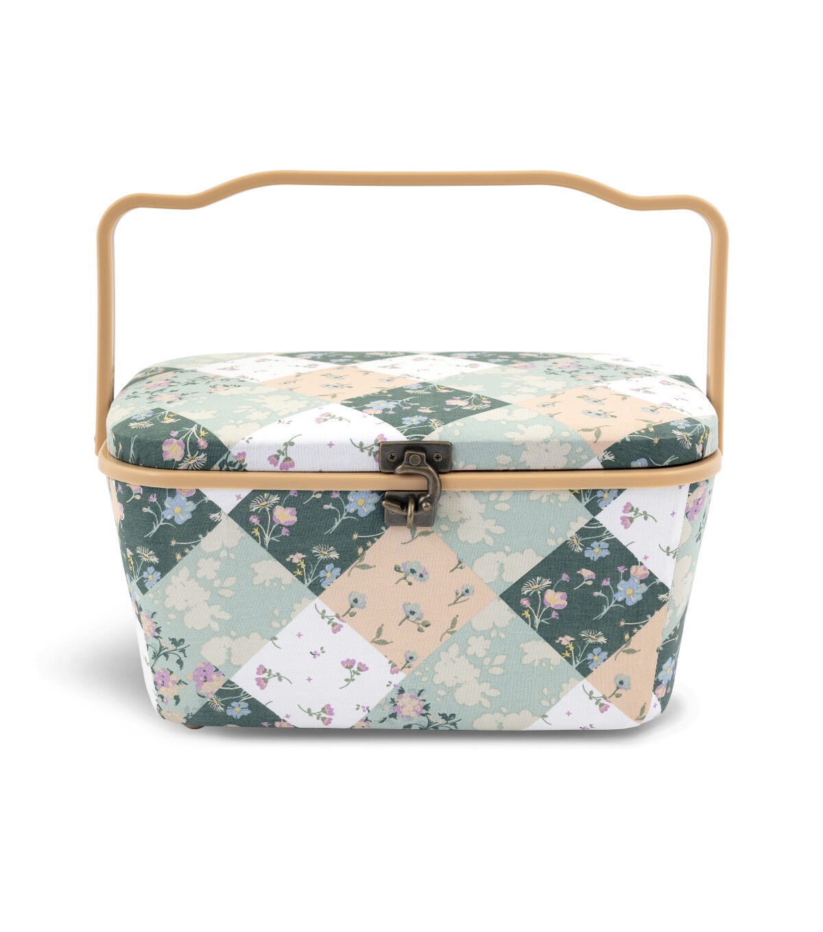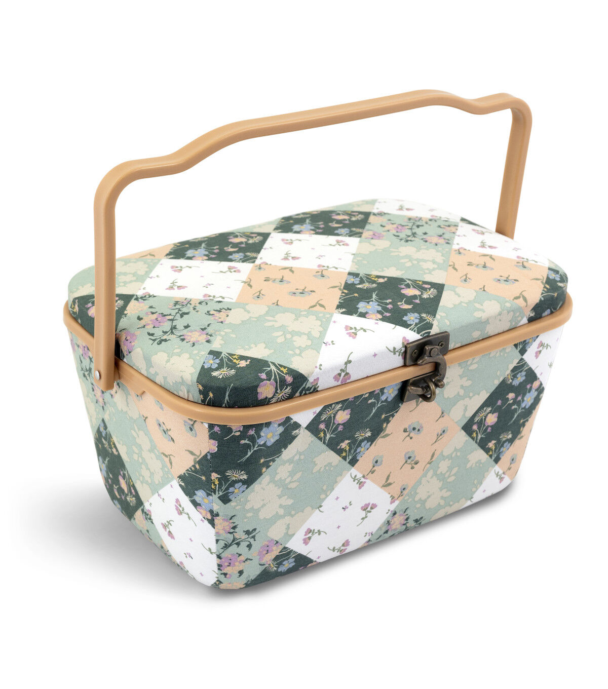 A pretty sewing basket is ideal for organizing sewing, quilting or crafting supplies. This oval sewing basket is covered with a cozy green and white patchwork print fabric and accented with a soft peach handle and trim. With a sturdy plastic handle it is a portable and stylish addition to a sewing or crafting space. An elegant metal latch secures the lid.