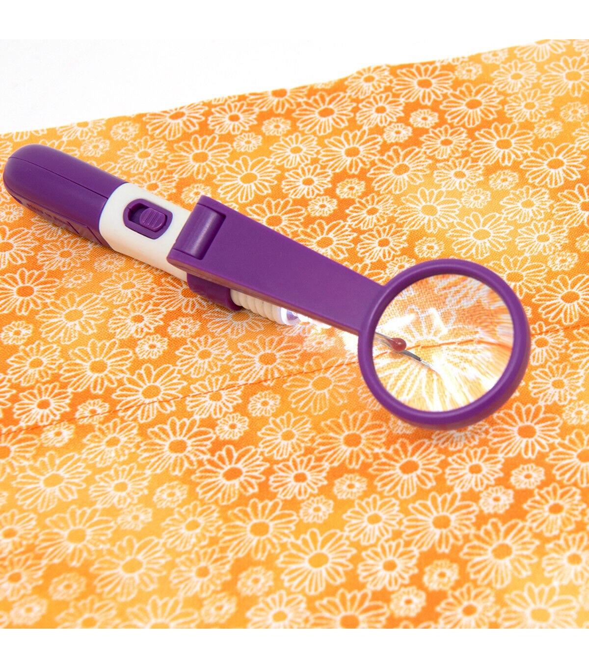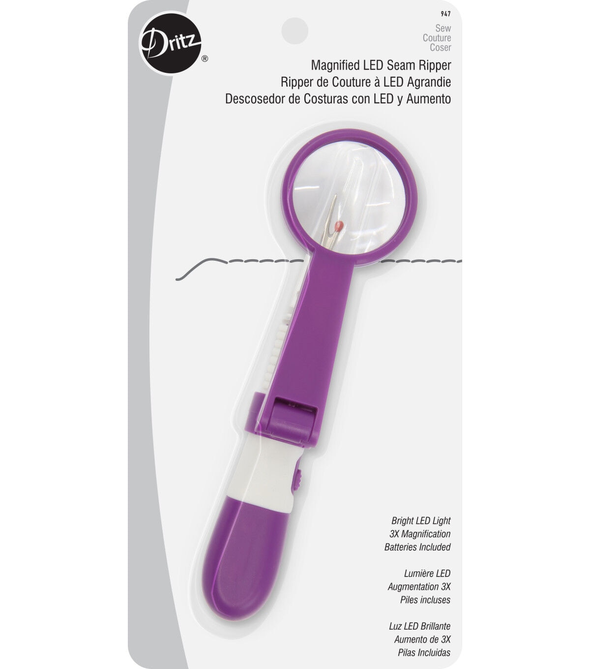 Use the Dritz Magnified LED Seam Ripper for removing stitches easily. The bright LED bulb and repositionable magnifier help you focus on the stitches that need to be removed. This pack includes a seam ripper, bright LED light, magnification lens and three AG13, 1.5 V alkaline button cell batteries.
