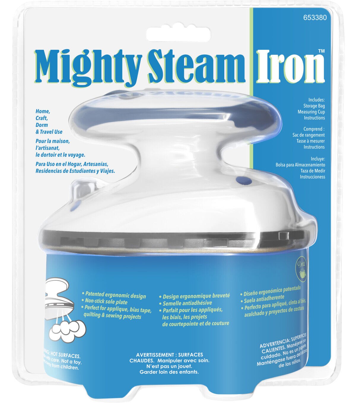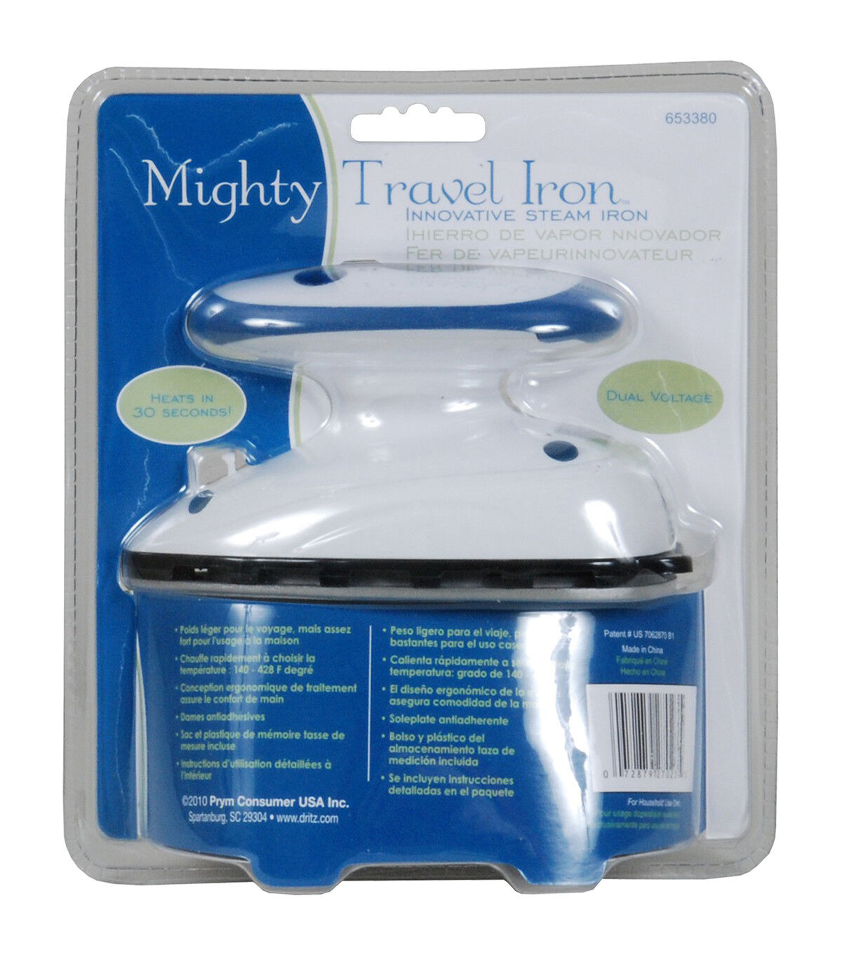 Dritz mighty travel iron steam iron is an innovative steam iron and is great for home, craft, dorm, and travel use. Heats quickly to selected temperature: 140-428 degree F. Perfect for applique, bias tape, quilting and sewing projects. Features a non-stick sole plate and is dual voltage. Includes storage bag, measuring cup, and instructions.