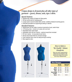 The Dritz My Double Deluxe dress form is a fully adjustable form designed to accommodate every type of garment from tops, blouses, shirts, jackets, and skirts. The longer pole assists taller women and is ideal for long dresses and gowns. Unlike other dress forms, this deluxe dress form includes an off-set pole for hanging shorts and pants. The features of this form will help you create clothing that fits your body shape with ease and style.