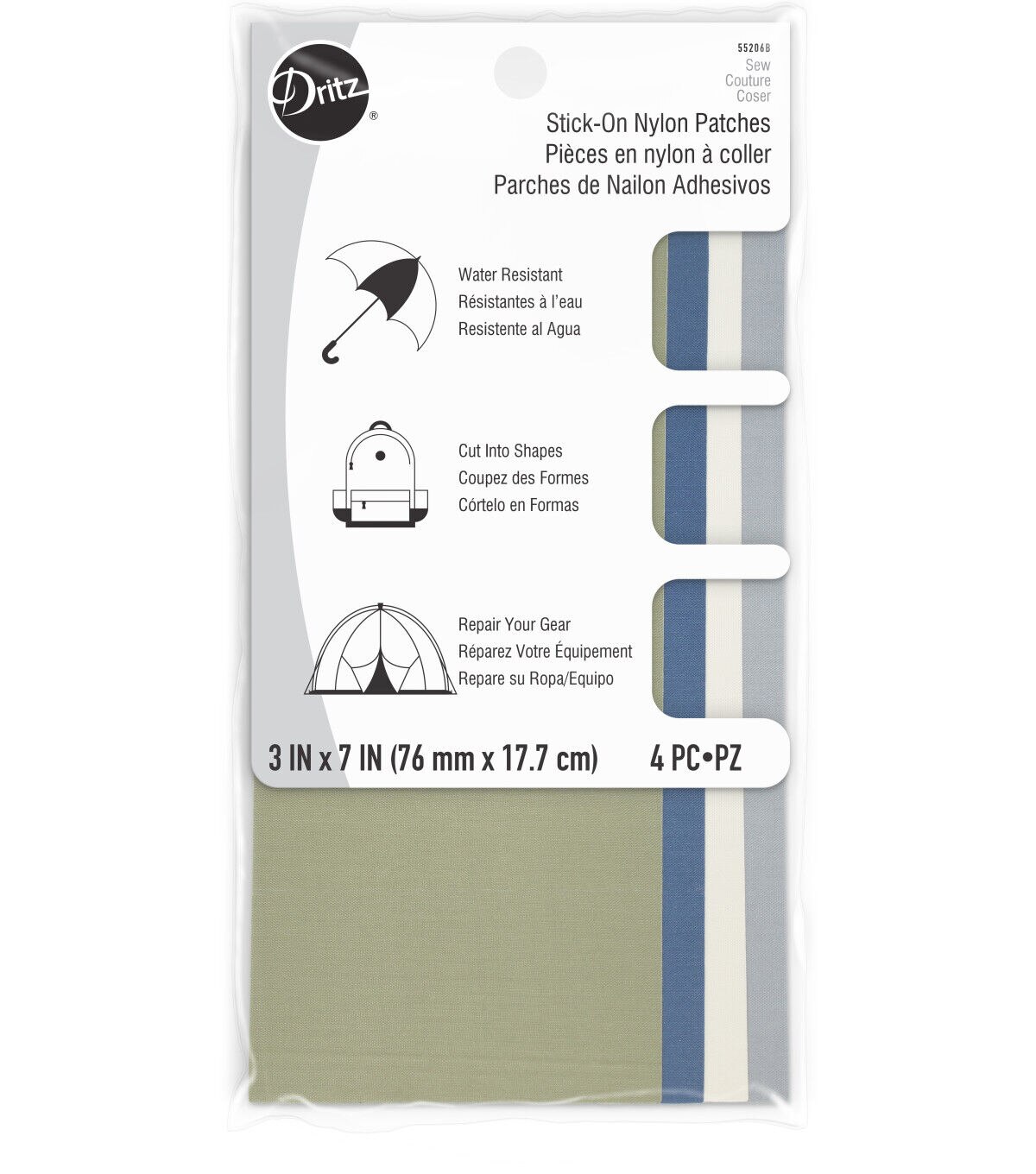 Repair holes in umbrellas, tents, tote bags, parkas and much more using the Dritz Nylon Stick-on Patches - Multi. This pack includes four patches in assorted colors. Each patch measures 3 x 7 inches. These patches are waterproof and self-adhesive. You can cut them into the desired shapes before application.