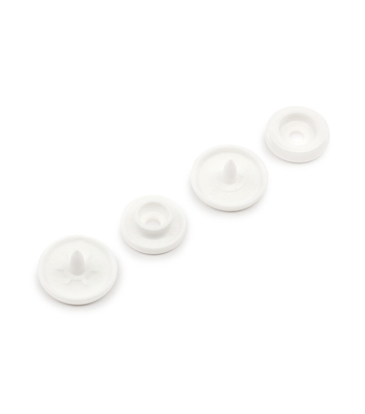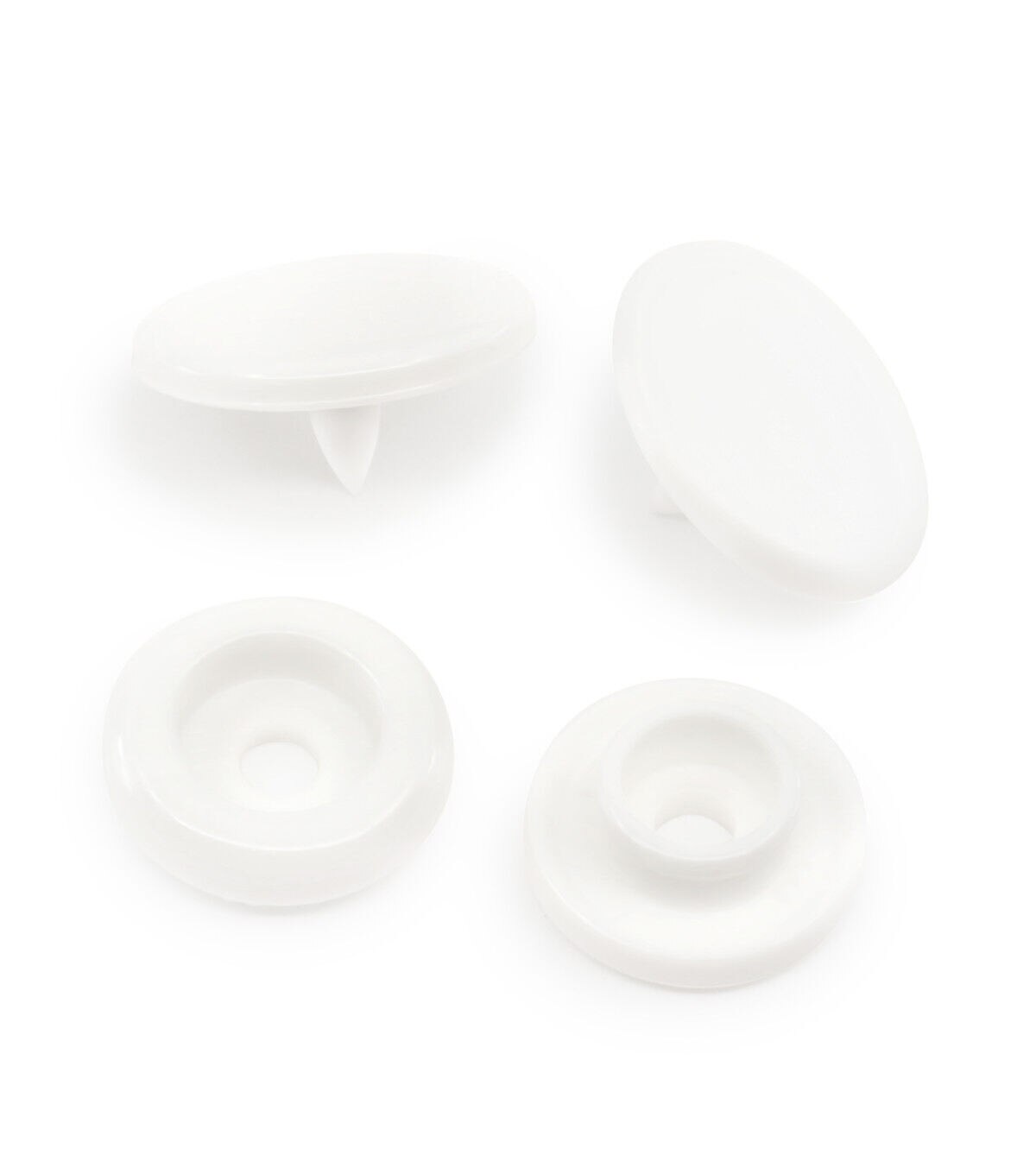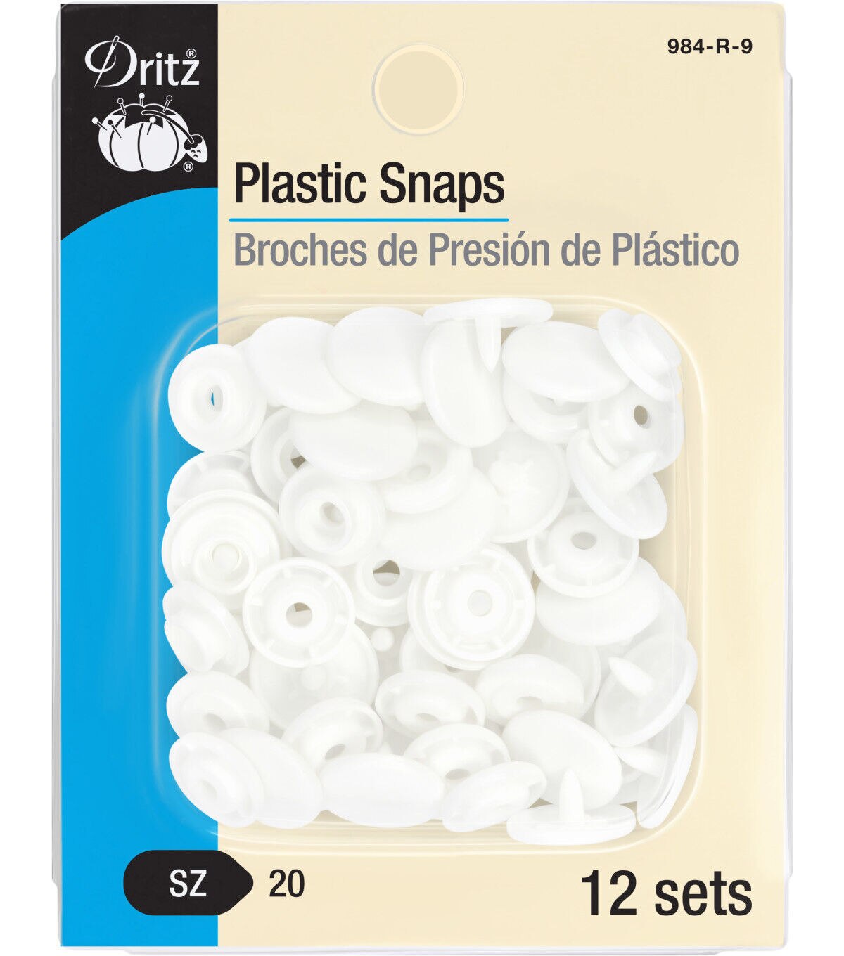 The Dritz Round Plastic Snaps - White can be used on home decor, kids' clothing and more. These snaps are an easier alternative to buttons. Each set includes a decorative cap, socket, stud and round cap. They can be machine-washed and dried or dry-cleaned. Use the Dritz Plastic Snap Pliers, sold separately, to attach plastic snaps.