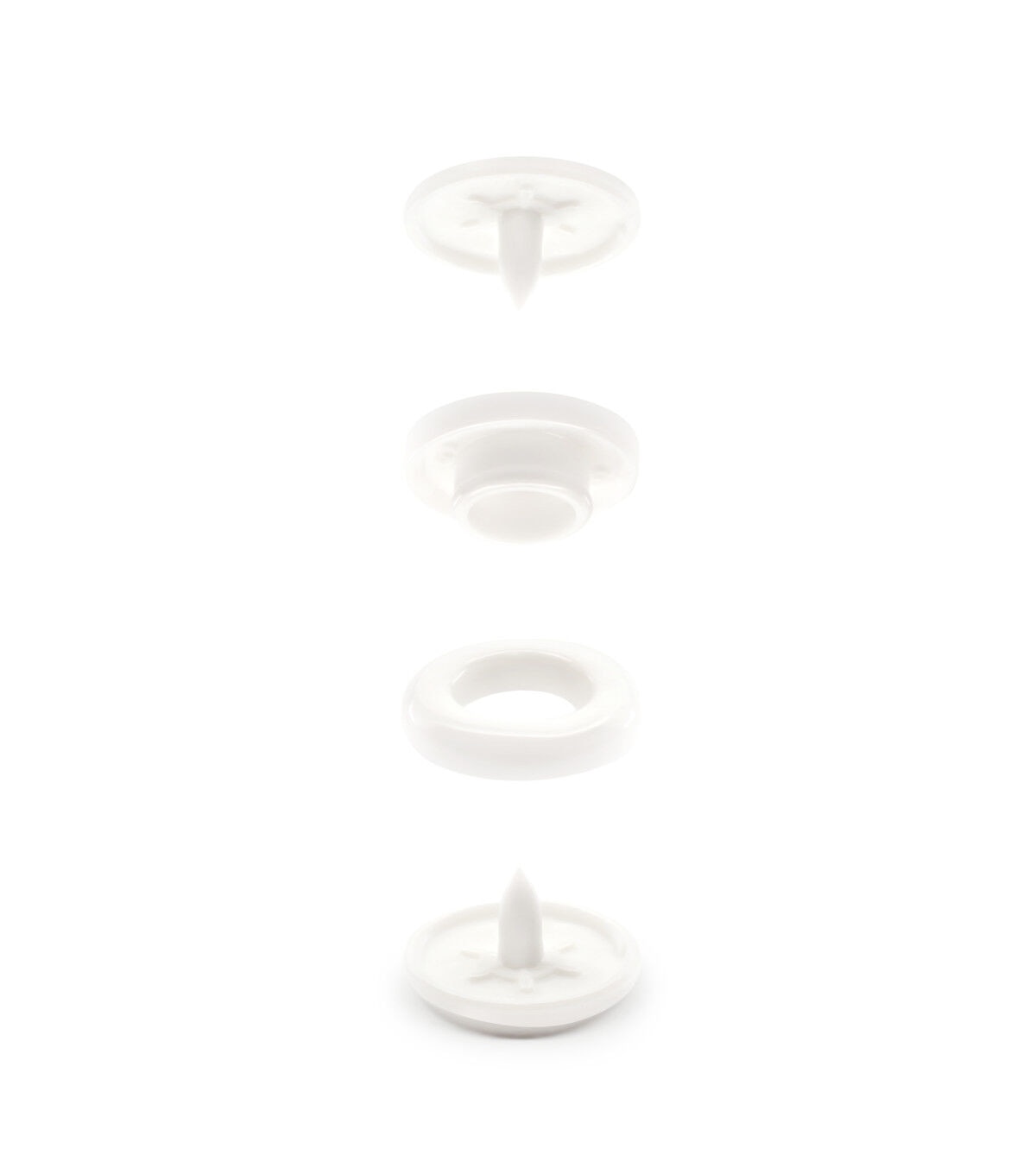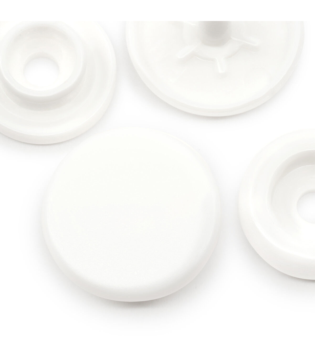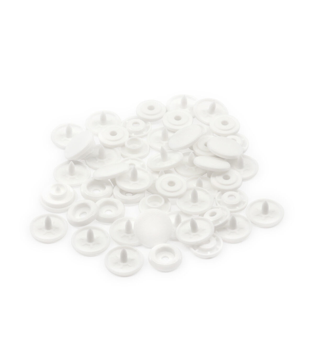 The Dritz Round Plastic Snaps - White can be used on home decor, kids' clothing and more. These snaps are an easier alternative to buttons. Each set includes a decorative cap, socket, stud and round cap. They can be machine-washed and dried or dry-cleaned. Use the Dritz Plastic Snap Pliers, sold separately, to attach plastic snaps.