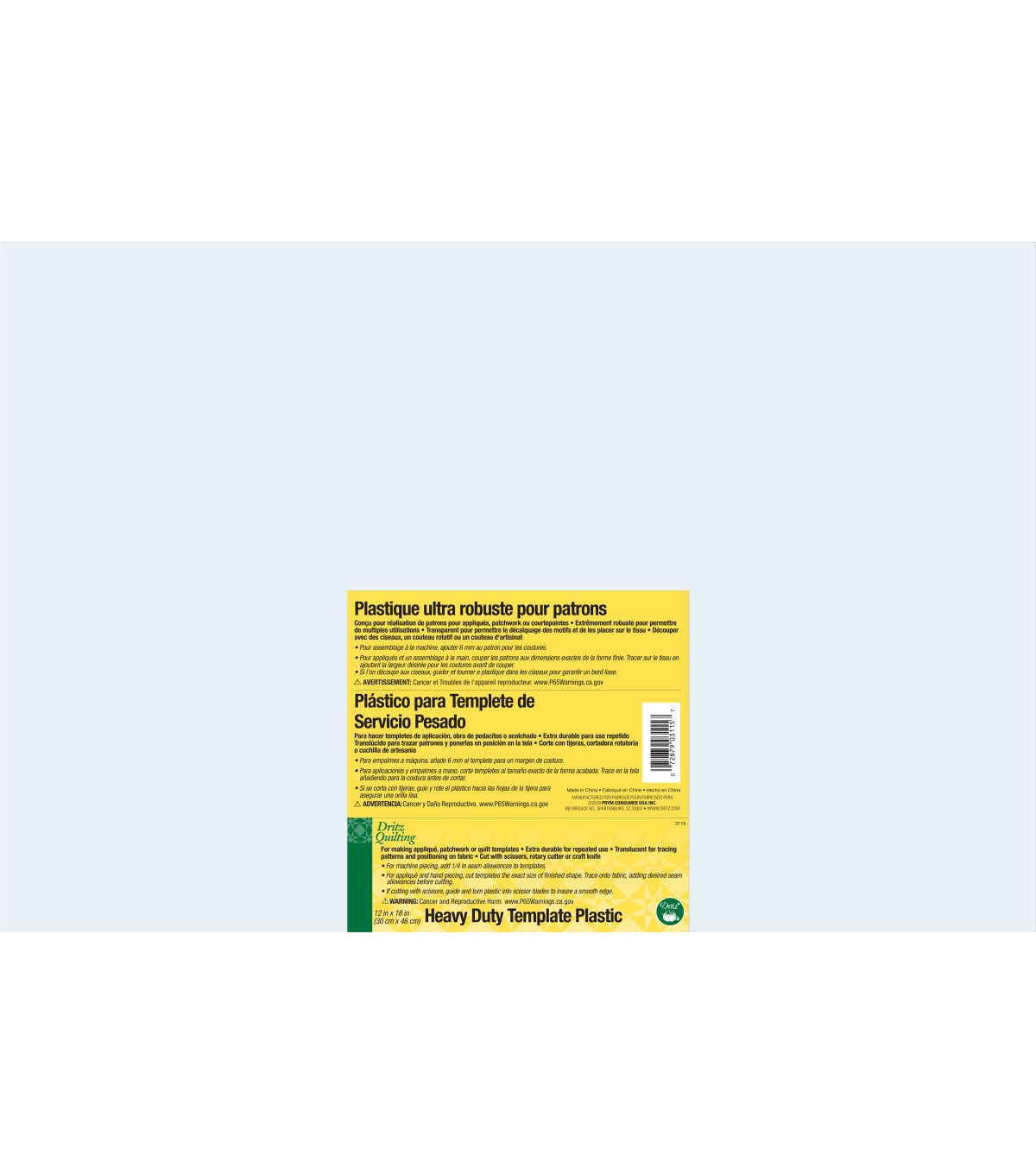 The Dritz Quilting Heavy Duty Plastic Template Sheet is extra durable for repeated use. This quilting template is ideal for making applique, patchwork or quilt templates. It is translucent for tracing patterns and positioning on the fabric. You can easily cut it with scissors, a rotary cutter or a utility knife.
