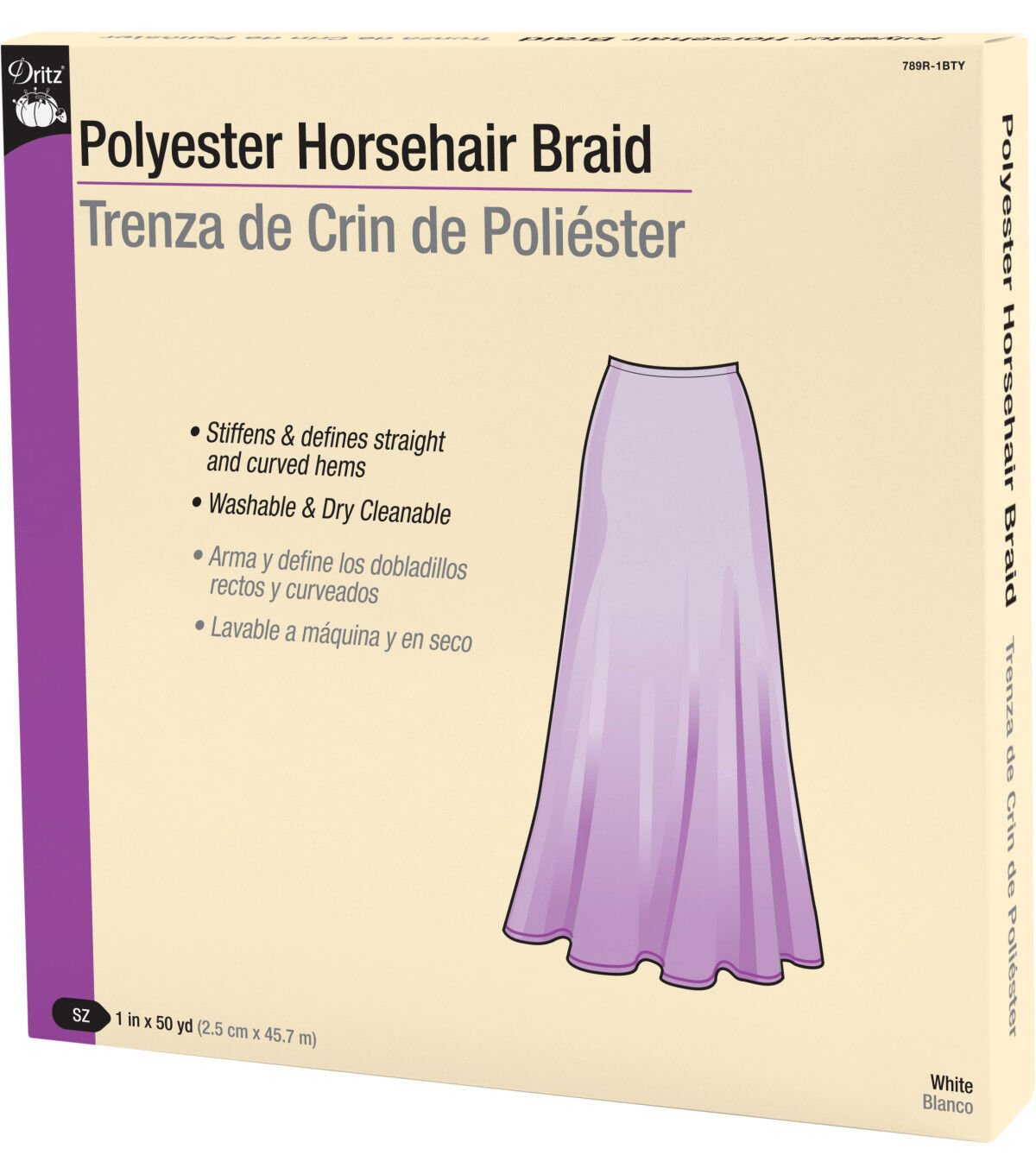 Use the Dritz Polyester Horsehair Braid - White to add body to gowns, floor-length skirts and other dresses without adding weight to the hem. It will stiffen and define hems and prevent them from collapsing. You can also make decorative hats, wigs and flowers with it. Made of 100% polyester, this 1-inch-wide horsehair braid is durable, washable and dry cleanable.