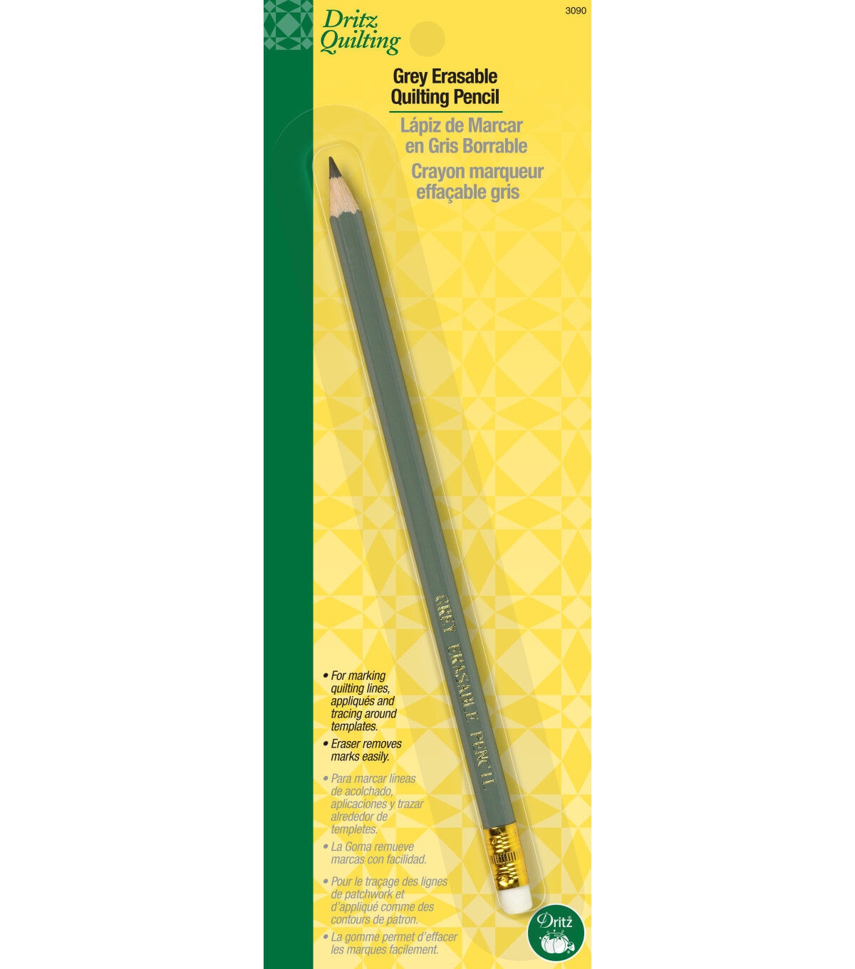 Mark quilts, applique lines or trace desirable weaving patterns with the Dritz Quilting Pencil with Eraser - Gray. This water-soluble marking pencil comes with an attached eraser to erase the markings once the sewing is completed. Alternatively, the marks can also be wiped off with a damp piece of cloth. It works well on dark-colored fabrics which makes it a useful tool for your quilting projects. Use this marking pencil on a small piece of cloth and erase the marking to check its performance before using it on fabrics.