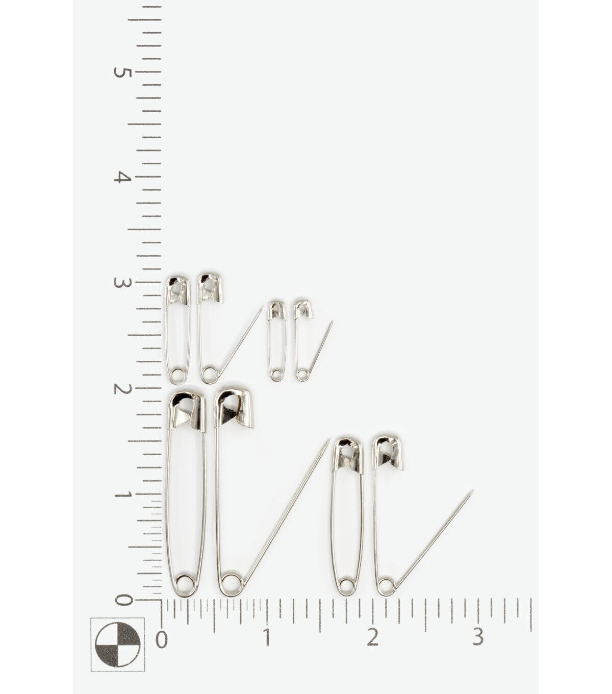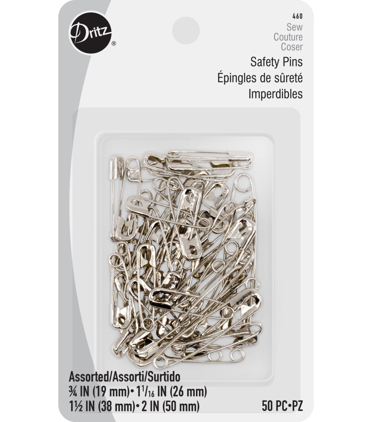 Complete your craft and sewing kit with the Dritz Assorted Safety Pins. This pack includes 50 safety pins in assorted sizes. Use these nickel-plated safety pins to hold fabrics or paper together while working on apparel or papercrafting projects. They will also work as temporary last-minute fixes for ripped apparel.
