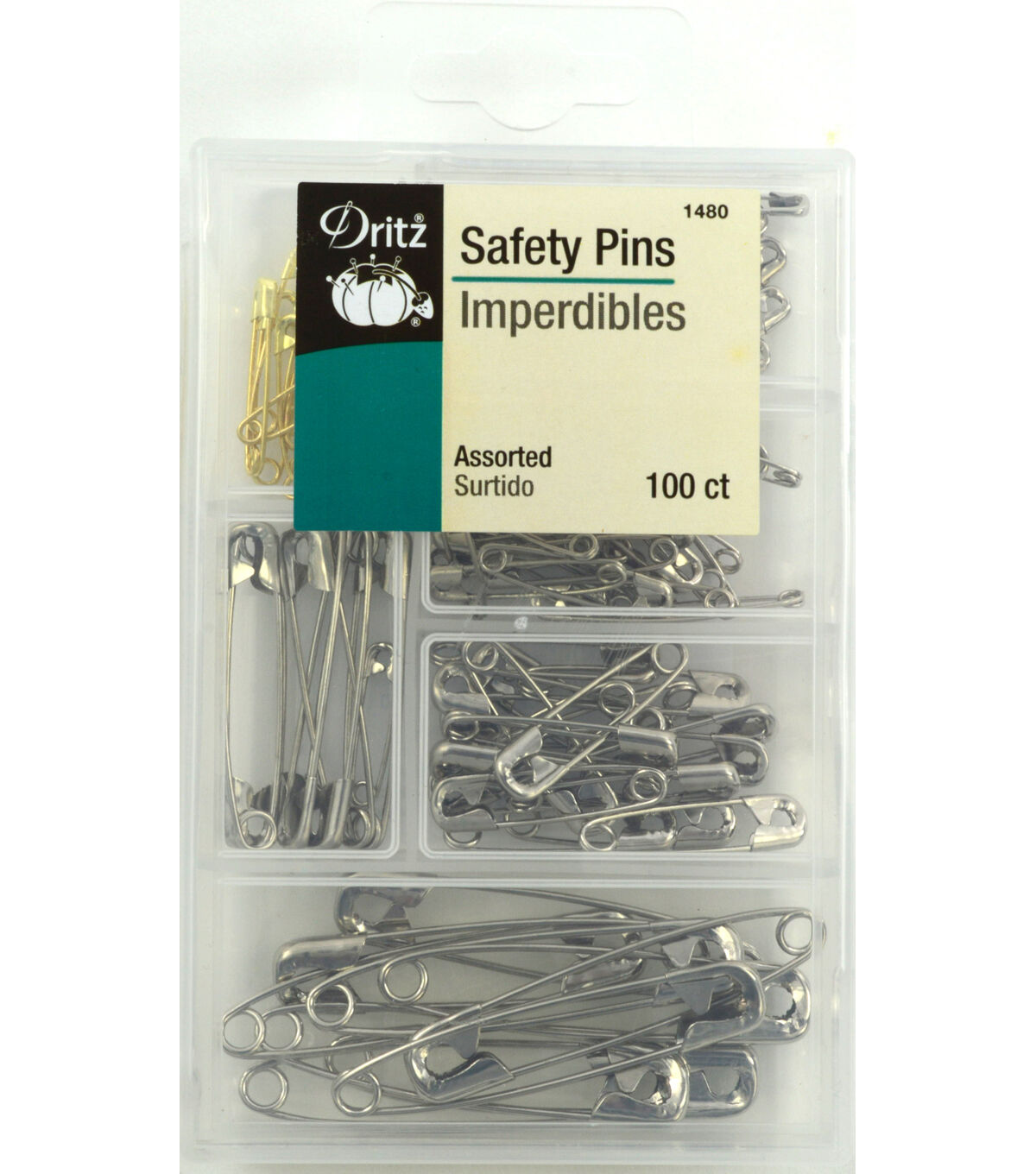 The Dritz Assorted Safety Pins are perfect for securing fabric. This pack includes ten safety pins in size 3, six safety pins in size 2, 18 safety pins in size 1, 25 safety pins in size 0, 30 safety pins in size 00, five brass safety pins in size 0 and six bras safety pins in size 00. These safety pins come in a clear, divided storage box.