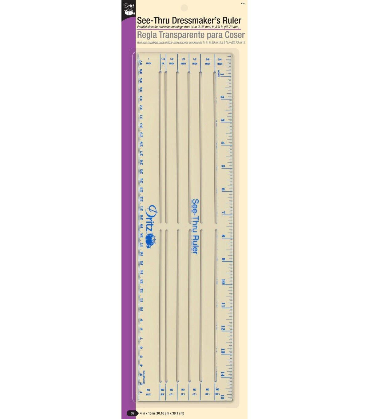 The Dritz See-thru Dressmaker's Ruler is a must-have tool in every fabric designer's kit. Accurate numbering on this scale allows you to make precise markings from 0.25 to 3.37 inches. This ruler also comes with clear plastic for making parallel markings. It is great for measuring and marking specific locations of buttons, appliques, lace, pockets and buttonholes. You can also use it as a tracing wheel.