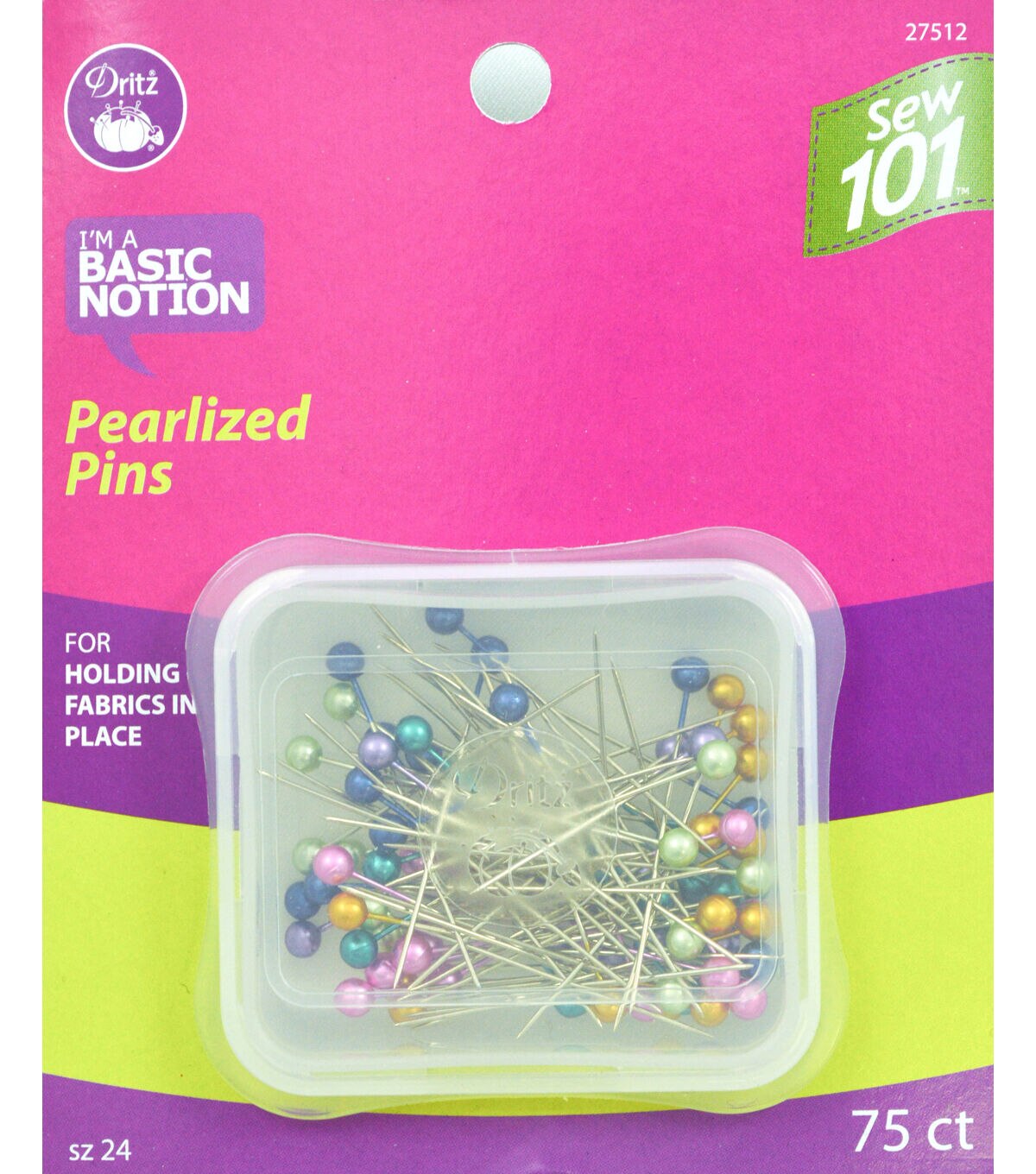 Complete your crafting or sewing assignments with the Dritz Sew 101 Pearlized Pins. This pack consists of 75 stylish pearlized pins in multiple assorted colors. These nickel-plated steel pins are ideal for simple crafting, sewing or quilting projects. Use them to pin down small items, hold multiple fabric trims or paper, pin markings and more. They are the perfect inclusion to your sewing or crafting kit.