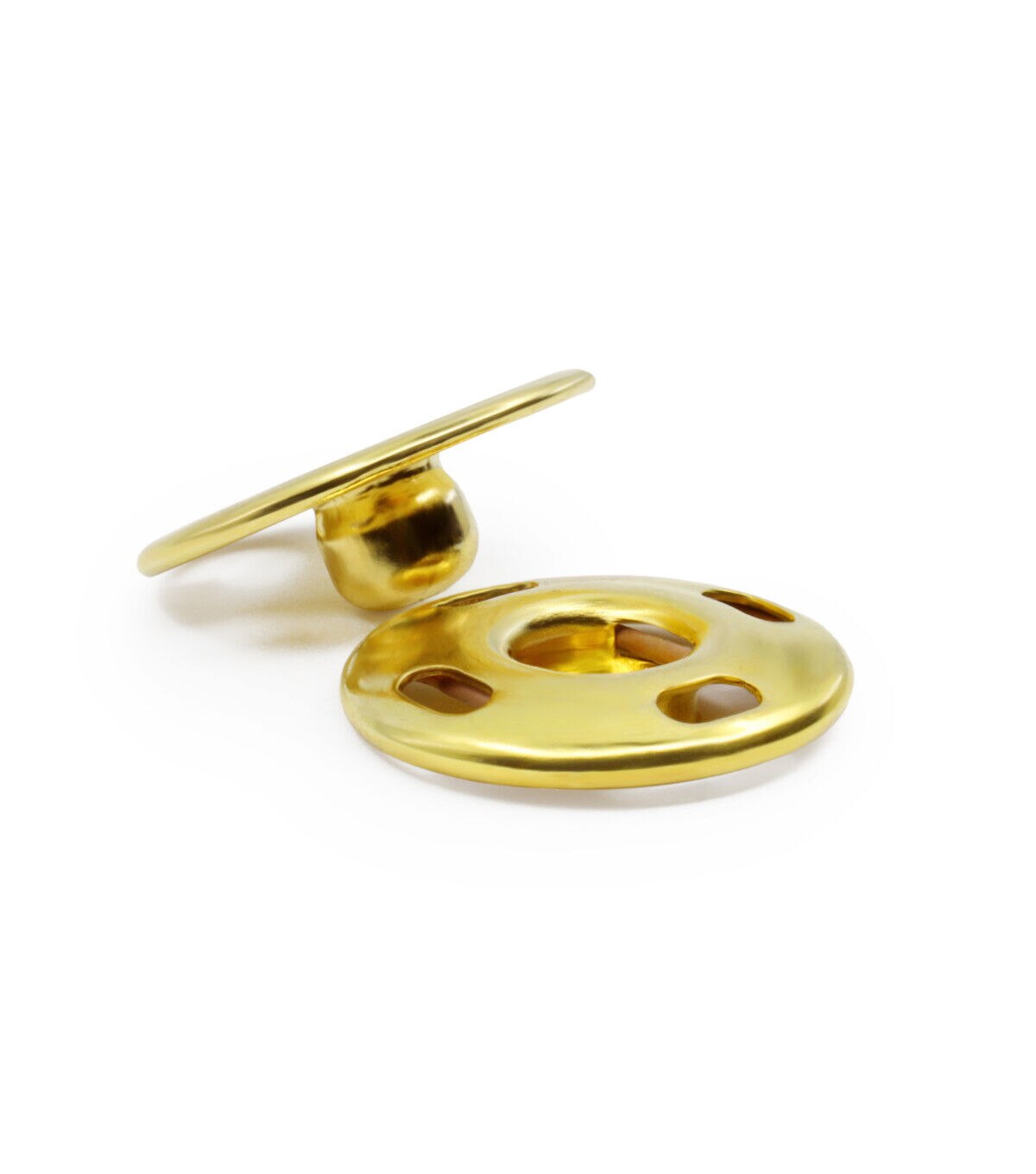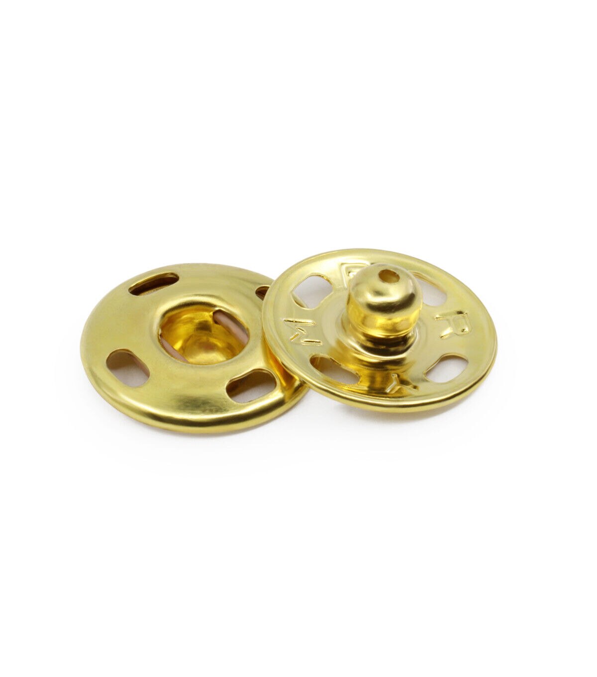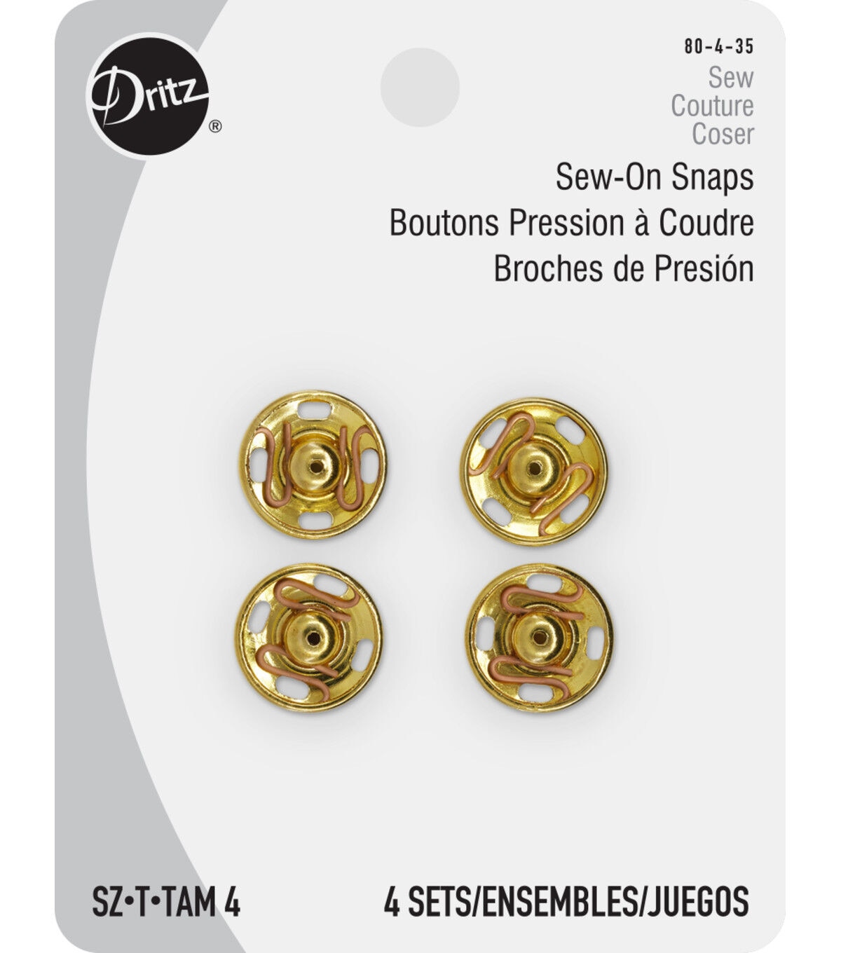 The Dritz Size 4 Sew-On Snaps Gold are a great way to accessorize your apparel or fashion accessories. Easy to attach and decorative, these sew-on fasteners are perfect for use on various garments and home decor items. Made of superior-quality brass, they are sturdy enough to last long. They have an easy open and shut action for added convenience. This package includes four sets of sew-on snaps.