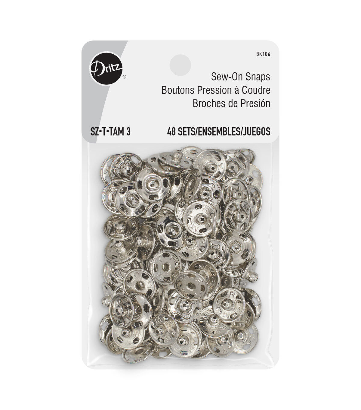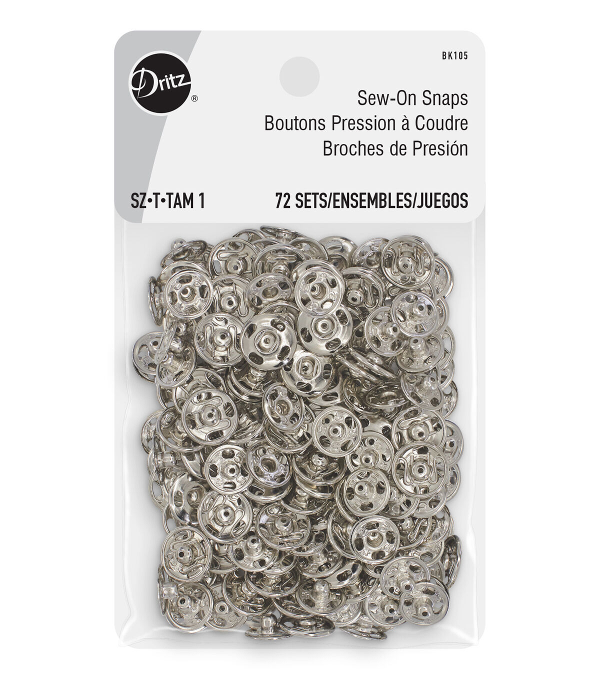 The Dritz Assorted Sew-on Snap Set are flat closures that are used to hold overlapping edges of fabric together and are ideal for use on clothing and accessories. This pack contains 72 sets of brass snaps that are specially crafted for durability and toughness. They include four openings on the edges for stitching. Use them as garment closures on blouses, shirts cardigans, coats and other apparel.