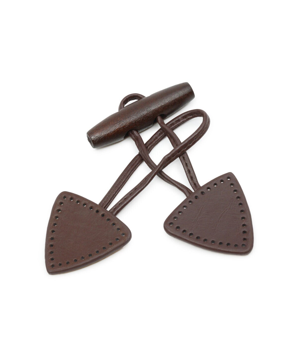 The Dritz Sew-on Toggle - Brown is a faux leather fastener that comes with a wooden button and pre-punched stitching holes. You can easily sew it onto a variety of garments, accessories and more. This pack includes a sew-on toggle in a brown shade.