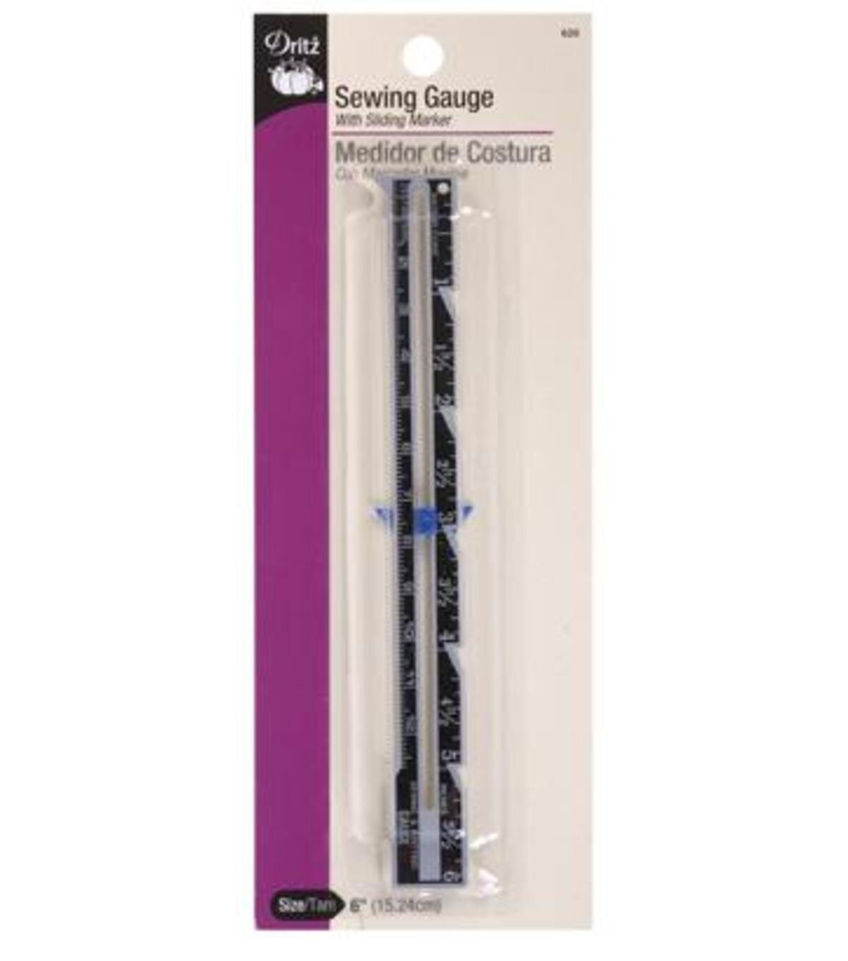 Measure and mark fabrics at the same time with the Dritz Sewing Gauge with Sliding Marker. This 6-inch sewing gauge comes with a sliding marker that stays in place allowing you to make multiple markings. It is designed with holes on top. Use this sewing gauge to mark and measure hems, pleats, tucks, buttonholes and more. You can also use the slider to draw circles and scallops on your fabrics.