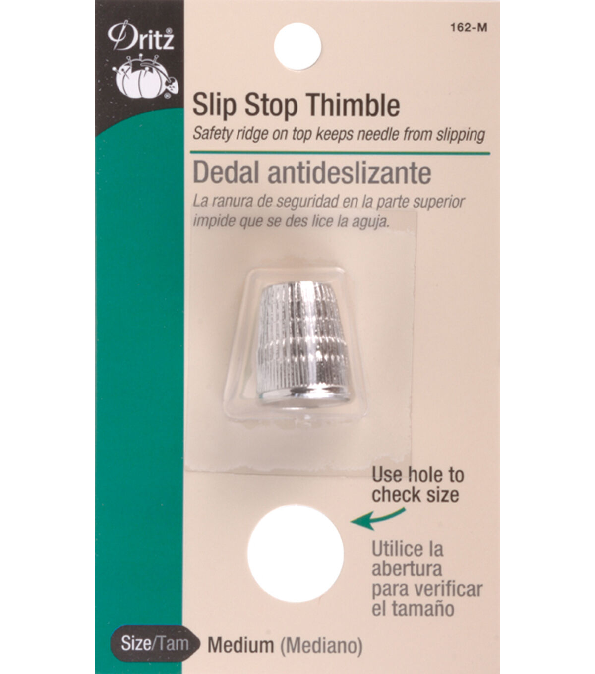 Use the Dritz Slip-Stop Thimbles to protect your thumb from accidental needle pricks while you sew. This pack includes one thimble with a safety ridge on top, which prevents needles from slipping off your finger. Specially crafted from nickel-plated zinc, this slip-stop thimble is a must-have for all quilters, sewers, dressmakers and designers. Available in a variety of sizes to suit your needlework needs.