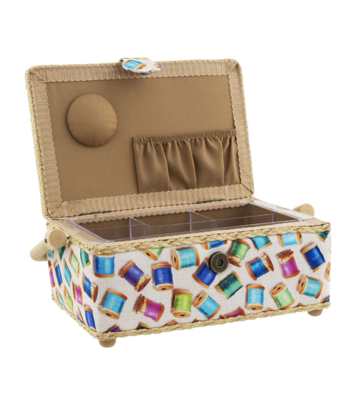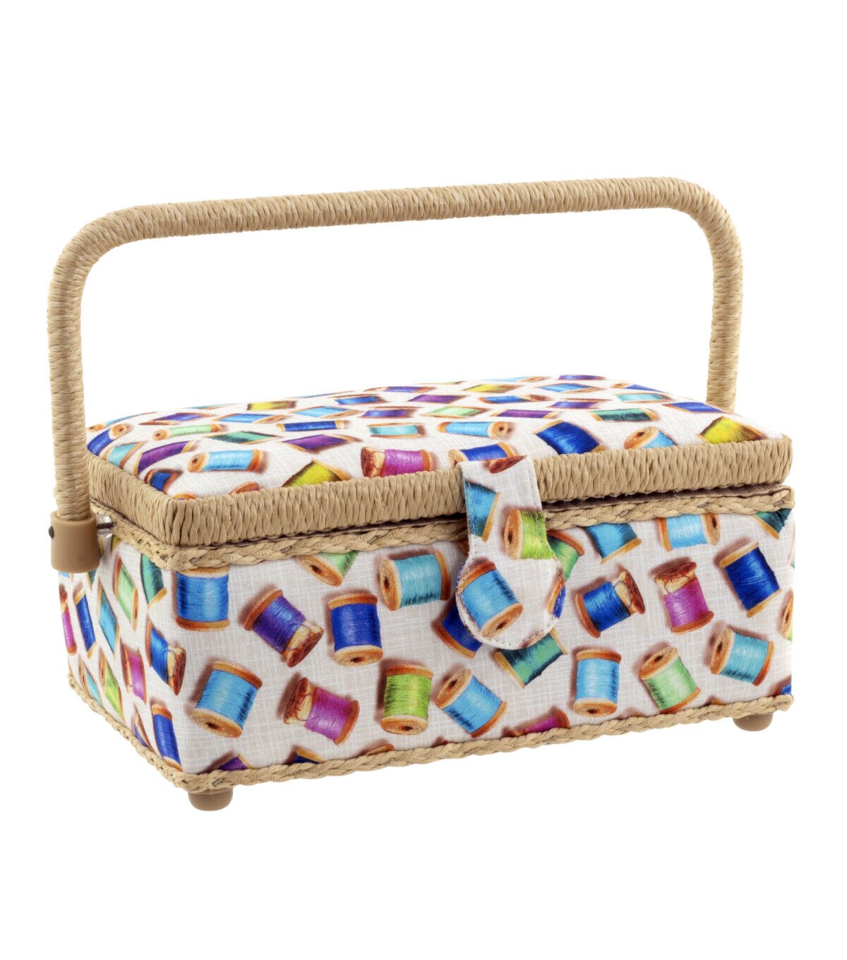 A Dritz sewing basket is an attractive, portable solution for storing and organizing your essential sewing and mending supplies. The colorful thread spool print will brighten up any sewing or crafting space. Trimmed with beige cording. A handy size basket for basic sewing supplies.