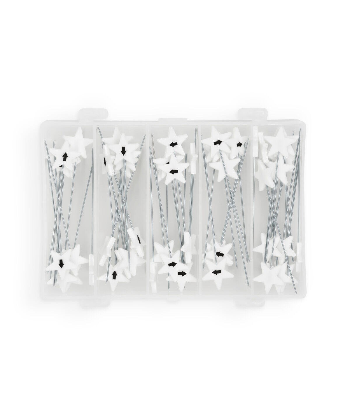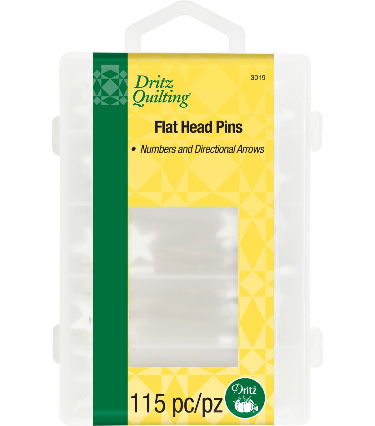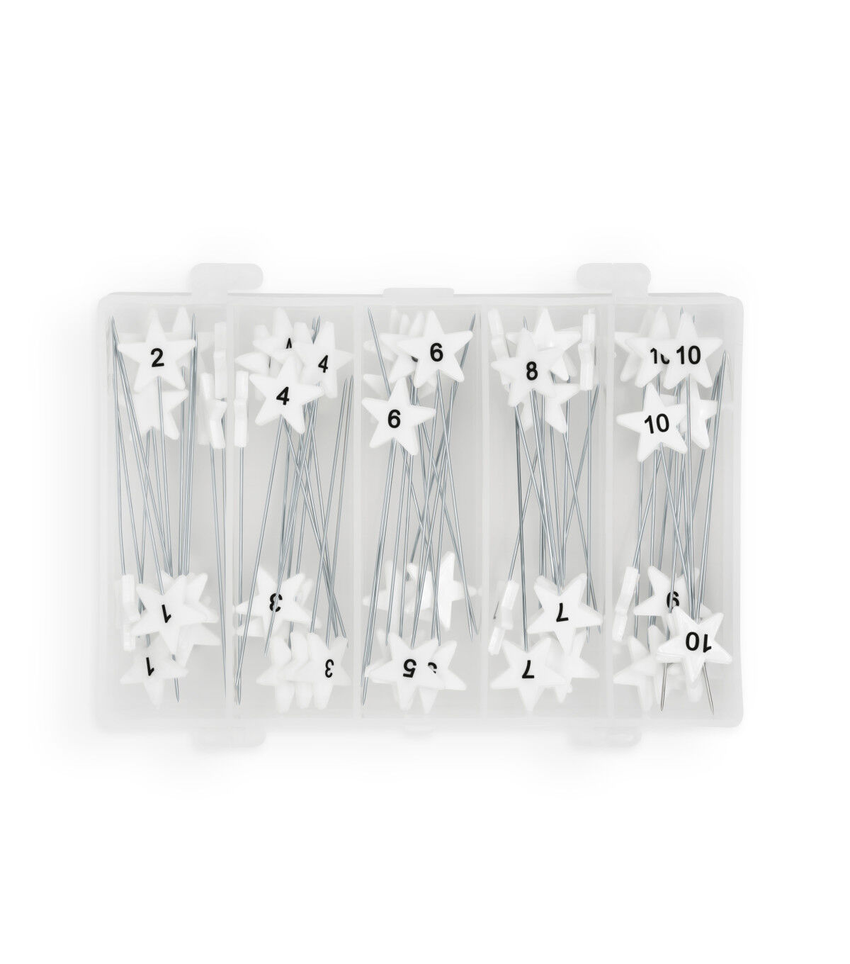 Easily hold stacks of fabric together with the Dritz Flat Star Head Pins - White. Use the numbered pins to keep strips or blocks together and the longer pins with larger heads to sort multiple layers. This pack contains 60 numbered pins from one to ten with six of each number, 40 directional pins with 10 of each direction and 15 blank pins. They come in a 4.5 x 3 x 1.25-inch plastic case.