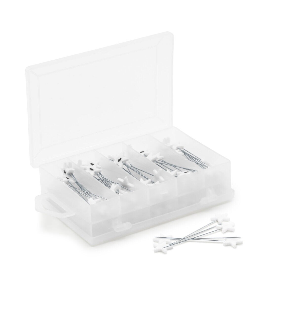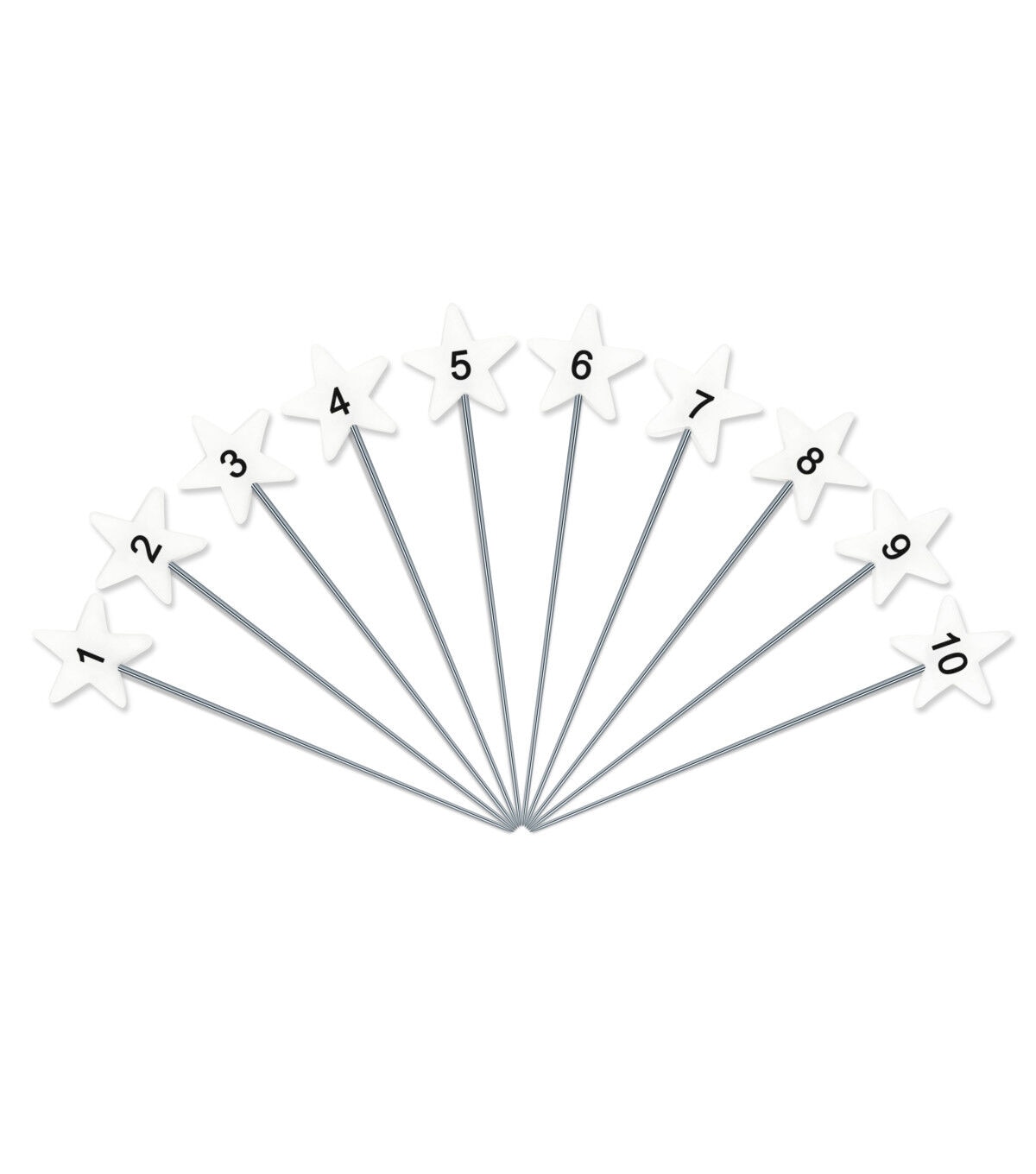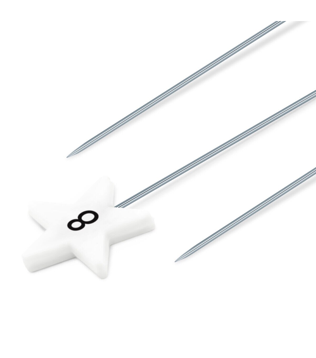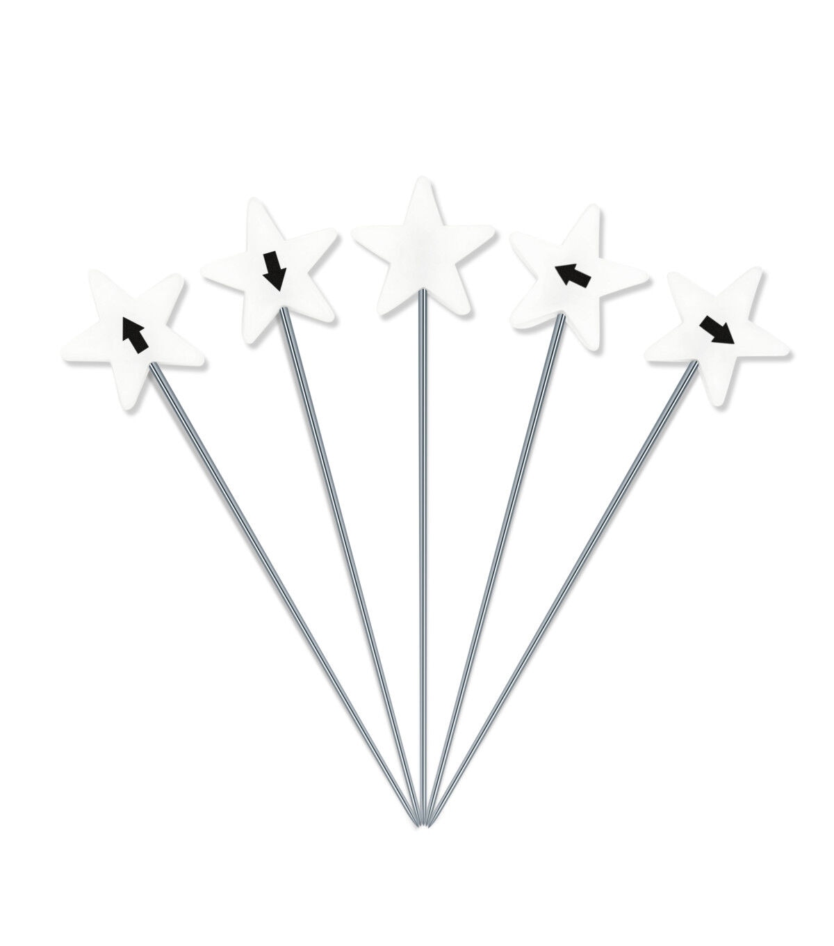 Easily hold stacks of fabric together with the Dritz Flat Star Head Pins - White. Use the numbered pins to keep strips or blocks together and the longer pins with larger heads to sort multiple layers. This pack contains 60 numbered pins from one to ten with six of each number, 40 directional pins with 10 of each direction and 15 blank pins. They come in a 4.5 x 3 x 1.25-inch plastic case.