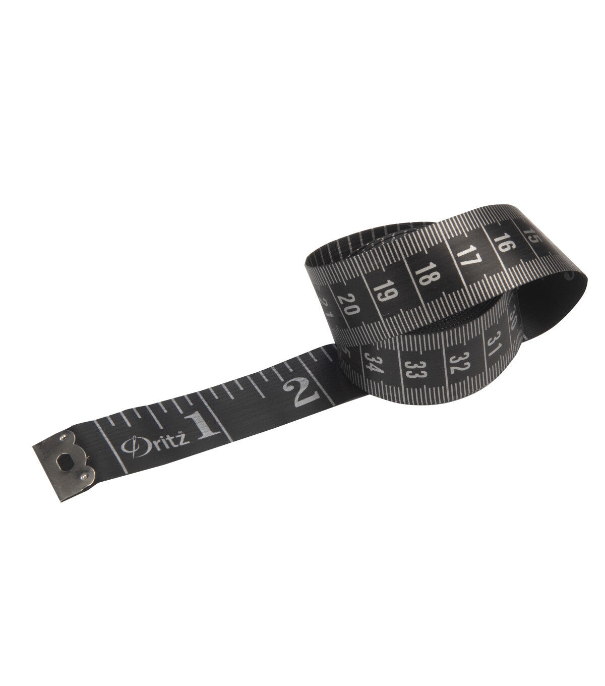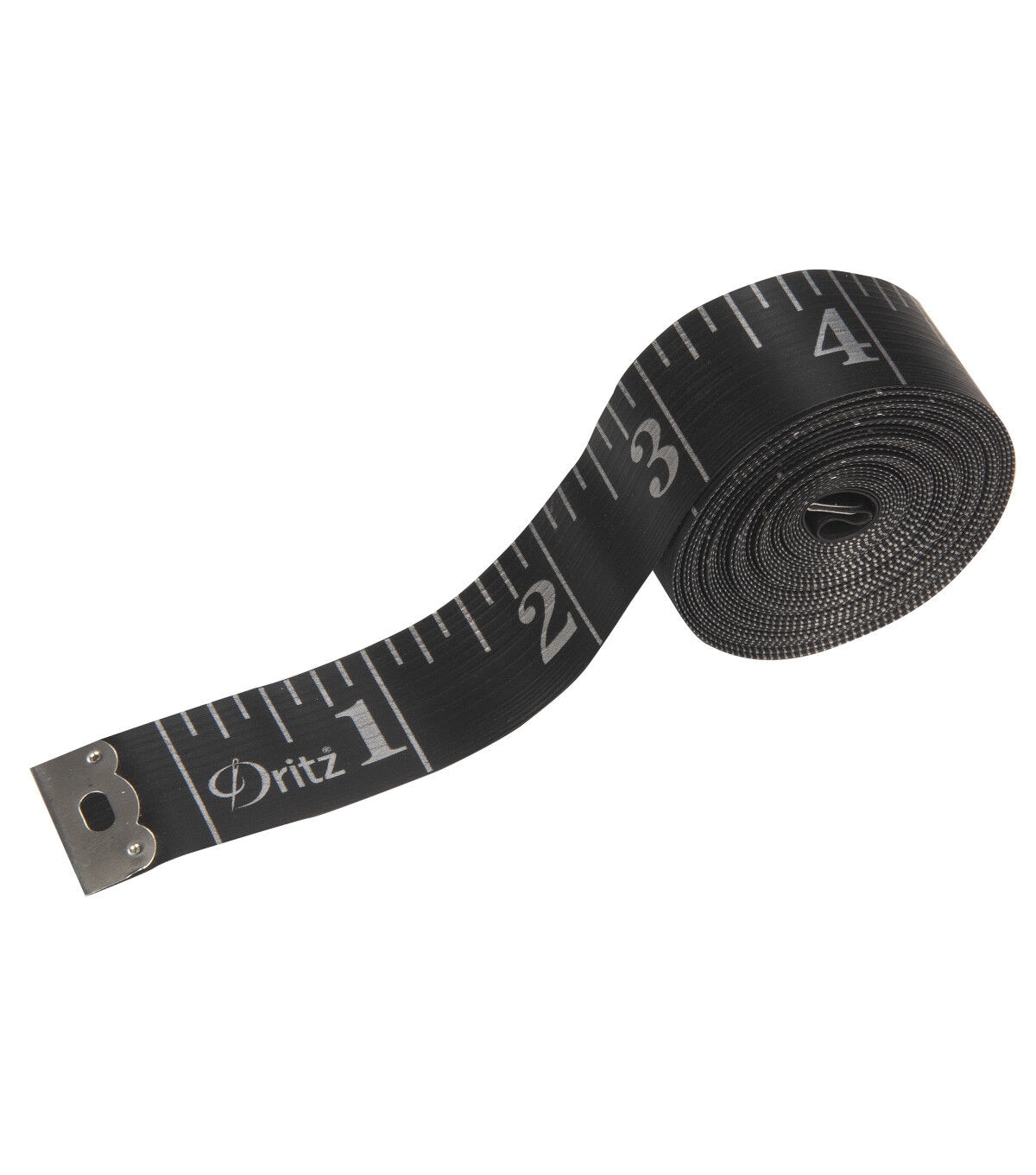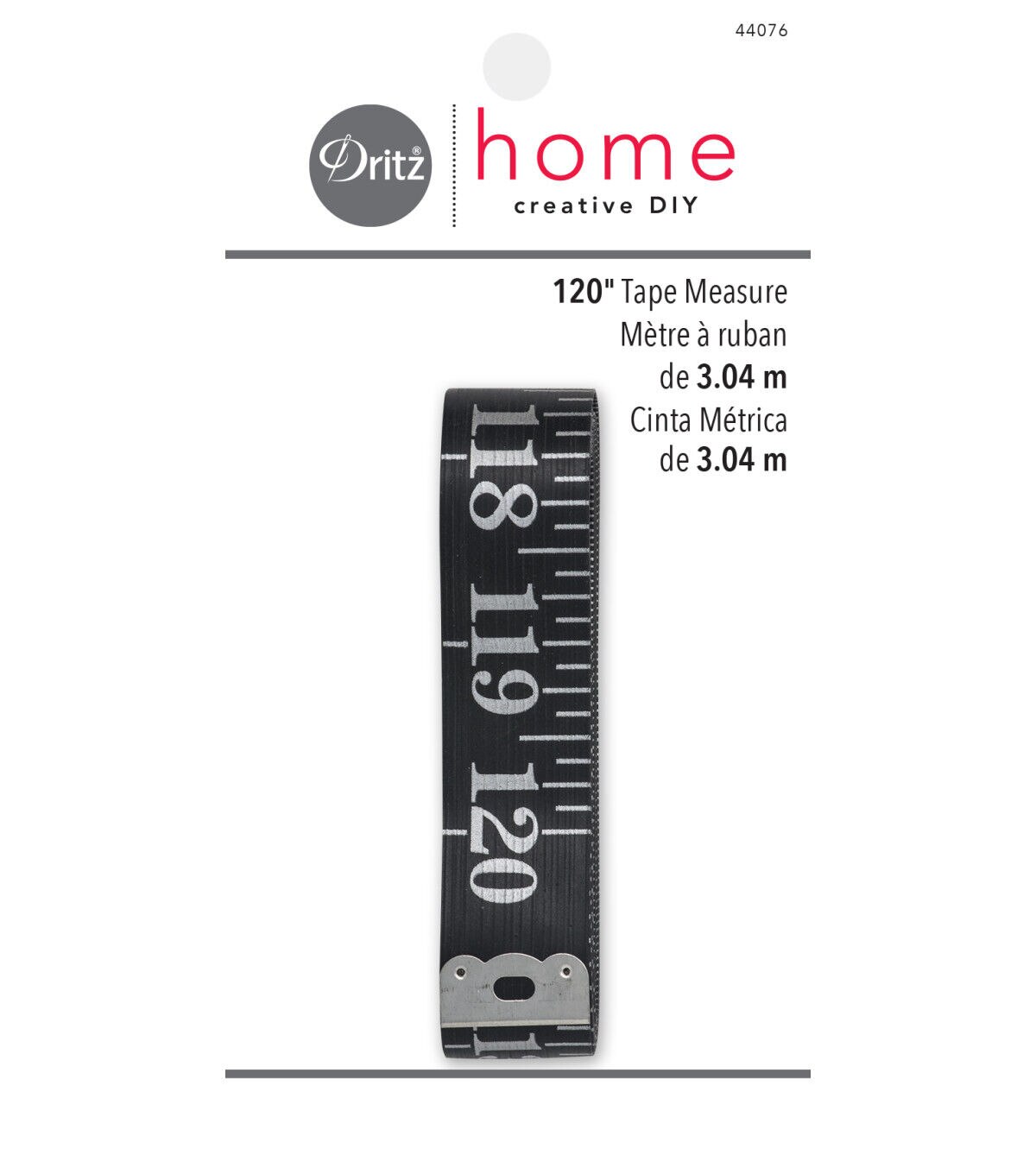 The Dritz Home Tape Measure - Black will be a valuable addition to your measuring tape collection. This measuring tape is 120 inches long with large clear inch markings on one side and metric markings on the reverse side. It flaunts a matte black shade with silver markings. Use this super-strong fiberglass tape to complete your home decor projects with ease.