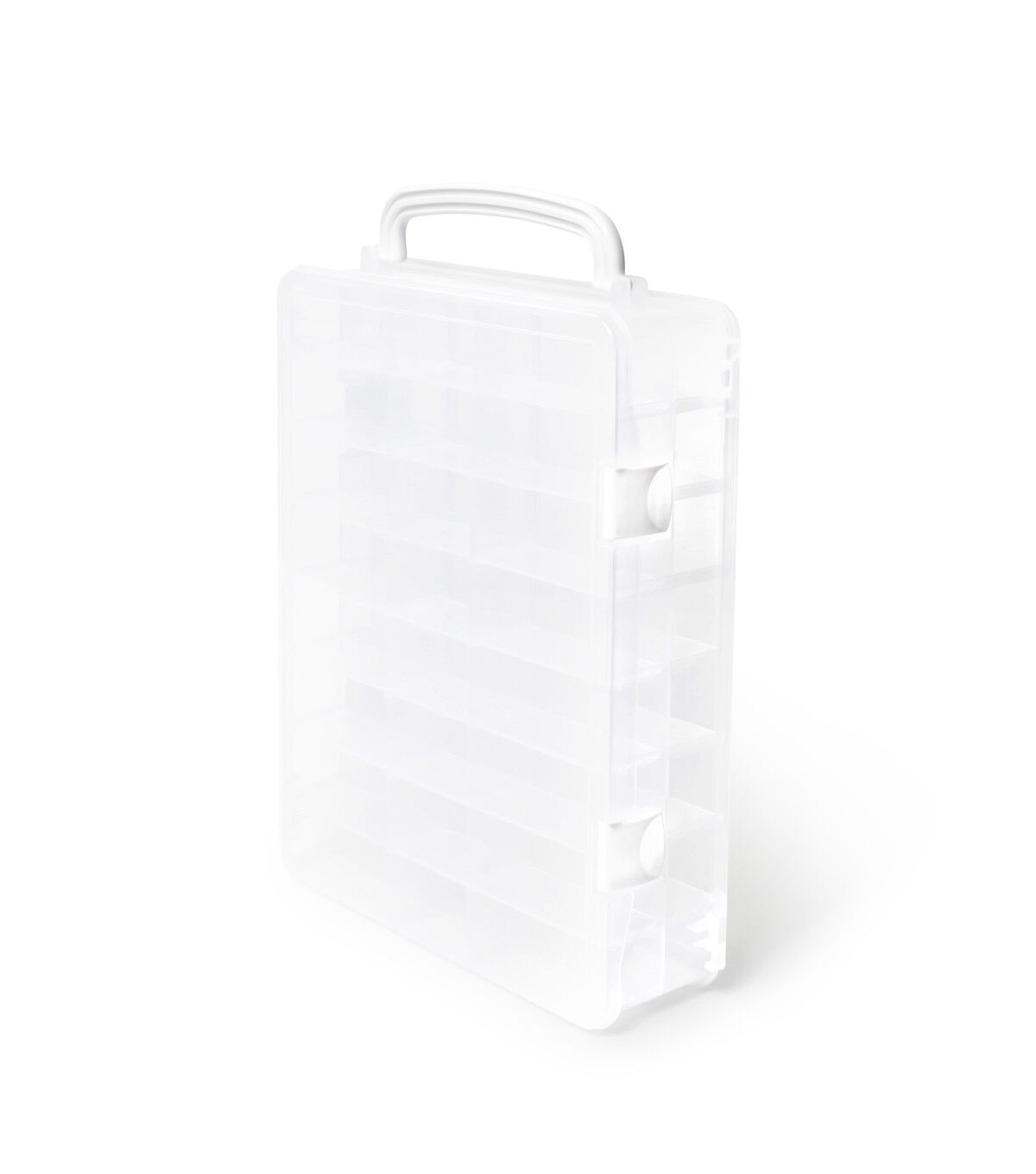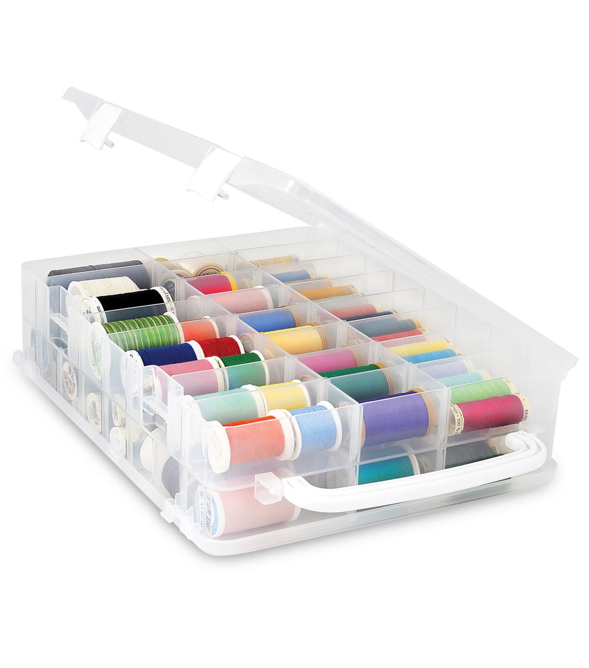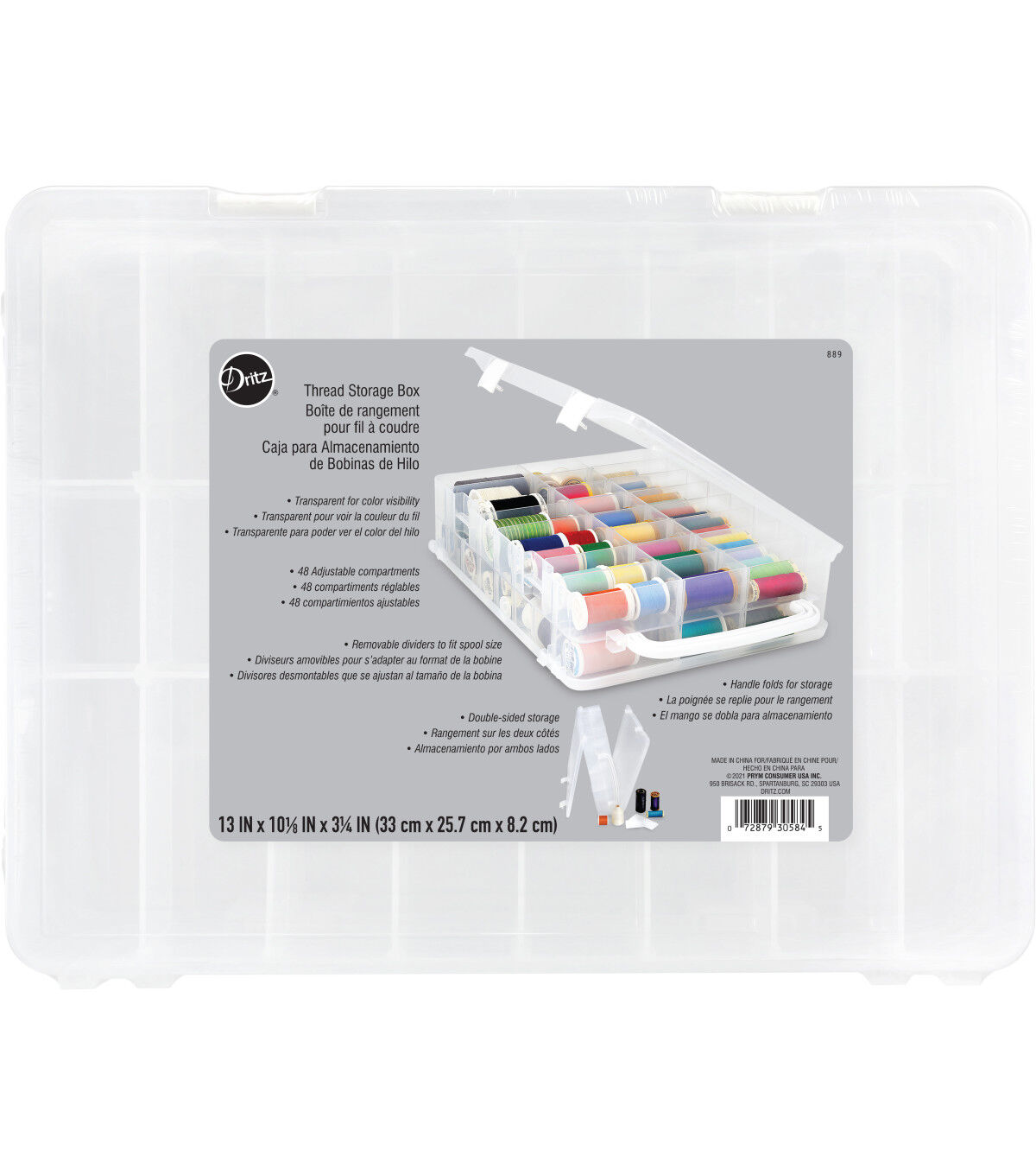 Keep your thread spools organized and dust-free in the Dritz Double-sided Thread Storage Box with 48 Compartments. With the removable dividers, you can easily store different types and sizes of thread spools in this sturdy box. It is designed with a handle for easy carrying and folds down for compact storage. This 13 x 10.12 x 3.25-inch storage box includes one double-sided box with four latches, one handle, 48 compartments and 42 removable dividers.