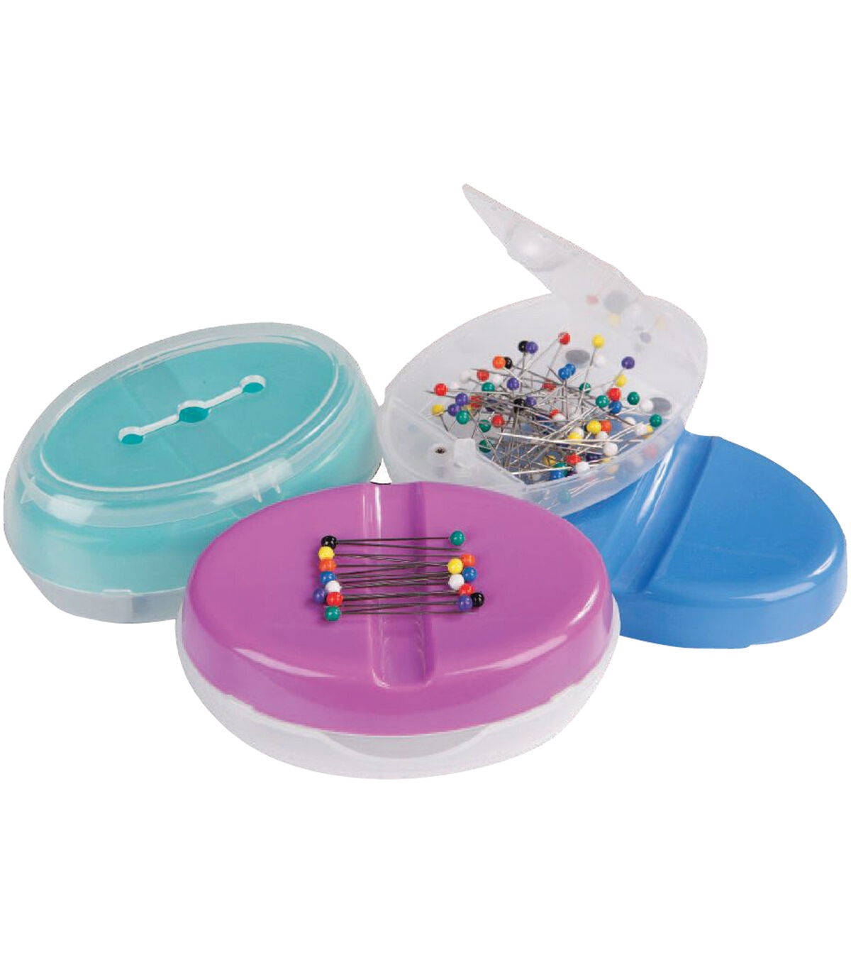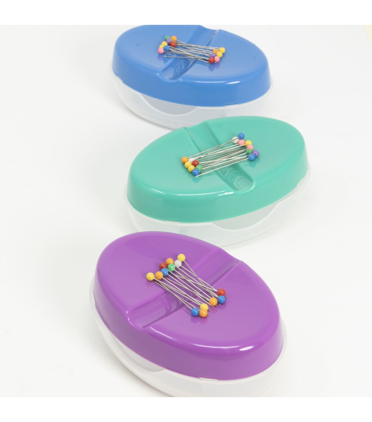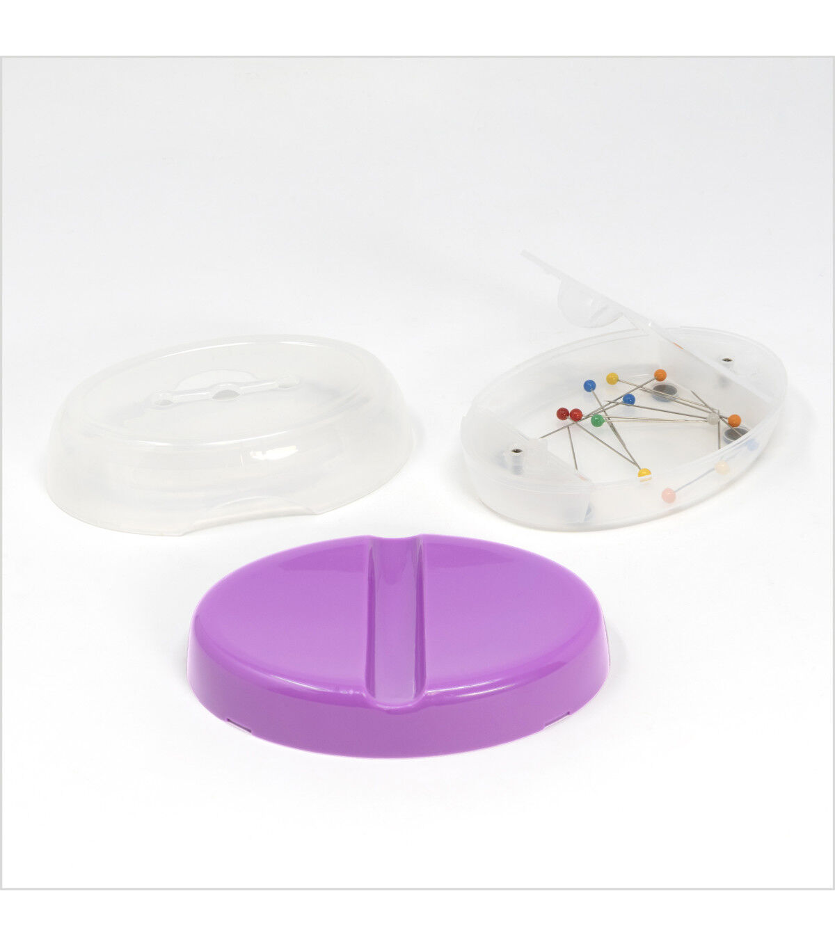 Bring home the Dritz Ultimate Magnetic Pin Caddy with Ball Pins and use it to store all of your pins. The top half of this caddy is a magnetic dish that is designed with a groove in the center to easily grasp pins without getting poked. Covering it is a transparent lid with a slot for pins to be slid through without having to remove the cover and can be nested under the caddy when not in use. A removable clear plastic bottom half can be used to store extra pins and needles. This caddy comes with a flip-top lid and four non-skid pads on the bottom and measures 4.25 x 2.87 x 1.75 inches. 15 ball pins are also included in this pack.