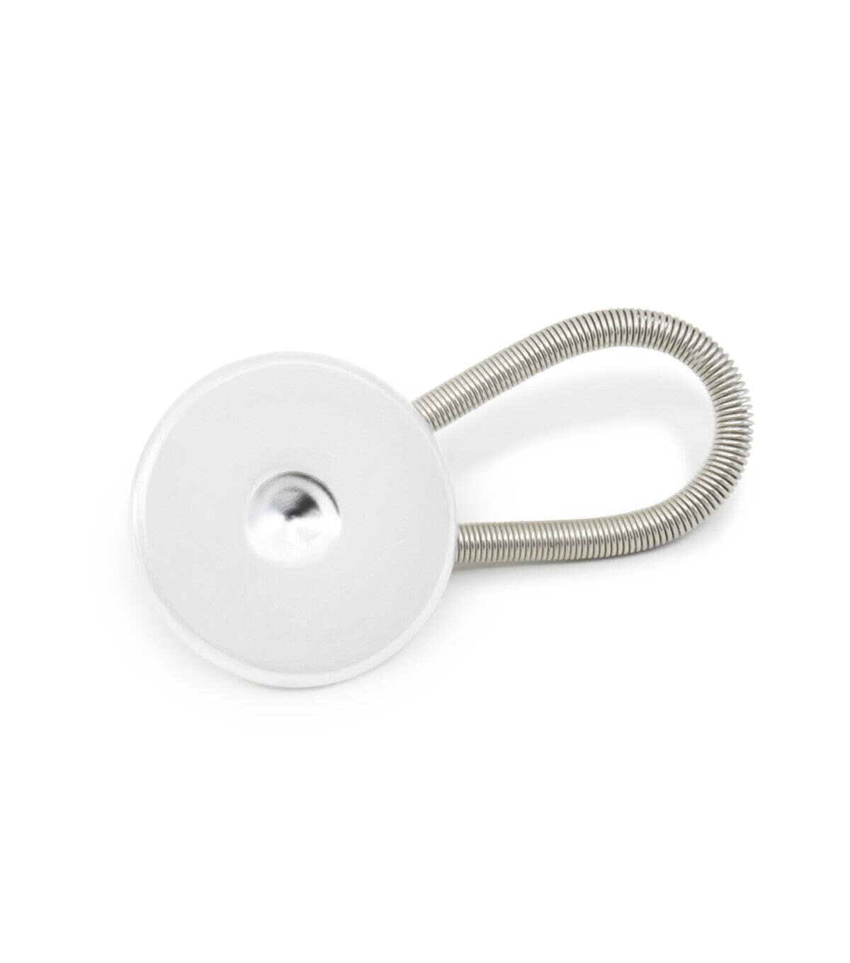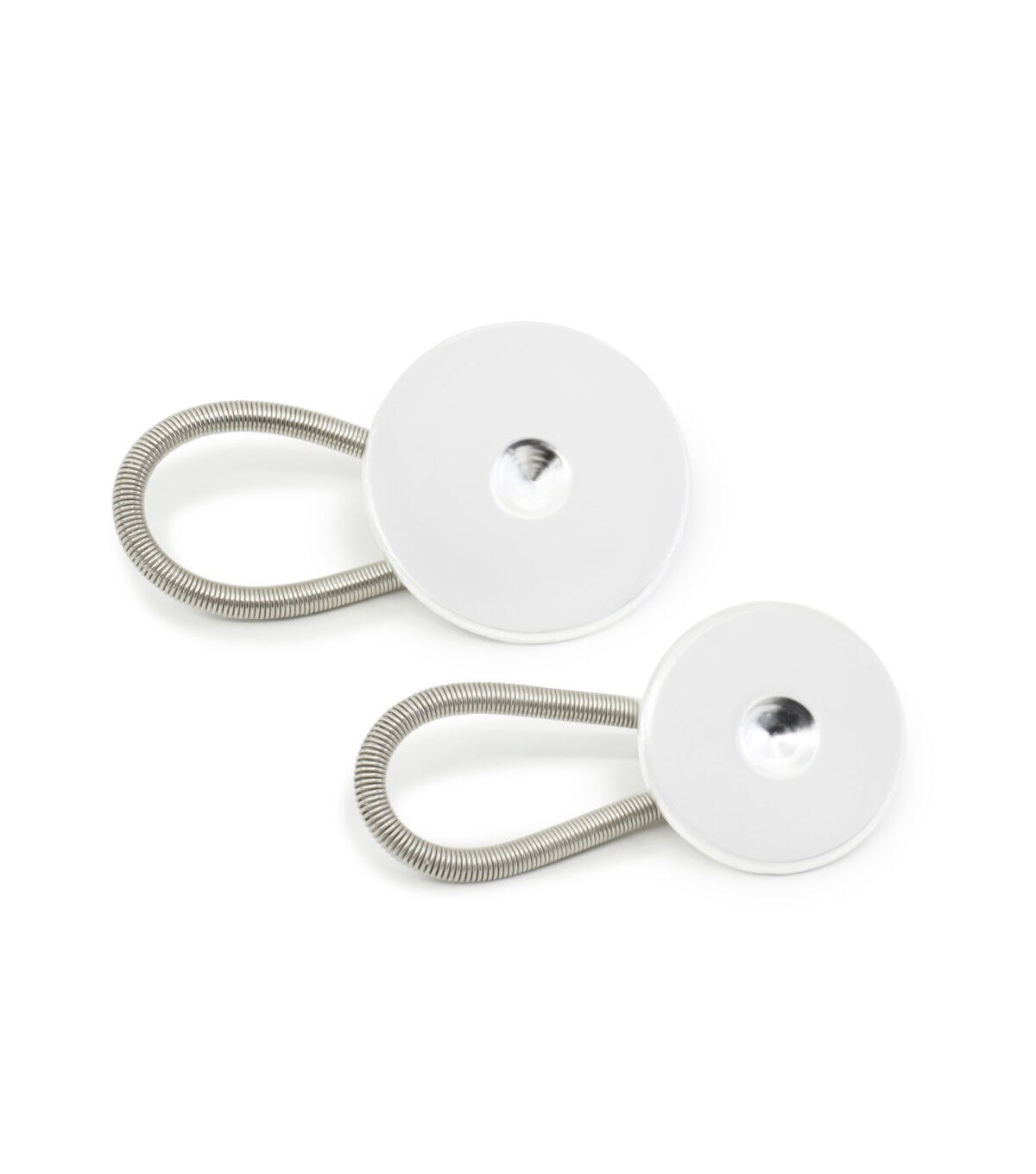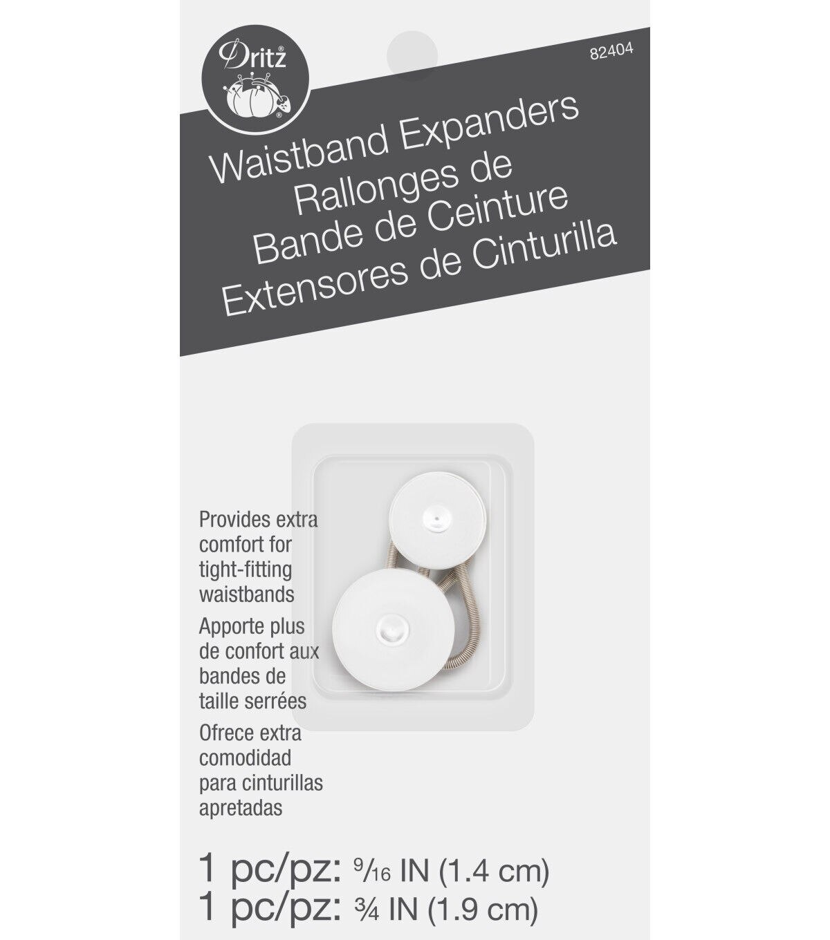 The Dritz Waistband Button Expanders - White & Silver offer extra comfort for tight-fitting waistbands. This pack contains two waistband expanders that are crafted with buttons and spring loops. All you have to do is take the spring loop around the existing button of your jeans, pant or skirt and push the expander button through the buttonhole.