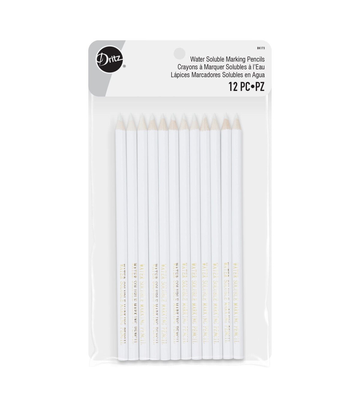 The Dritz Water-soluble Marking Pencils - White are just what you need for marking pleats, buttonholes and darts. They are also great for transferring pattern markings and can be used in other sewing and quilting projects. Markings made with them can be easily removed with a damp cloth. This pack includes 12 sharpened white pencils made with water-soluble lead. Do not press over the marks before they are removed. You can also use them for making sewing kits for students or for sharing with a group of sewing and crafting enthusiasts.